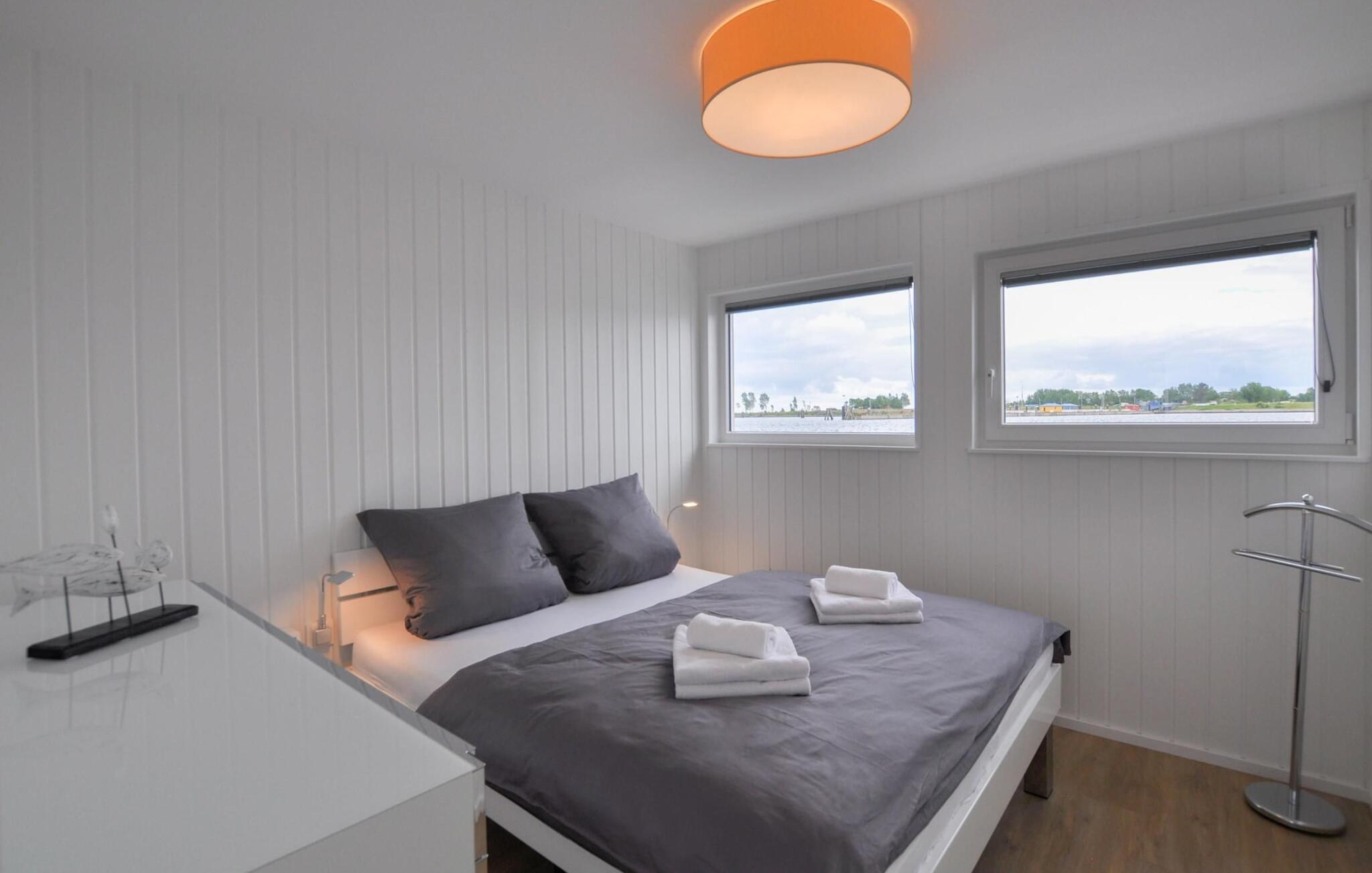 To soverom har plass til fire voksne. I hovedsoverommet åpner gulv-til-tak-vinduer opp for nye perspektiver med vannet som bakteppe. En annen flatskjerm-TV sørger for ekstra underholdning. Huset kan nås fra alle sider via en terrassedør.