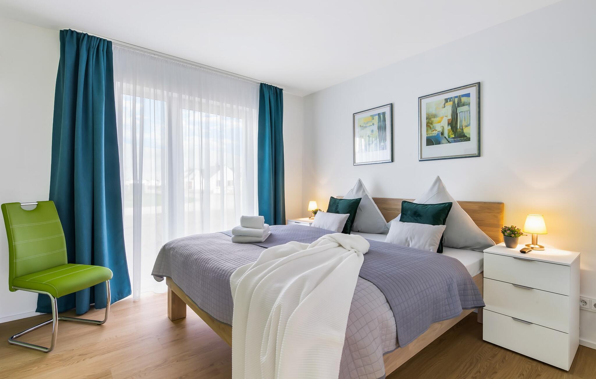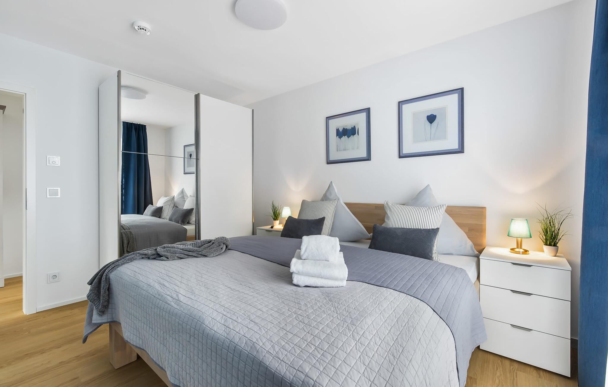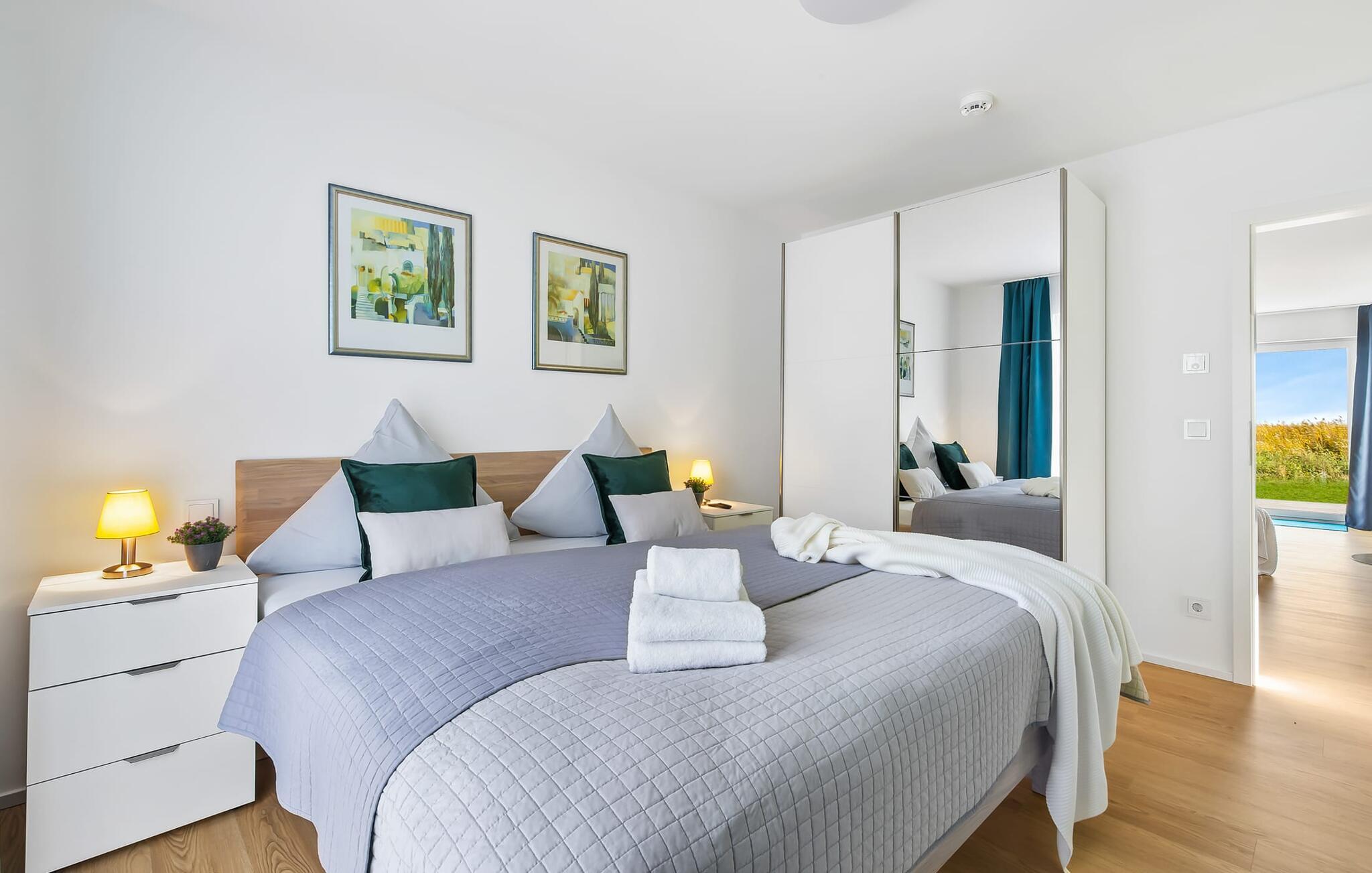 De to soverommene, hvert med dobbeltseng og TV, har også vinduer fra gulv til tak. Å sovne og våkne opp i denne atmosfæren er ren avslapning, spesielt siden sengene er i en behagelig høyde. Ved behov er det også en barneseng tilgjengelig for de minste, som også kan settes opp på foreldrenes soverom. Et sammenleggbart stellebord gjør det lettere å stelle babyen.