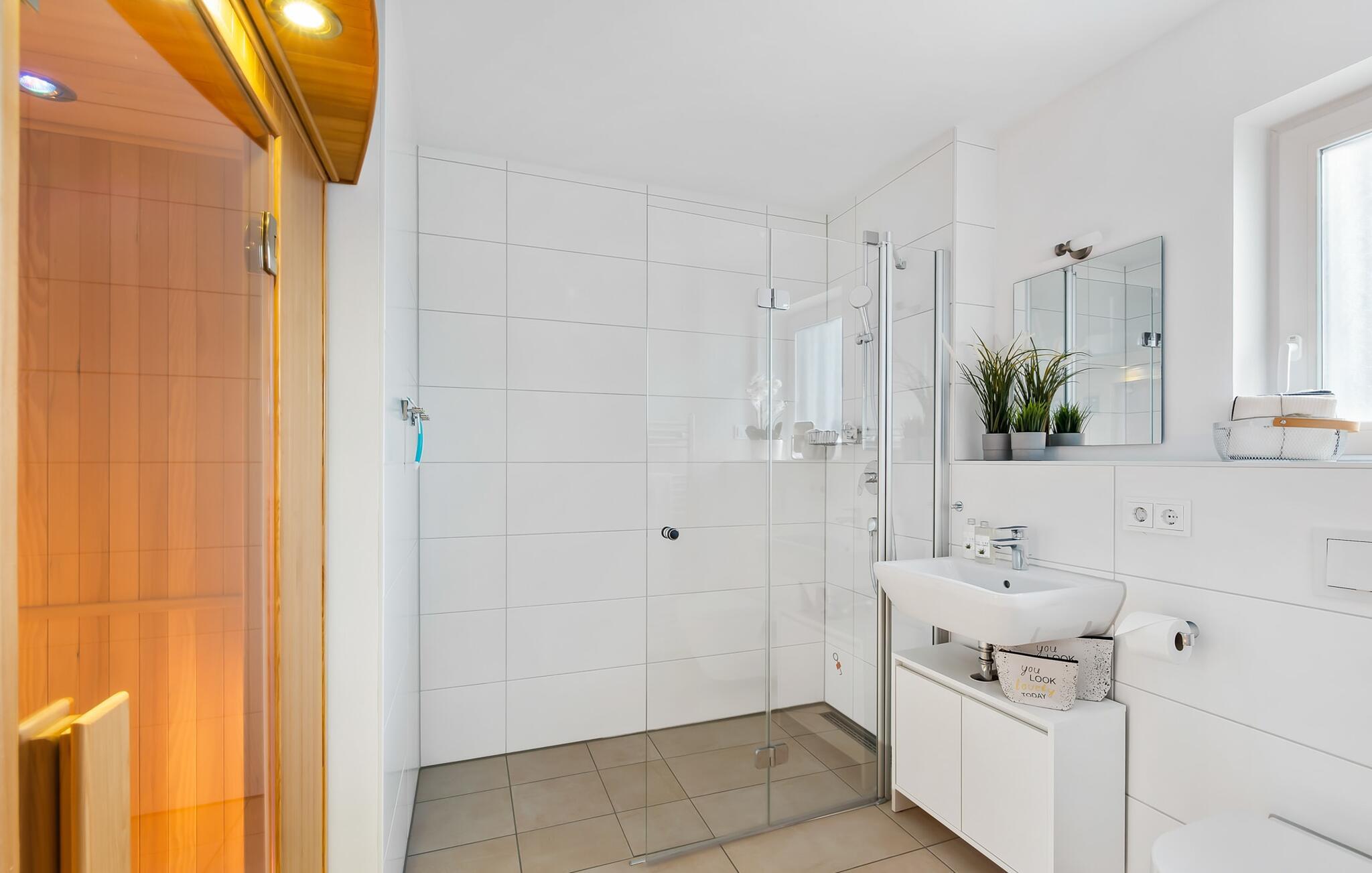 Det lyse badet med stort vindu lover også avslapping. Her kan gjestene skjemmes bort med en gulv-til-tak-dusj og en infrarød badstue. Det er også et babybadekar for de minste. En dusjstol er også tilgjengelig i feriehuset.