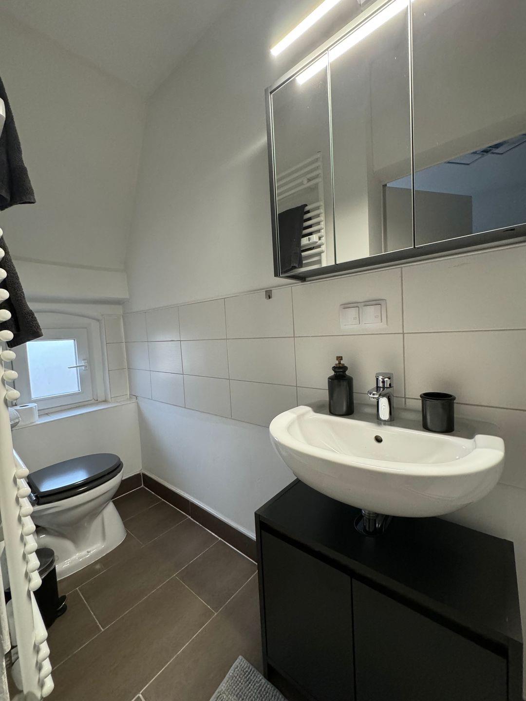 Das moderne Badezimmer bietet eine Dusche, Waschbecken, WC, Spiegel und Haartrockner. Bettwäsche und Handtücher werden Ihnen selbstverständlich zur Verfügung gestellt.