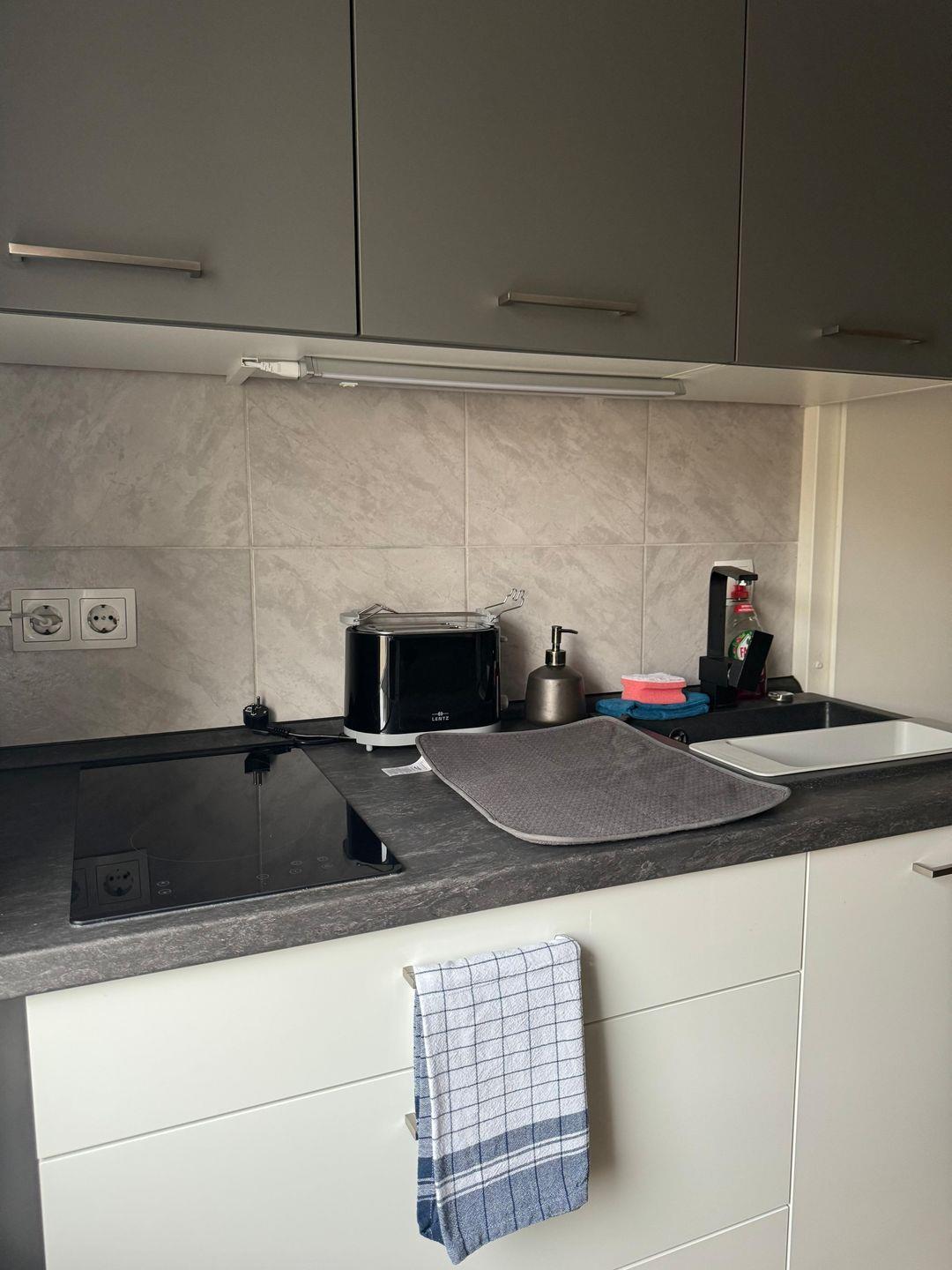 Die Küche mit Esstisch ermöglicht Ihnen eine unabhängige Selbstversorgung. Sie ist vollständig ausgestattet mit einem Elektroherd inklusive Backofen, Kühlschrank, Wasserkocher, Kaffeemaschine, Toaster sowie Geschirr, Besteck, Küchenutensilien und Geschirrhandtüchern. Damit können Sie auch während Ihres Aufenthaltes problemlos eigene Mahlzeiten zubereiten.