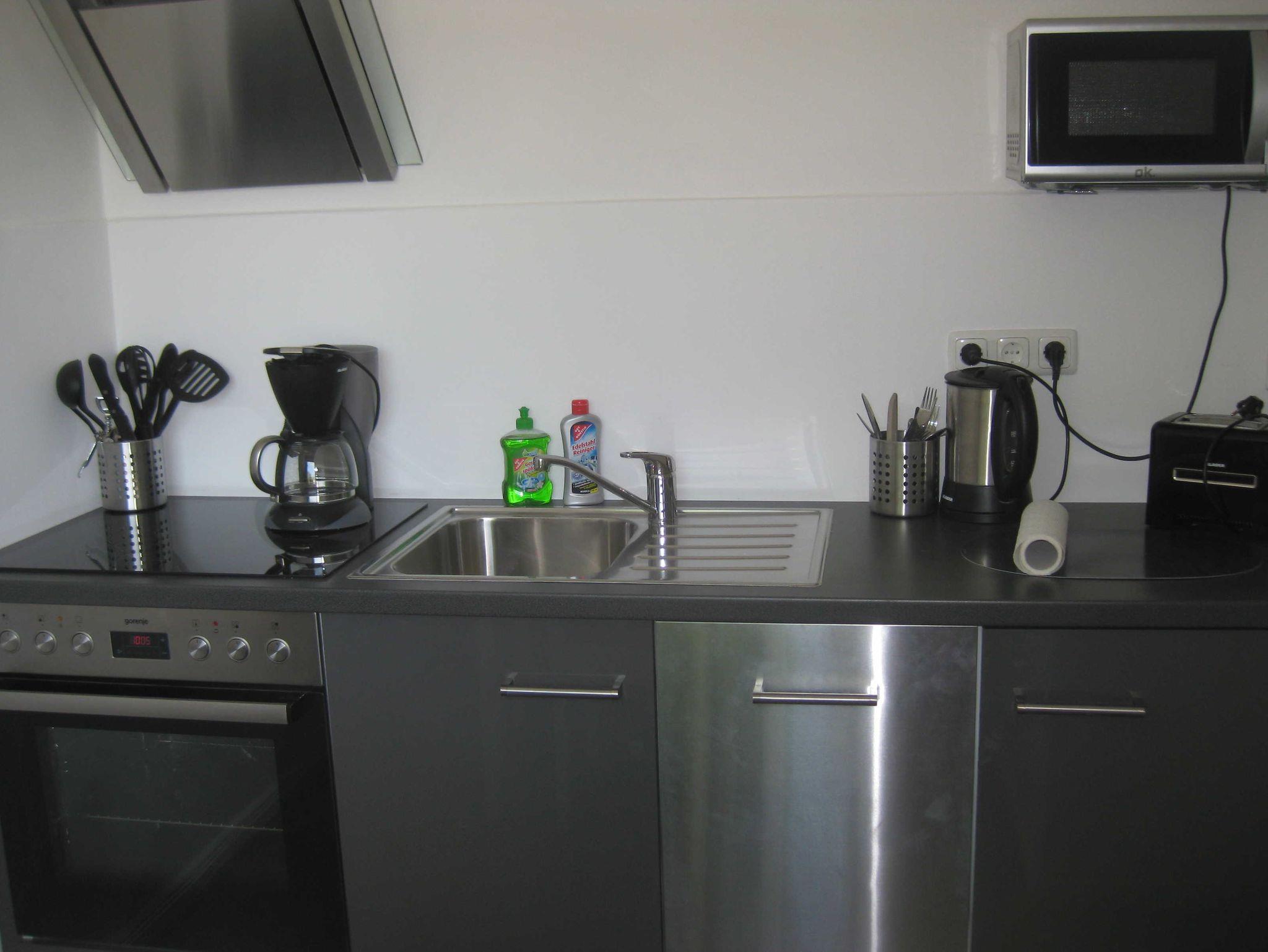 Die Küche ist voll ausgestattet mit Geschirr, Gläsern, Töpfen, Besteck, Kaffeemaschine, Toaster und Wasserkocher.