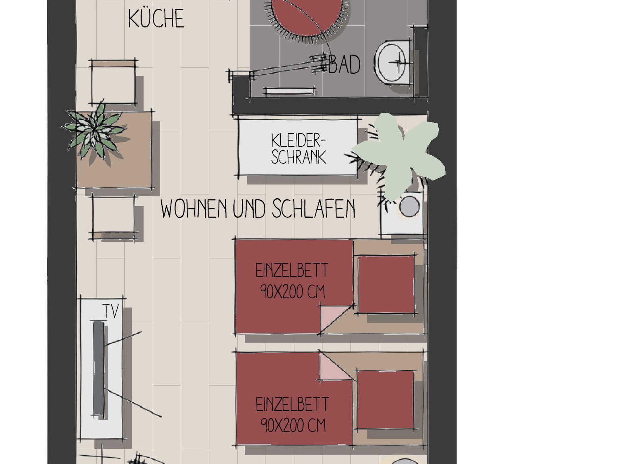 In der Wohnung H7 befinden sich zwei Einzelbetten (90 cm x 200 cm), die man zusammenstellen kann, ein hochwertiges Granit- Duschbad, eine Einbauküche und ein Essplatz für 2 Personen.