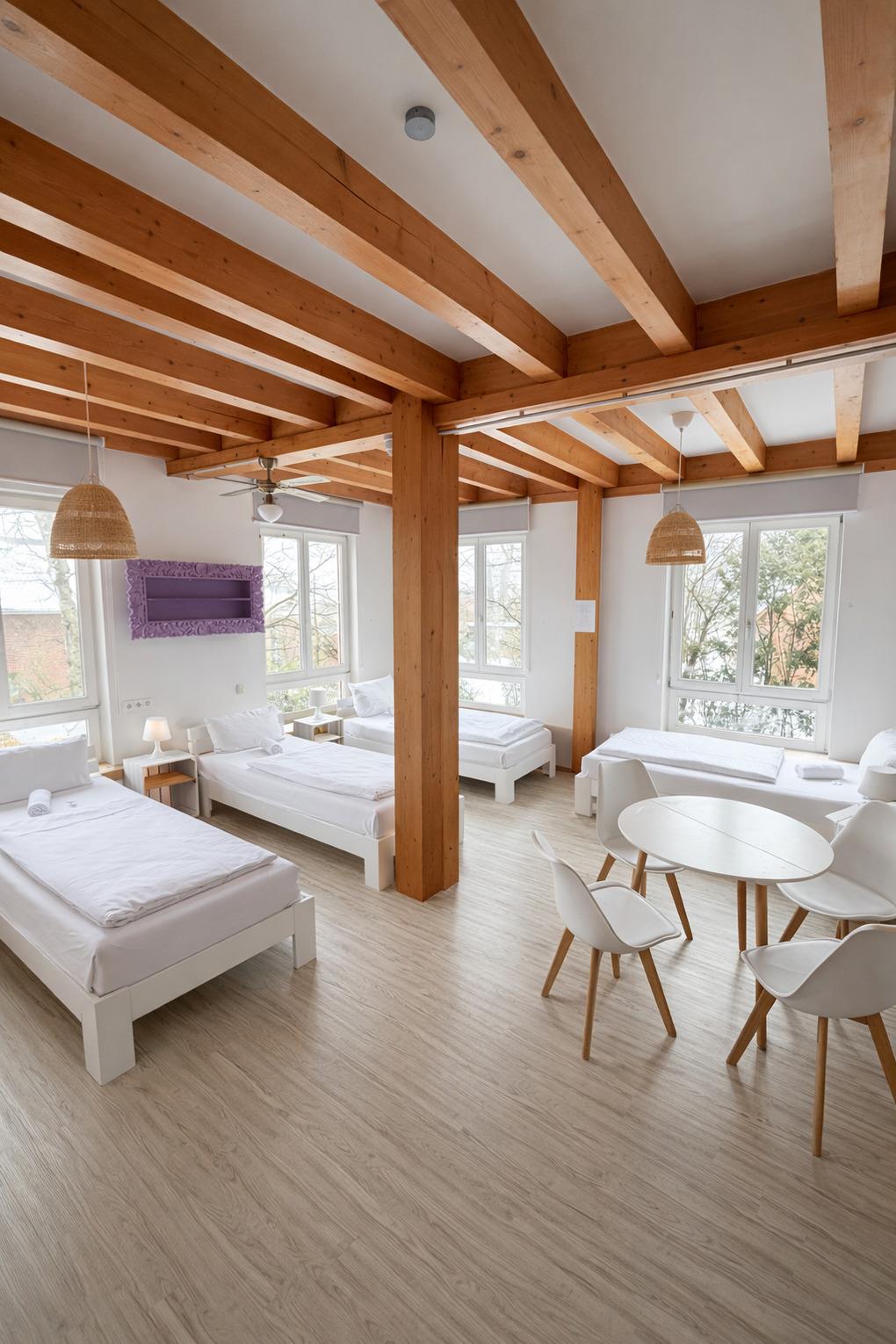 Unser Familienzimmer bietet ausreichend Platz für vier Personen und verbindet Komfort mit funktionaler Raumaufteilung. Mehrere hochwertige Schlafplätze, klare Gestaltung und eine angenehme Atmosphäre machen das Zimmer ideal für Familien, Freundesgruppen oder kleine Reisegruppen. Durch die ruhige Lage des Hauses und die direkte Nähe zur U-Bahn lässt sich Hamburg bequem erkunden.