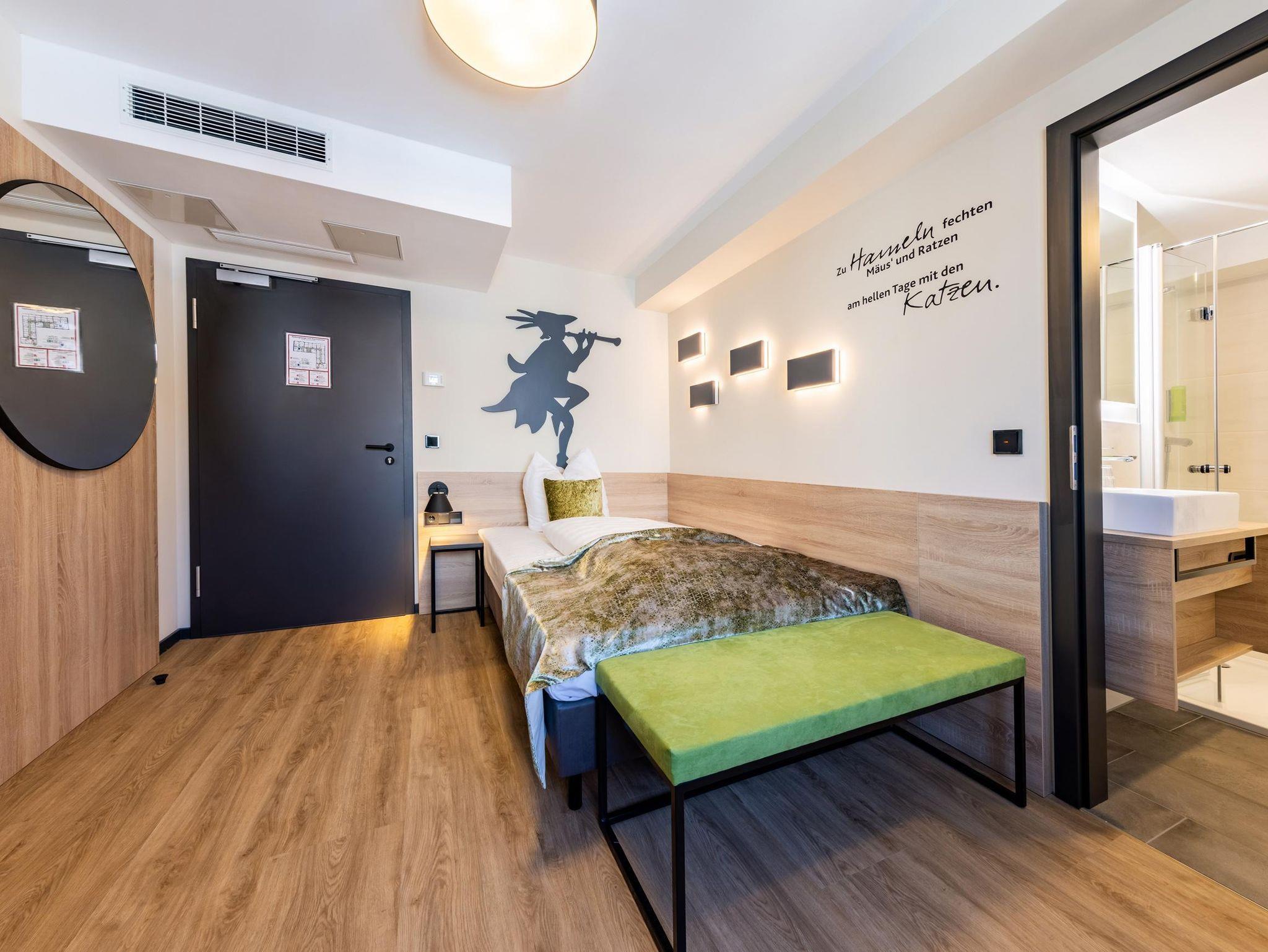 Mit vielen liebevollen Details haben wir die berühmte Rattenfängersage für Sie wieder aufleben lassen. Die Deluxe-Kategorie empfängt Sie mit einem gemütlichen Boxspringbett, einer Nespresso-Kaffeemaschine und Vorhängen zum Abdunkeln für die perfekte Nachtruhe. Unser Badezimmer ist mit einer großzügigen Ablagefläche ausgestattet.