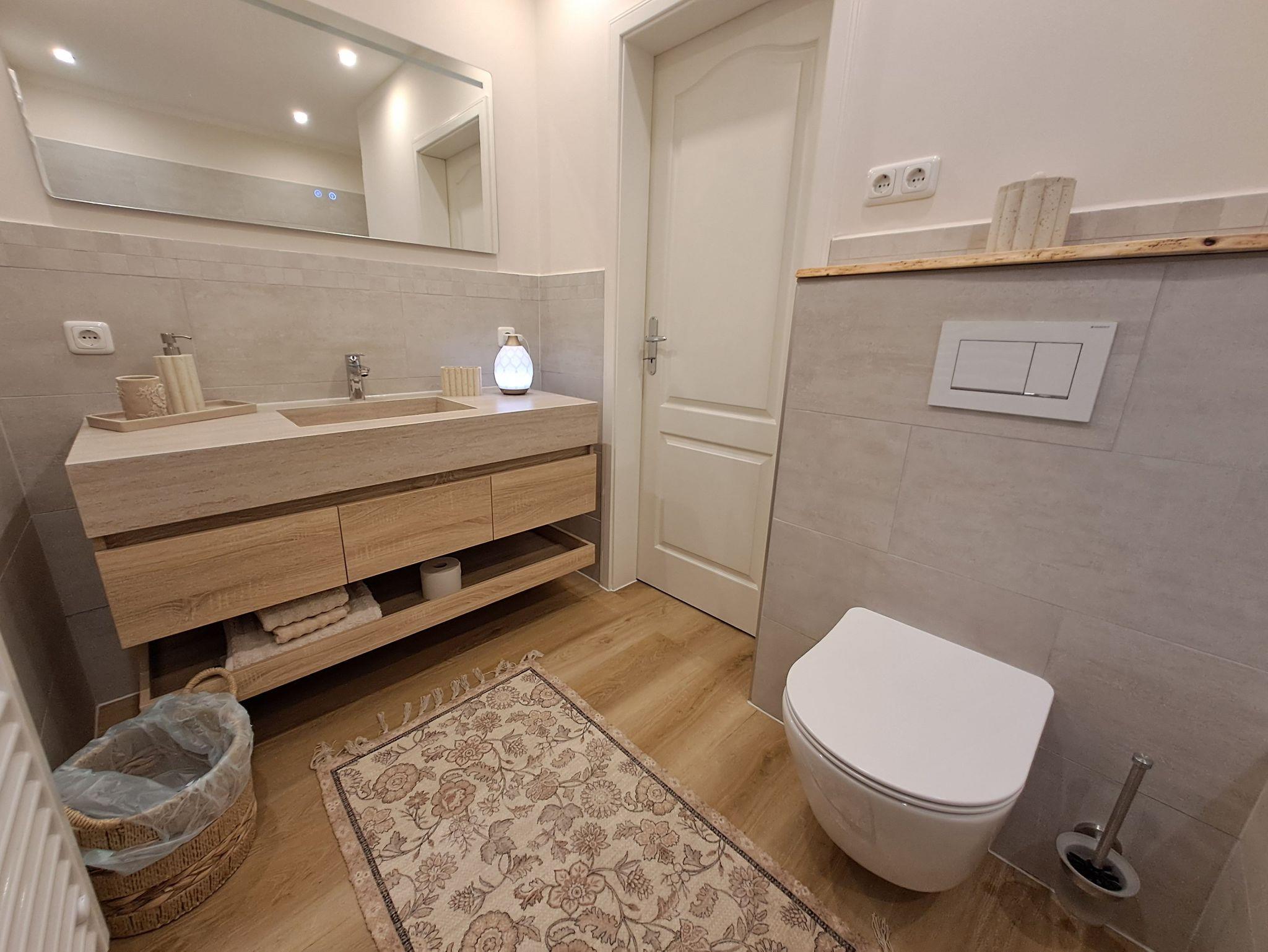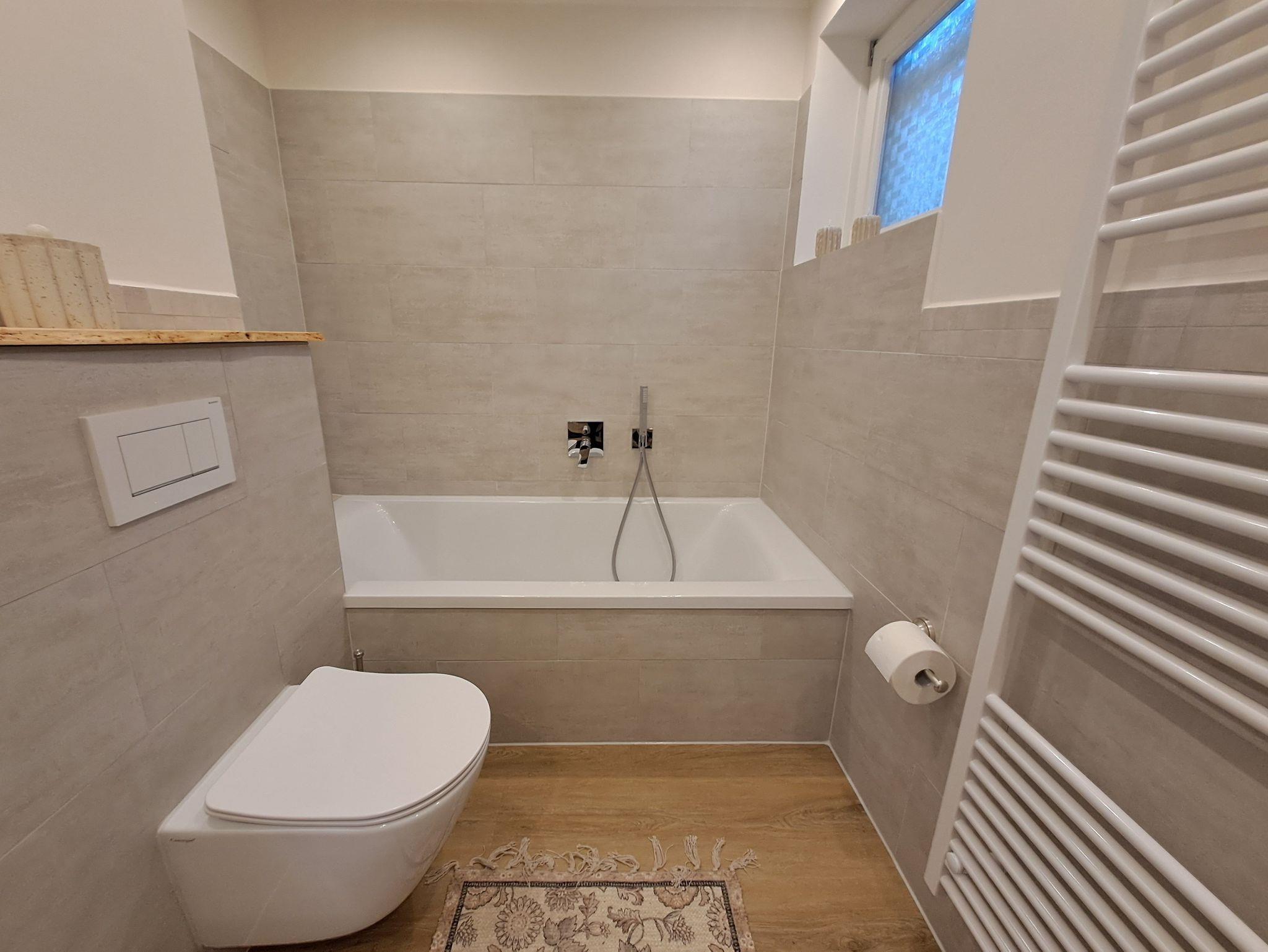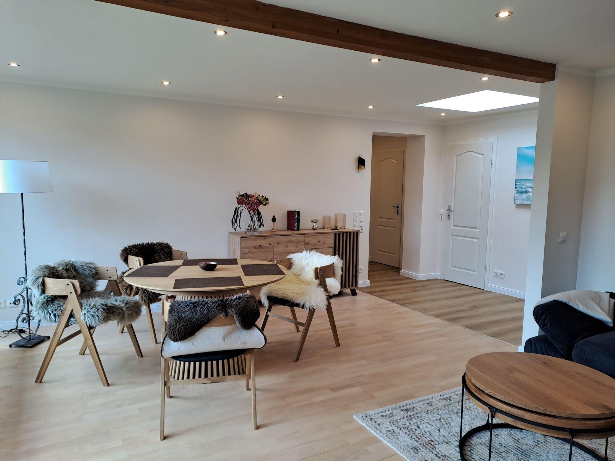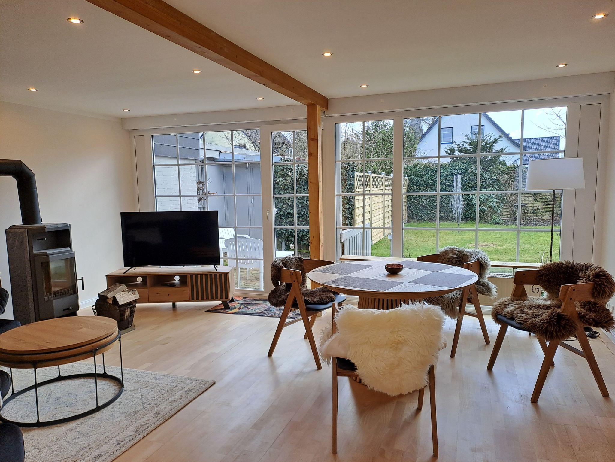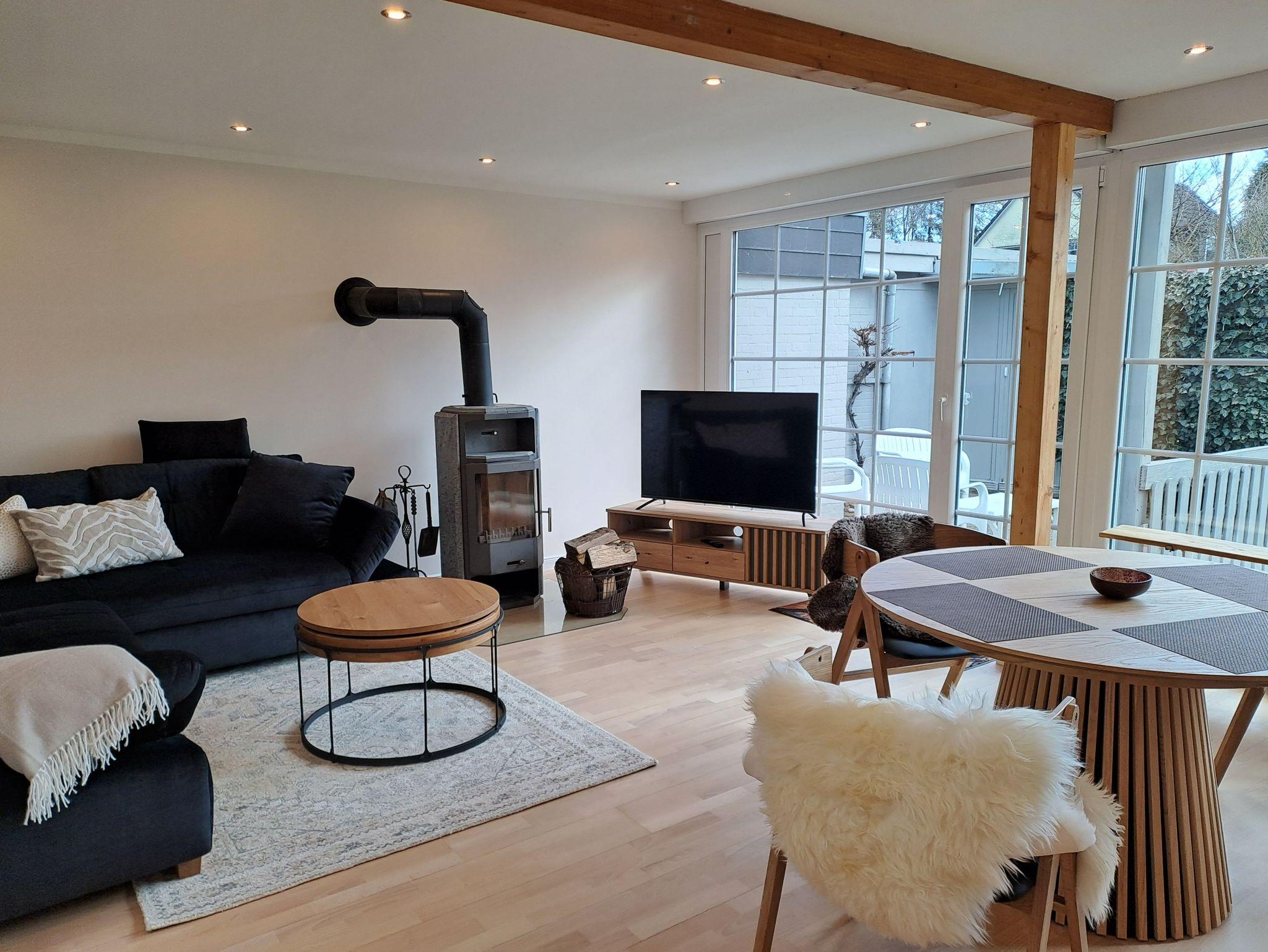 Über 80 qm erstrecken sich im Erdgeschoss das großzügige und durch viel Tageslicht einladende Wohn-/ und Esszimmer, ein Schlafzimmer mit Doppelbett, eine hübsche Einbauküche sowie ein Badezimmer mit Badewanne und ein zusätzliches Gäste-WC mit ebenerdiger Dusche. Sowohl vom Wohnzimmer, als auch vom Schlafzimmer aus, kann man auf die Sonnenterrasse mit ihren gemütlichen Sitzmöglichkeiten und Sonnenliegen gelangen. Der Garten ist rundherum eingezäunt. Ein Sonnensegel und eine Markise spenden im Sommer Schatten. Der vorhandene Gasgrill darf ebenfalls benutzt werden.