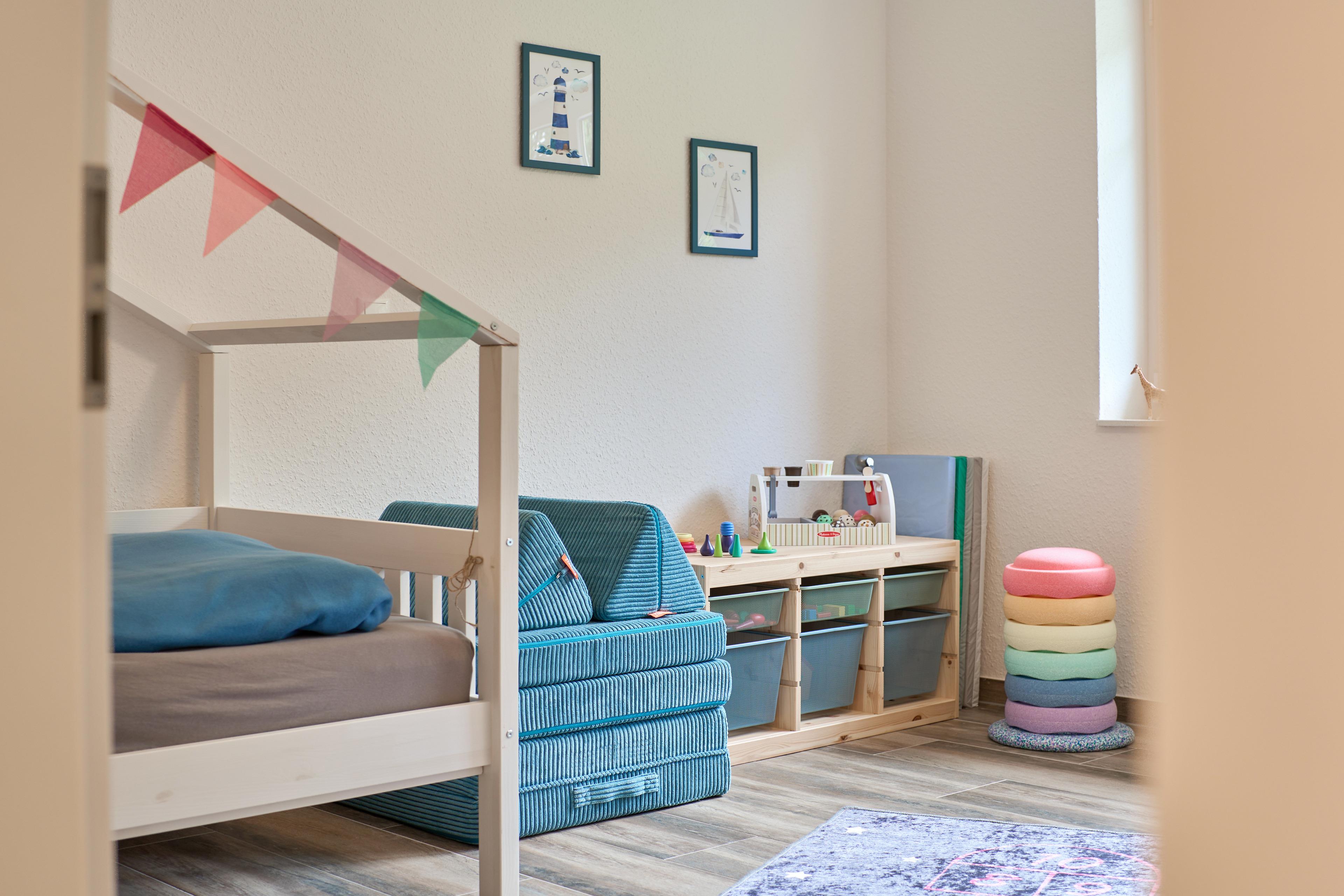 Dich erwartet in der Wohnung: Familienbett, Kinderzimmer mit Wickelkommode, hochwertiges Spielzeug, sehr gut ausgestattete Küche, Badezimmer mit Wellnessdusche & Badewanne, großer, eingezäunter Garten mit überdachter Terrasse.