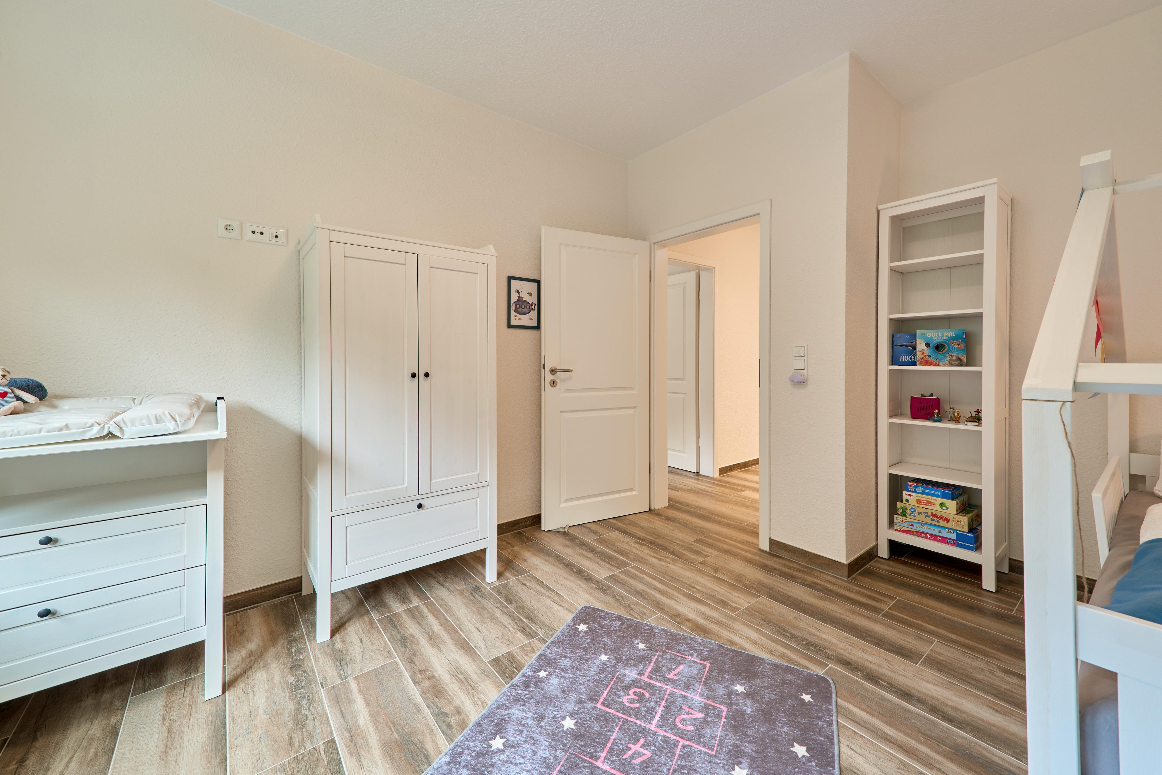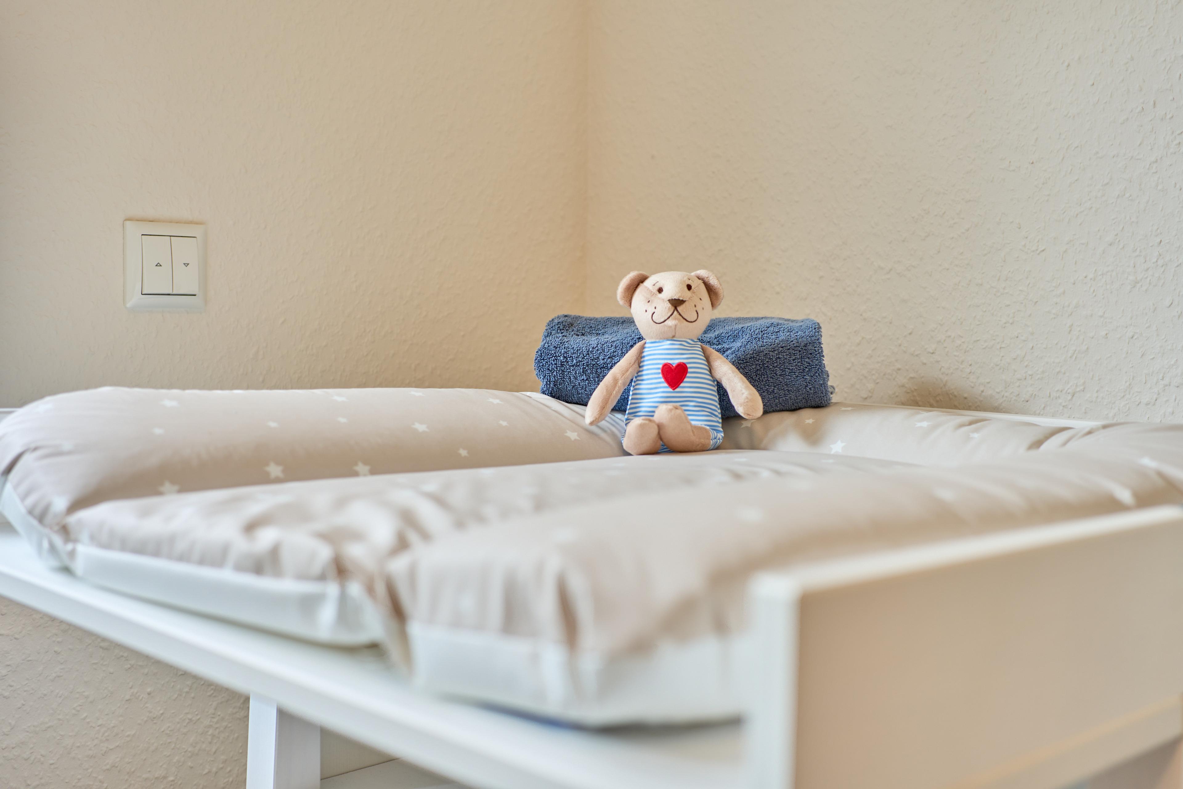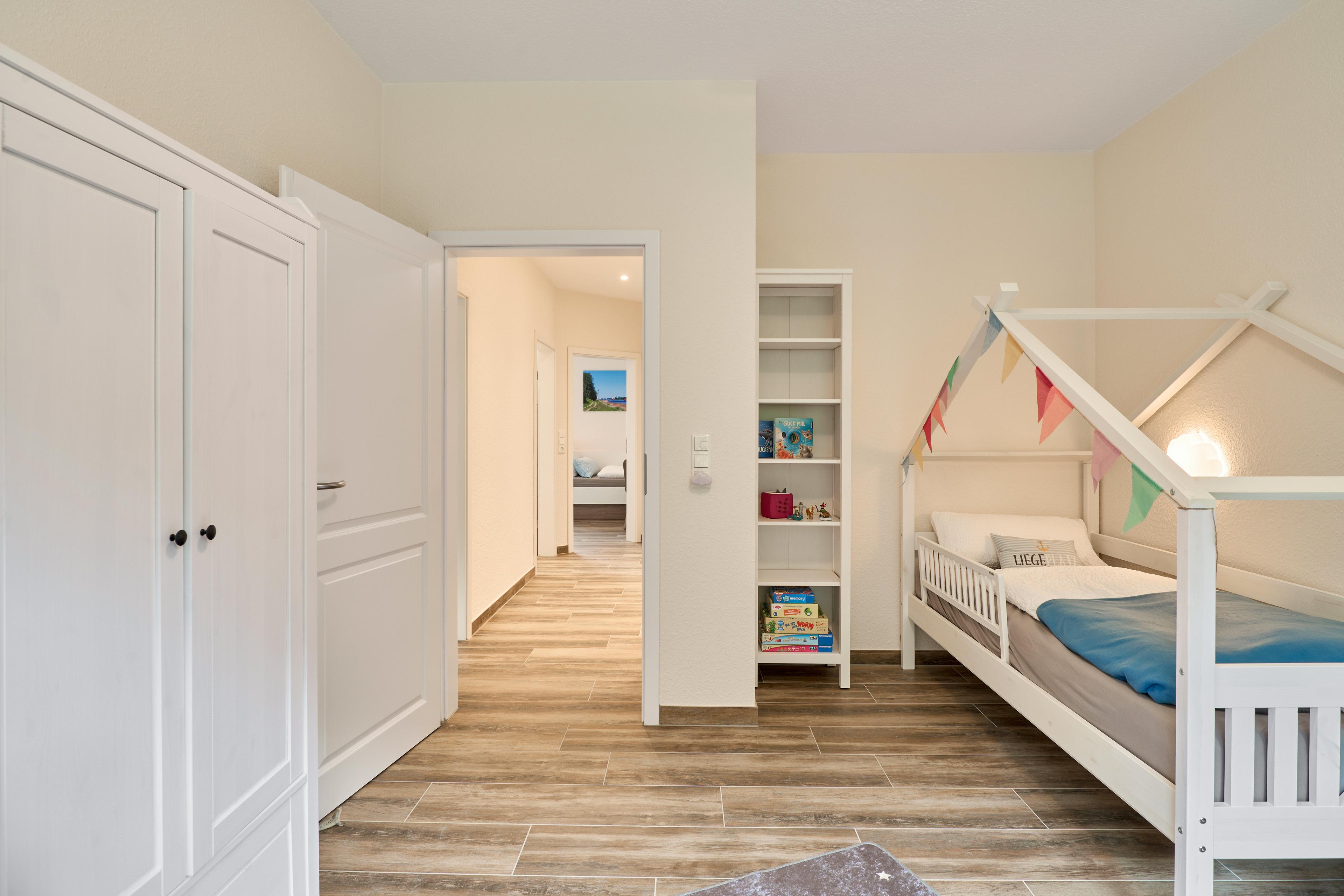ich erwartet in der Wohnung: Ein Schlafzimmer mit Familienbett (240x200), ein Kinderzimmer mit zwei Einzelbetten (90x200) und ein Kinderzimmer mit Kinderbett (90x200), Wickelkommode, hochwertiges Spielzeug, sehr gut ausgestattete Küche, Badezimmer mit Wellnessdusche & Badewanne, großer, eingezäunter Garten mit überdachter Terrasse.