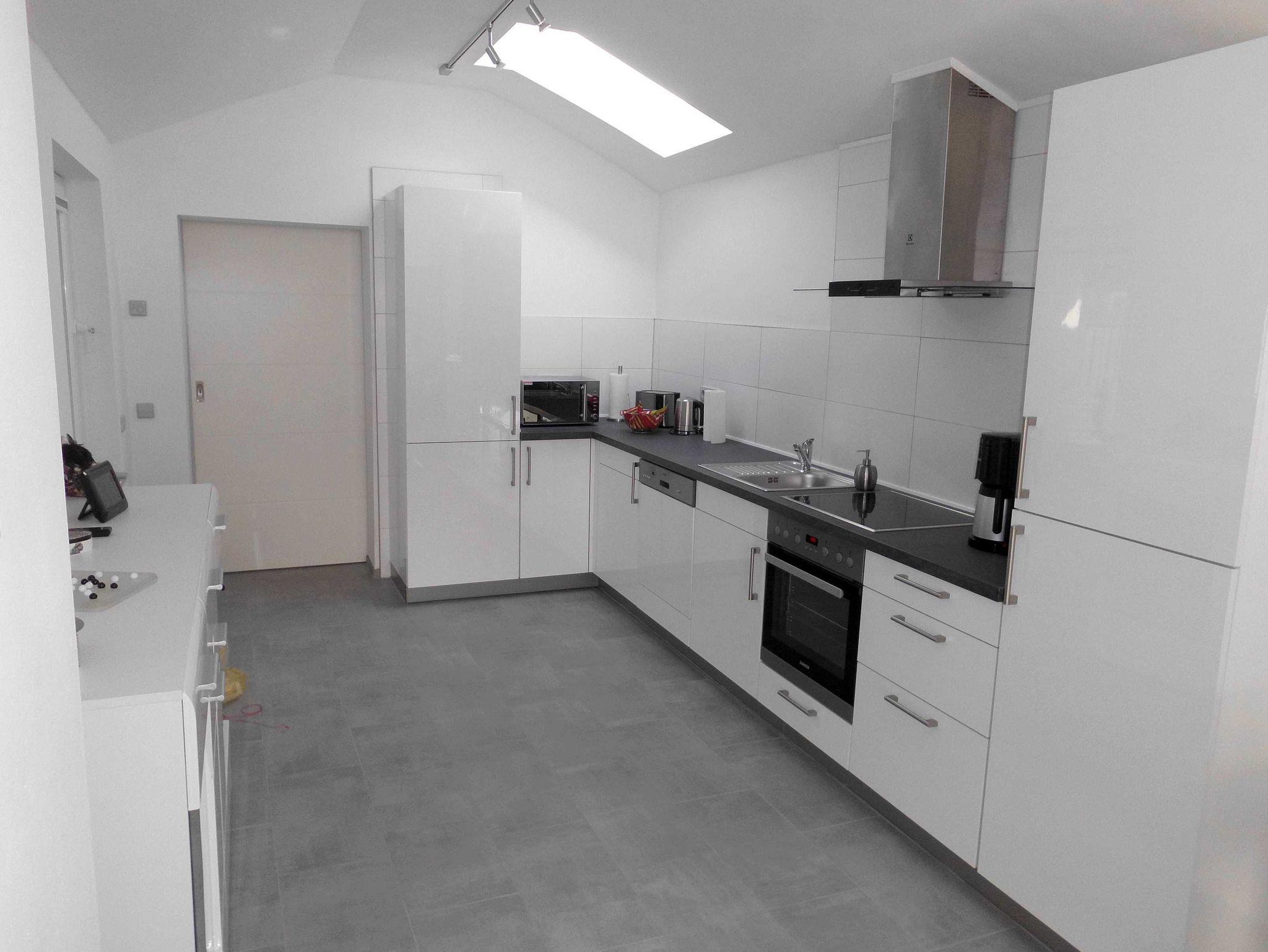 Ein kombiniertes Wohnzimmer mit Essecke und einer voll eingerichteten Küche. Hier finden Sie Geschirrtücher, ein Cerankochfeld mit Backofen mit Dunstabzugshaube, Geschirrspülmaschine, Waschtrockner, Kühlschrank, Gefrierschrank, Mikrowelle, Toaster, Wasserkocher, Filterkaffeemaschine, Mixer usw. vor .