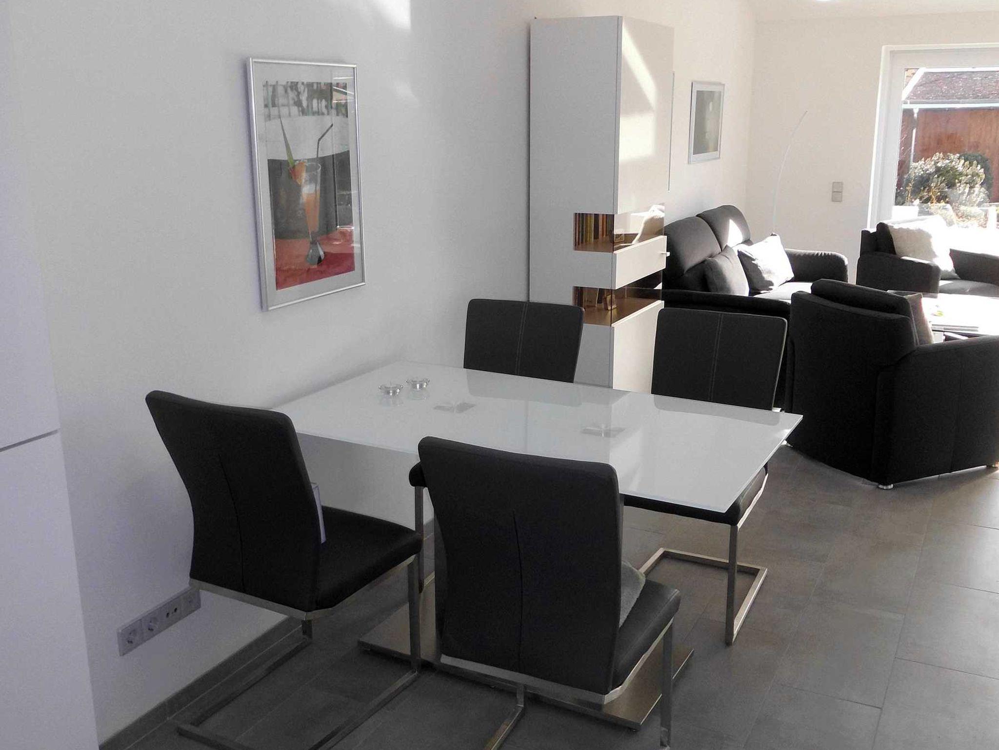 Im Wohnzimmer befinden sich eine Couchgarnitur mit zwei Sesseln, ein Flachbildfernseher und DVD Player, Stereoanlage und Büchern. Die Essecke hat einen großen Tisch mit 4 Stühlen einer Anrichte und einem Vitrinenschrank