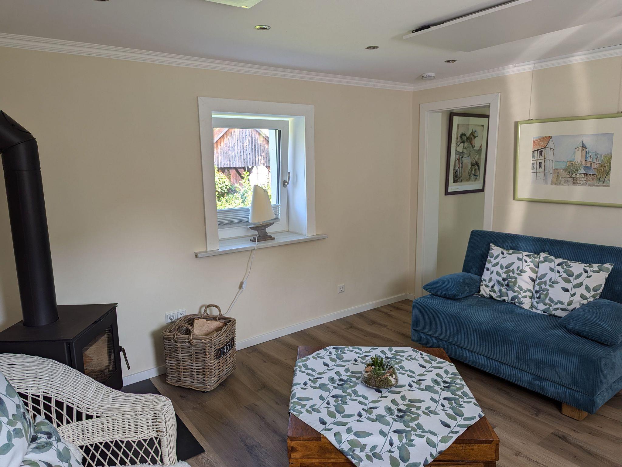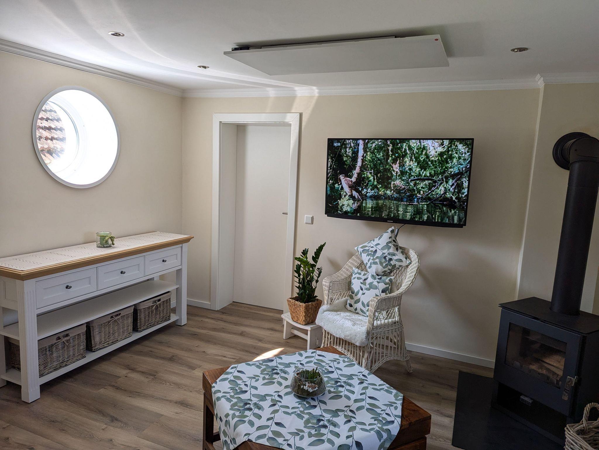 - Wohnzimmer mit 52 Zoll Sat- TV, Schlafsofa (125cm x 200cm), Korbsessel, Holzofen mit erster