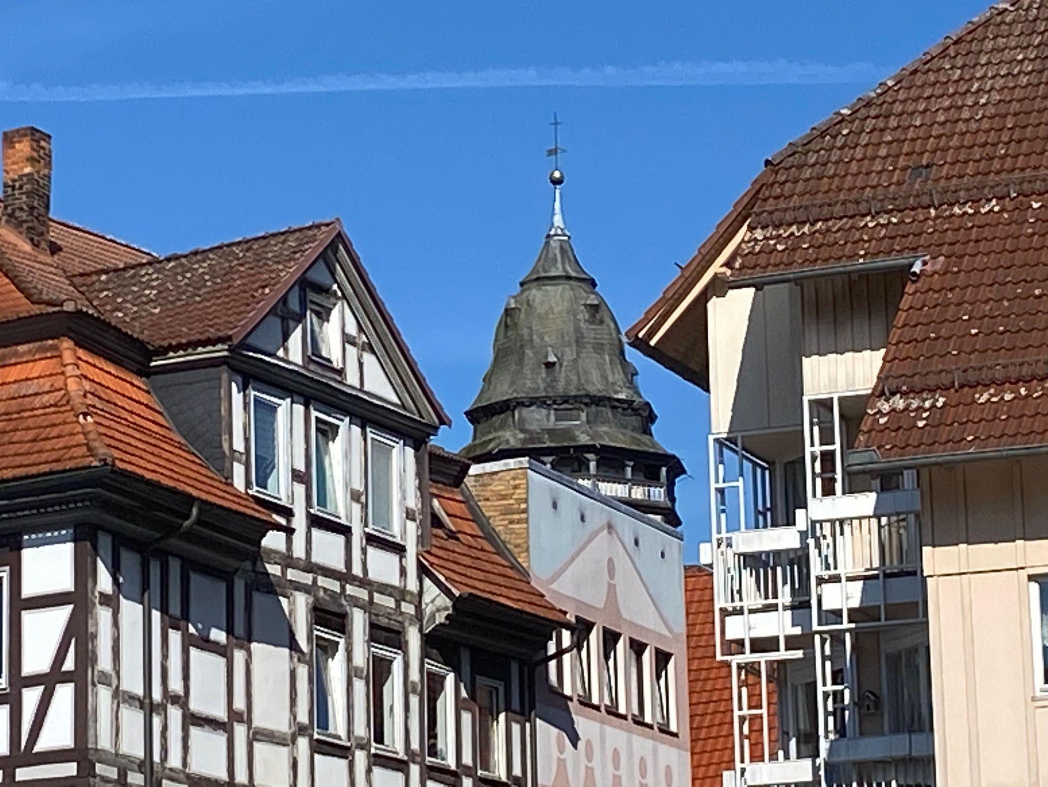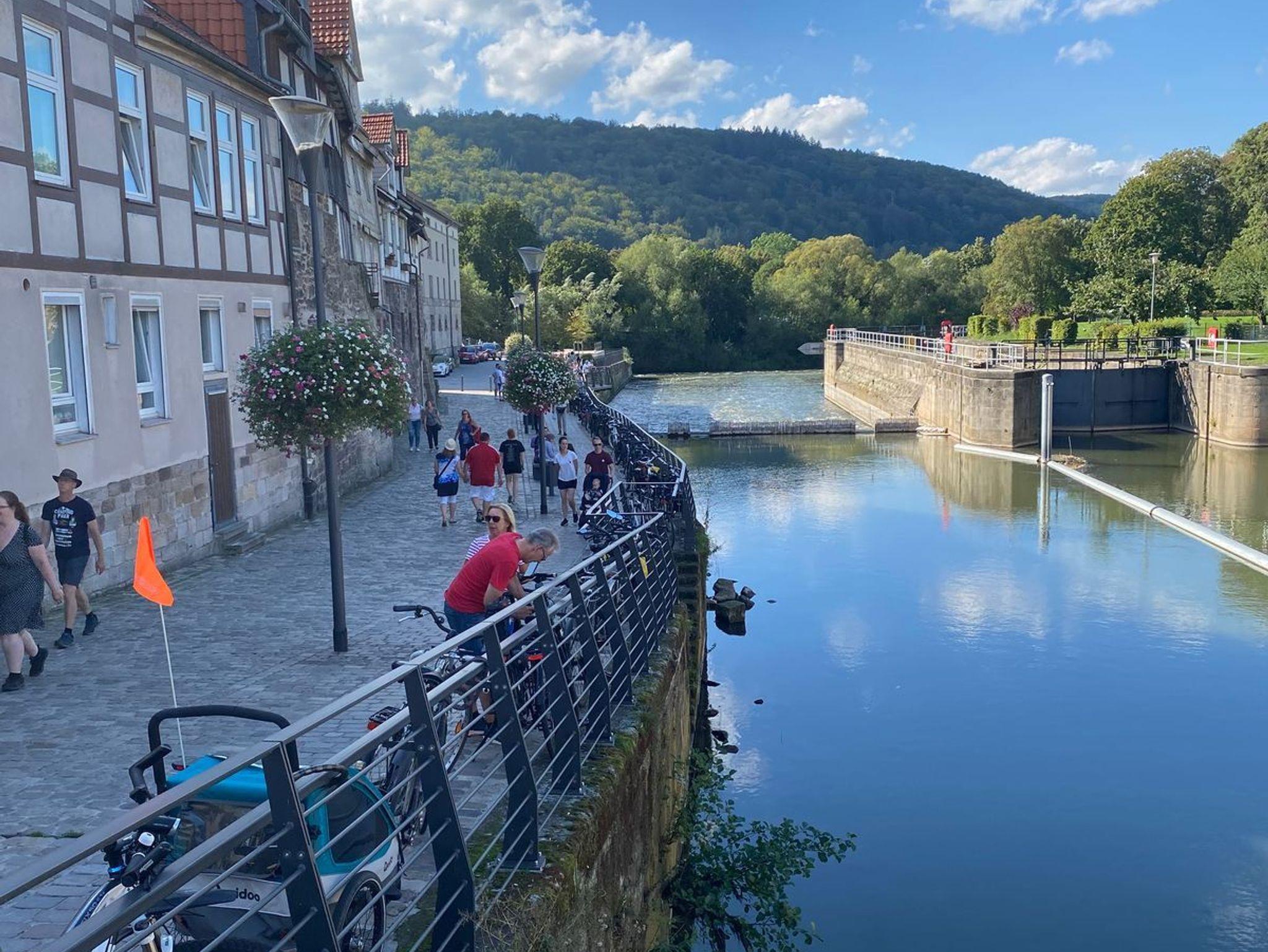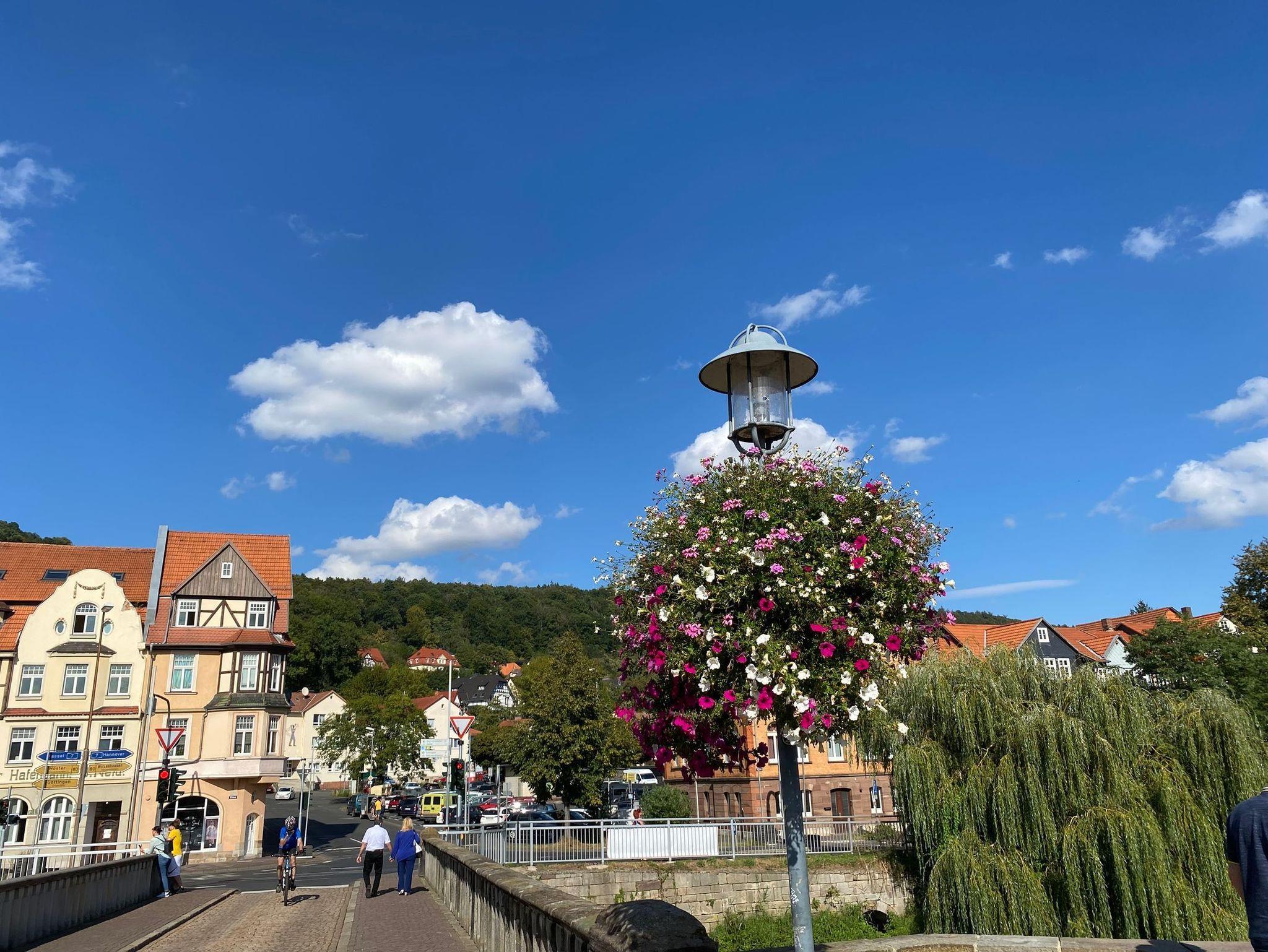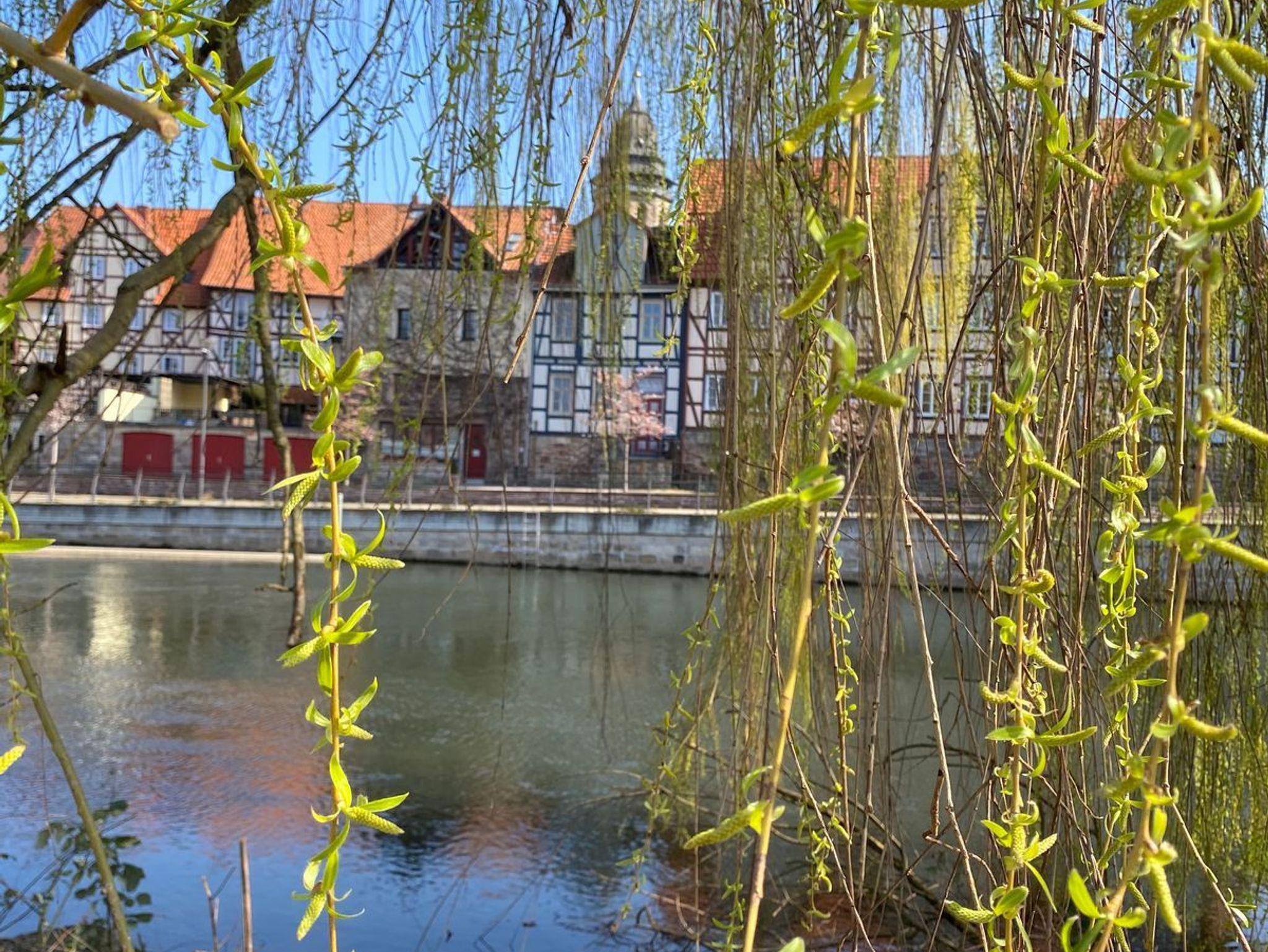 Die Altstadt (ca. 800 m entfernt), mit ihren ca. 700 sehr schön restaurierten Fachwerkhäusern, werden von Fulda und Werra begleitet, die dann am Ende der Halbinsel Tanzwerder die Weser entstehen lassen.