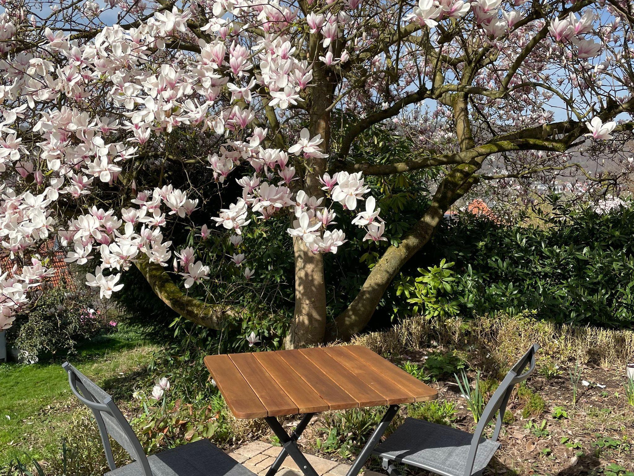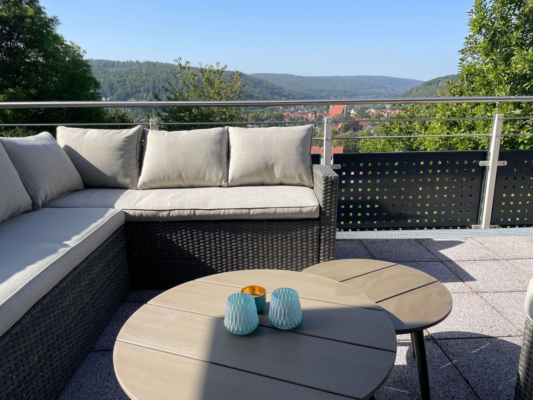 Vom Wohnzimmer aus erschließt sich der sehr große Balkon mit Loungemöbeln zur Sonnenseite und mit Blick auf Hann. Münden, den Reinhardswald und das Wesertal. Von den Schlafzimmern ist der Zugang direkt in den Garten möglich. Beide Etagen sind durch eine schmalere Wendeltreppe verbunden