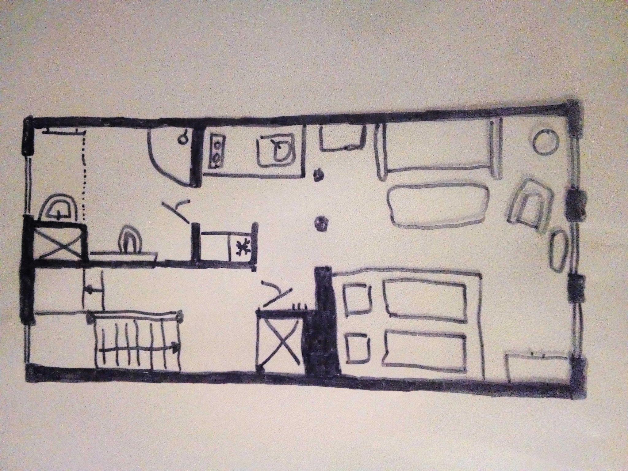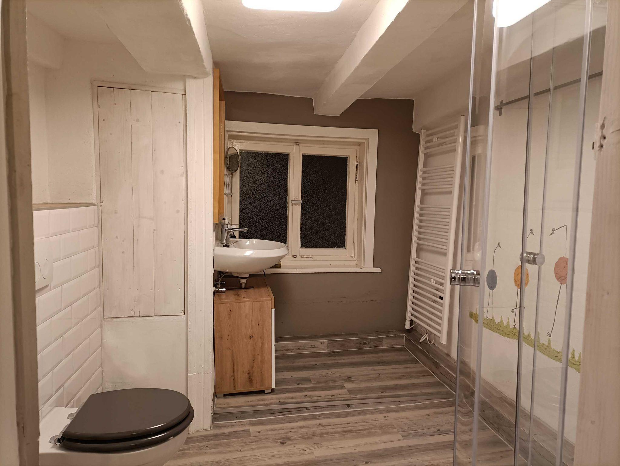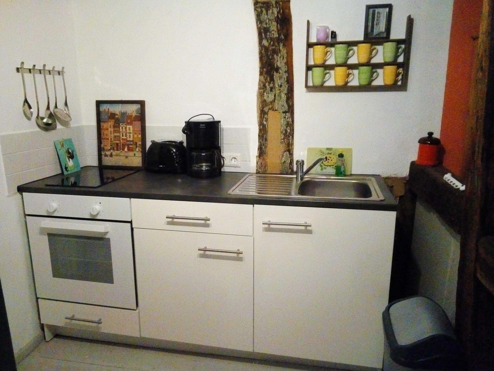 Eine kleine Ferienwohnung für 2 Personen im 1. OG. Vom Flur kommen sie in die offene Küche. Gleich daneben ist das Wohn-, Schlafzimmer. Neben der Küche geht es ins große Bad mit Fenster. Alles etwas niedriger aber gemütlich.