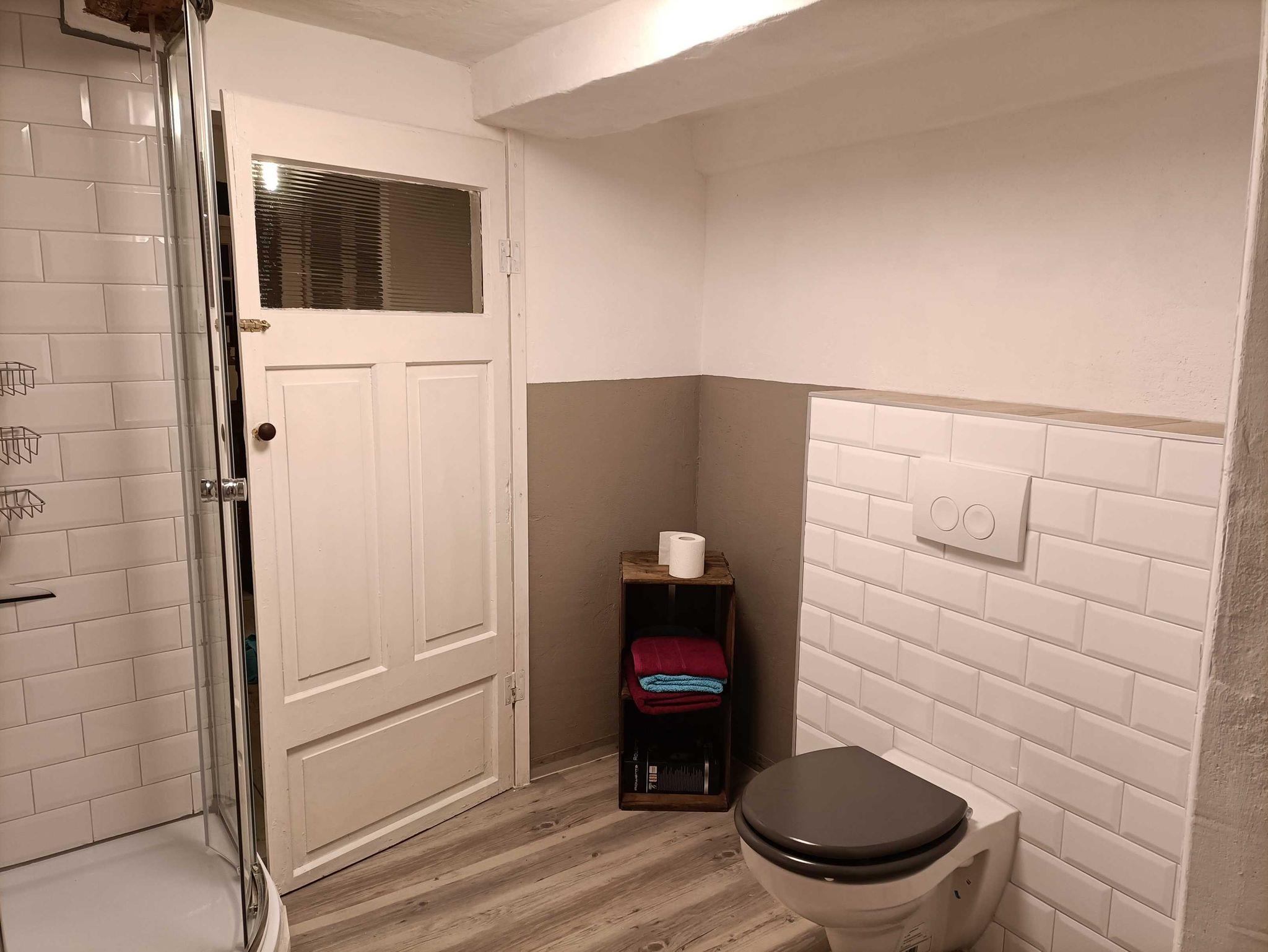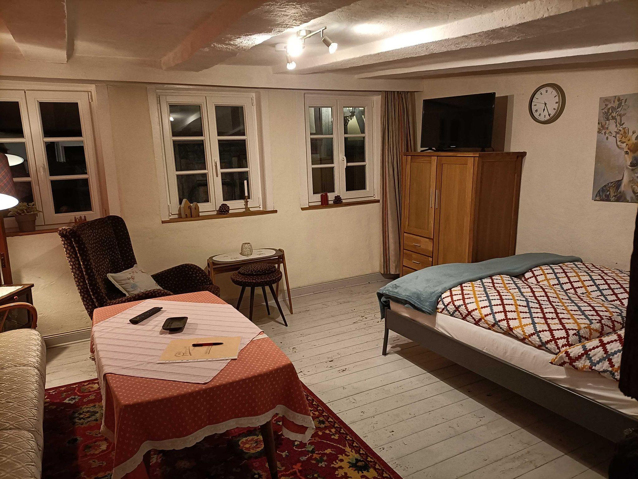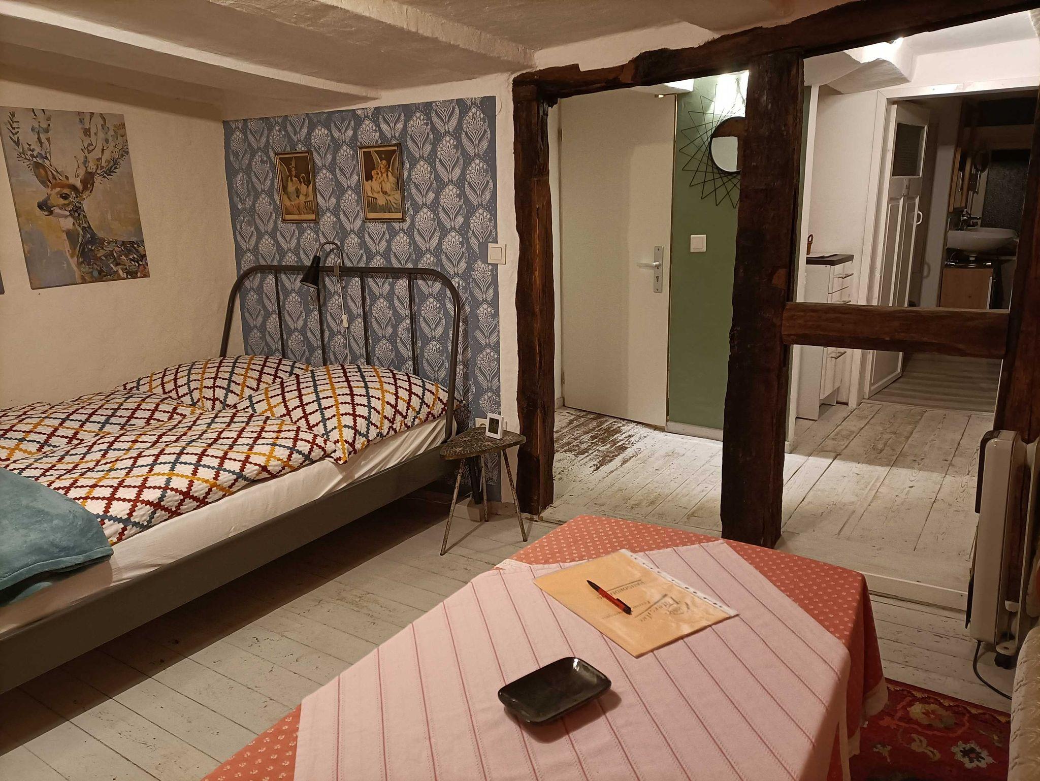 Eine kleine Ferienwohnung für 2 Personen im 1. OG. Großes Bad mit Fenster. Kleine Küchenzeile und ein Wohn-, Schlafzimmer. Alles etwas niedriger aber gemütlich.