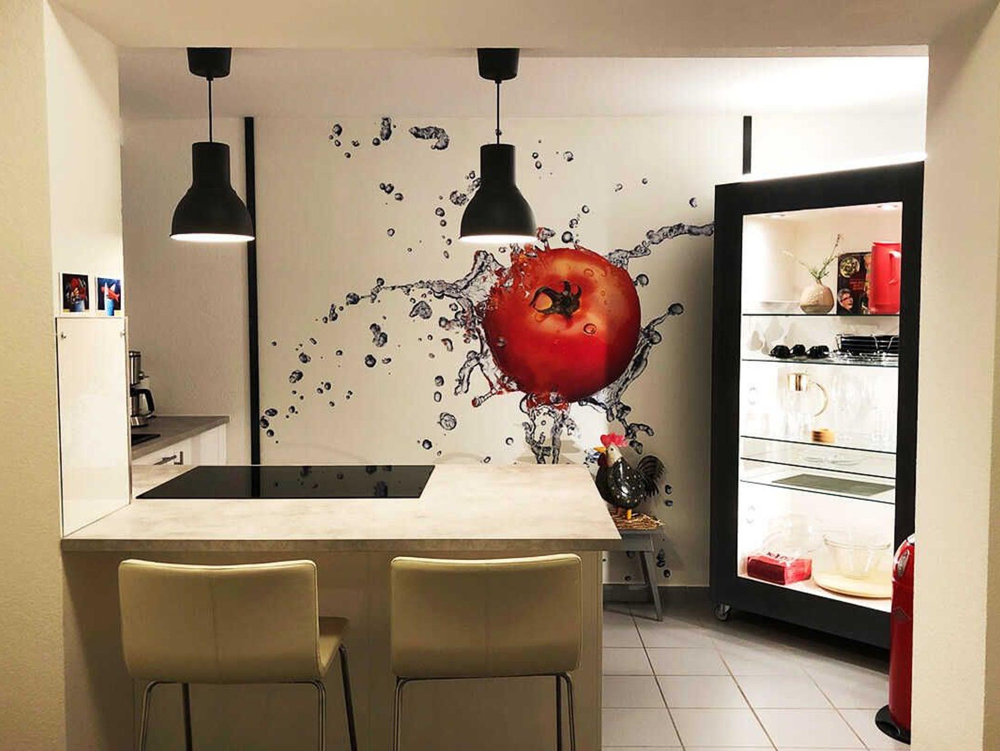 Küche: Abgegrenzt von den übrigen Räumen steht Ihnen eine komplett ausgestatte offene Küche zur Verfügung. 3-Sterne Kühlschrank, Mikrowelle, überbreites Kochfeld, Backofen, Kitchen-Aid Toaster, Wasserkocher, Eierkocher, Waffeleisen, wahlweise Kaffee- oder Kaffee-Pad-Maschine, Mixer für Smoothes.