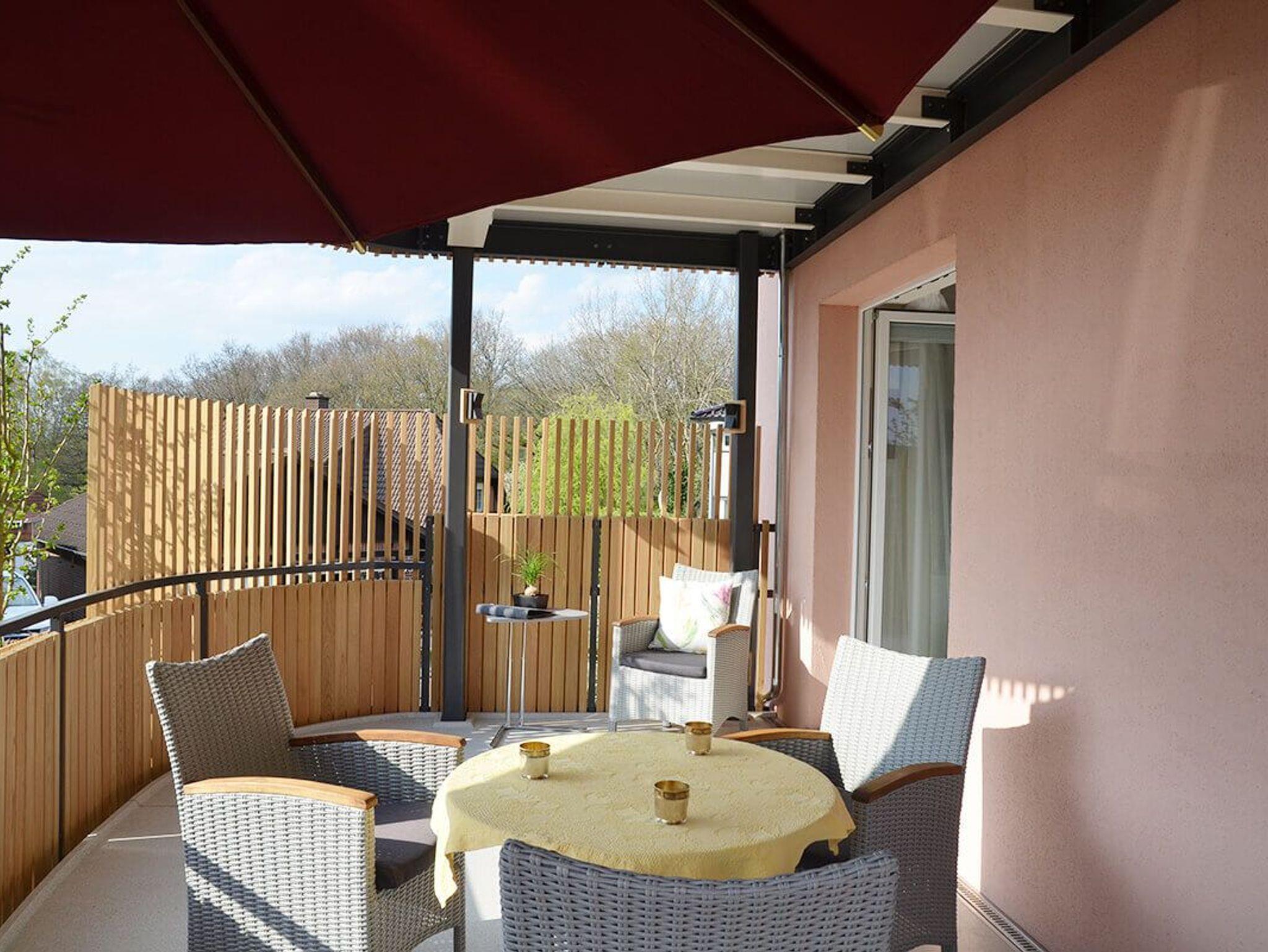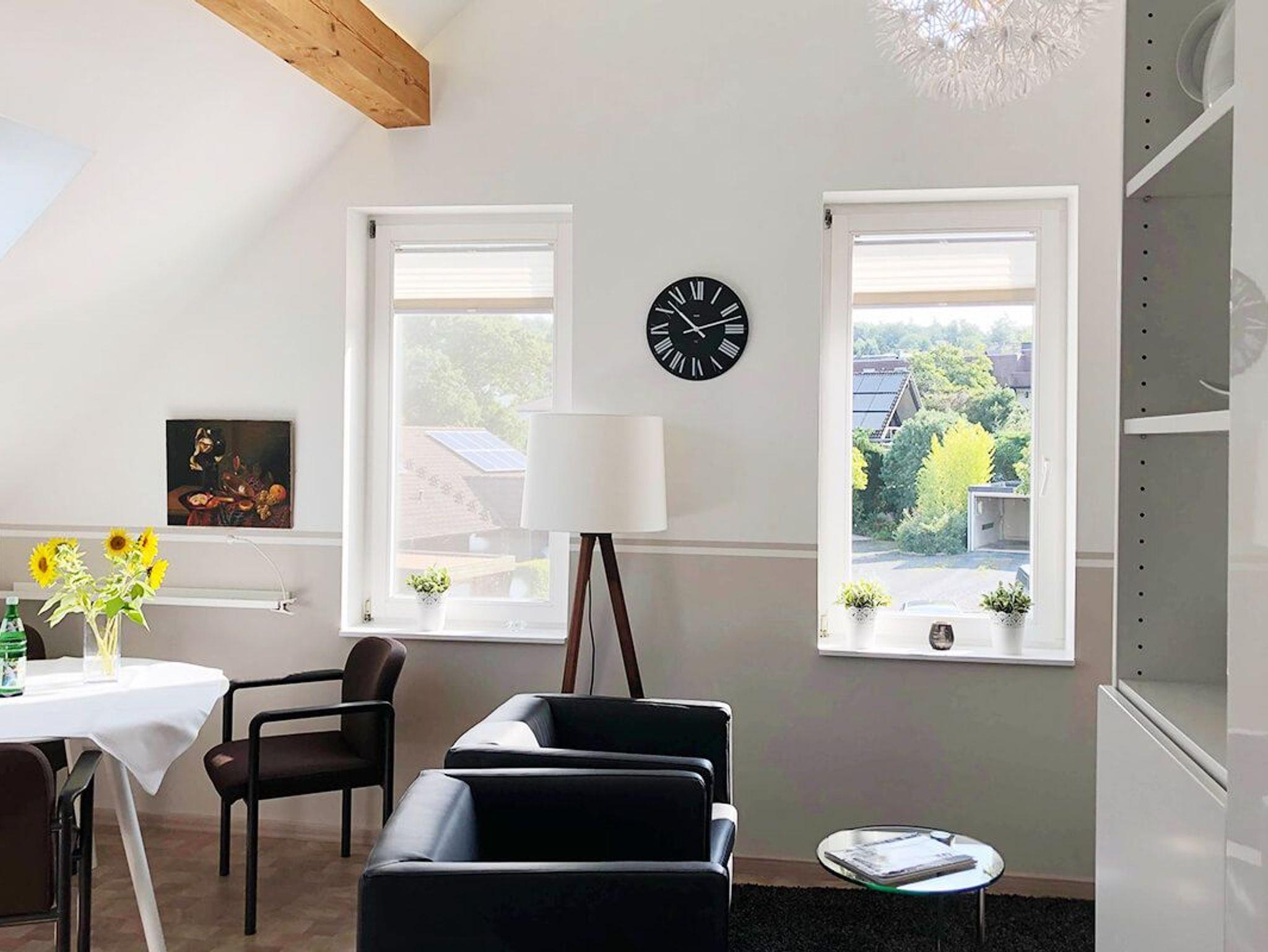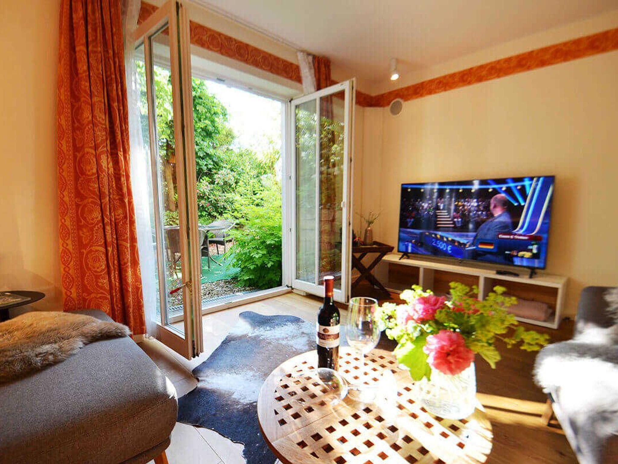 Ferienwohnung „Nachtigall“ 86m²: Licht durchflutet und hochwertig eingerichtet. Durch die beiden bodentiefen Fenster gehen Sie in ein kleines intimes Gärtchen. Viel Platz für zwei. Es fehlt an nichts.