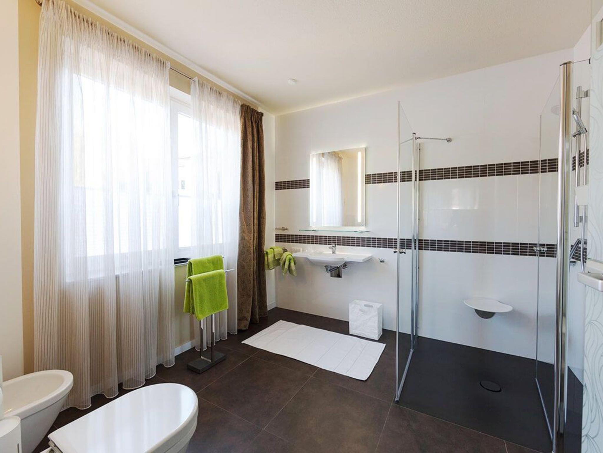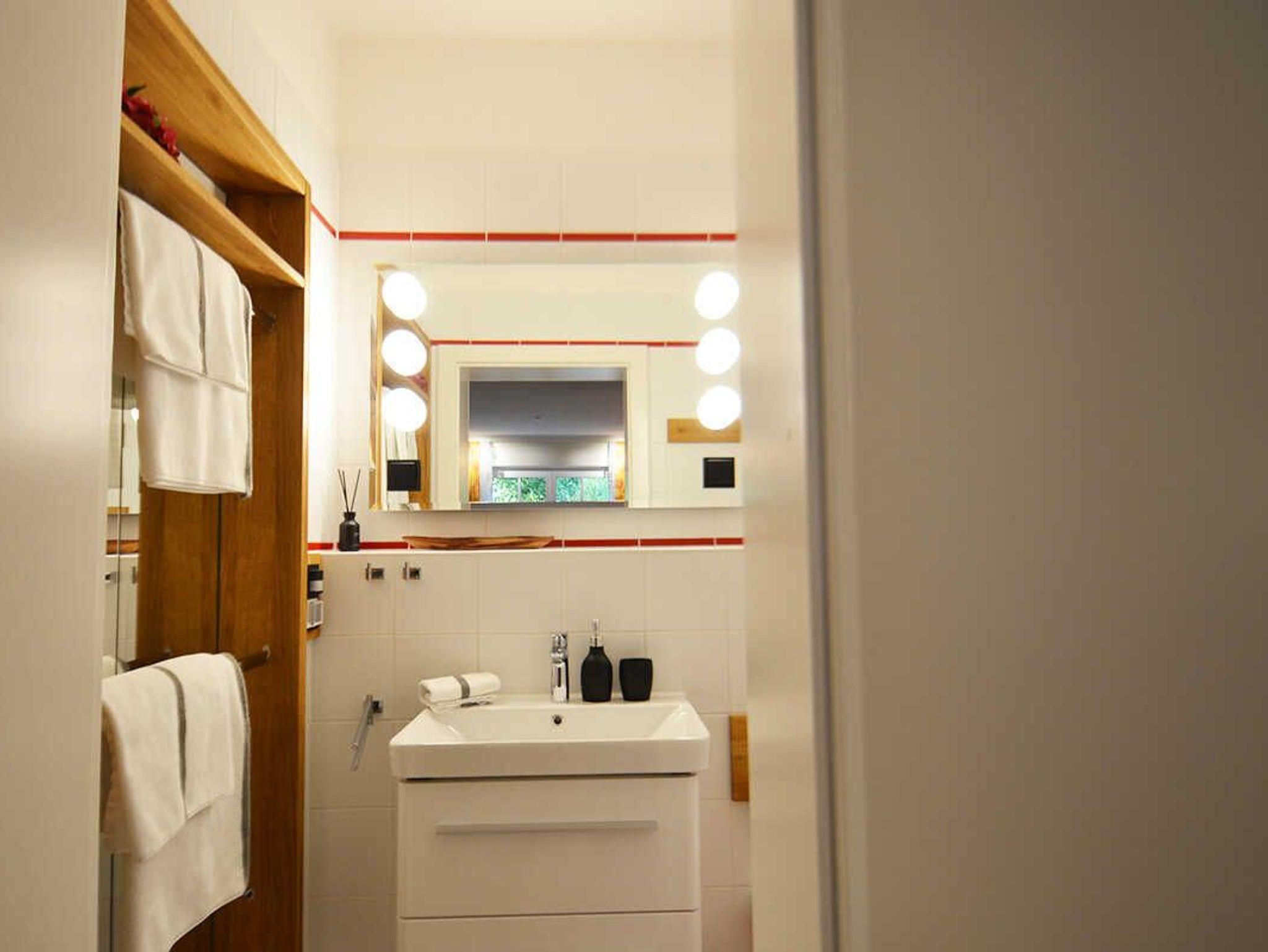 Duschbad: Mit einer überbreiten, beleuchteten Dusche mit Absaugung, beleuchteter großer Spiegel über dem Waschbecken. Ausreichend Haken und Ablagemöglichkeiten. Kleenex-Box.