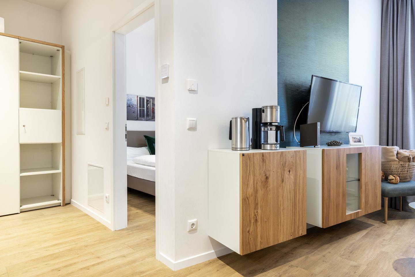 Das helle und moderne Nichtraucher-Apartment verfügt über Fußbodenheizung, kostenfreies WLAN und eine voll ausgestattete offene Küche mit Geschirrspüler, Kühlschrank, einen Herd mit 2 Glaskeramikkochfeldern und Backofen, Kaffeemaschine, Toaster, Wasserkocher und Mixstab. Im separaten Schlafzimmer befindet sich ein komfortables Boxspring-Doppelbett (1,80 x 2,00 m) und ein Flatscreen-TV (40 Zoll). Im kombinierten Wohn-Essbereich stehen Euch ein Flatscreen-TV (40 Zoll) und eine Musikanlage sowie eine Einzelschlafcouch (1,20 x 1,95 m) zur Verfügung. Das Apartment verfügt über einen Safe für Laptopgröße bis ca. 17 Zoll. Im modernen Badezimmer befinden sich eine ebenerdige Regendusche, ein Waschtisch, WC, ein Handtuchwärmer sowie ein Föhn.