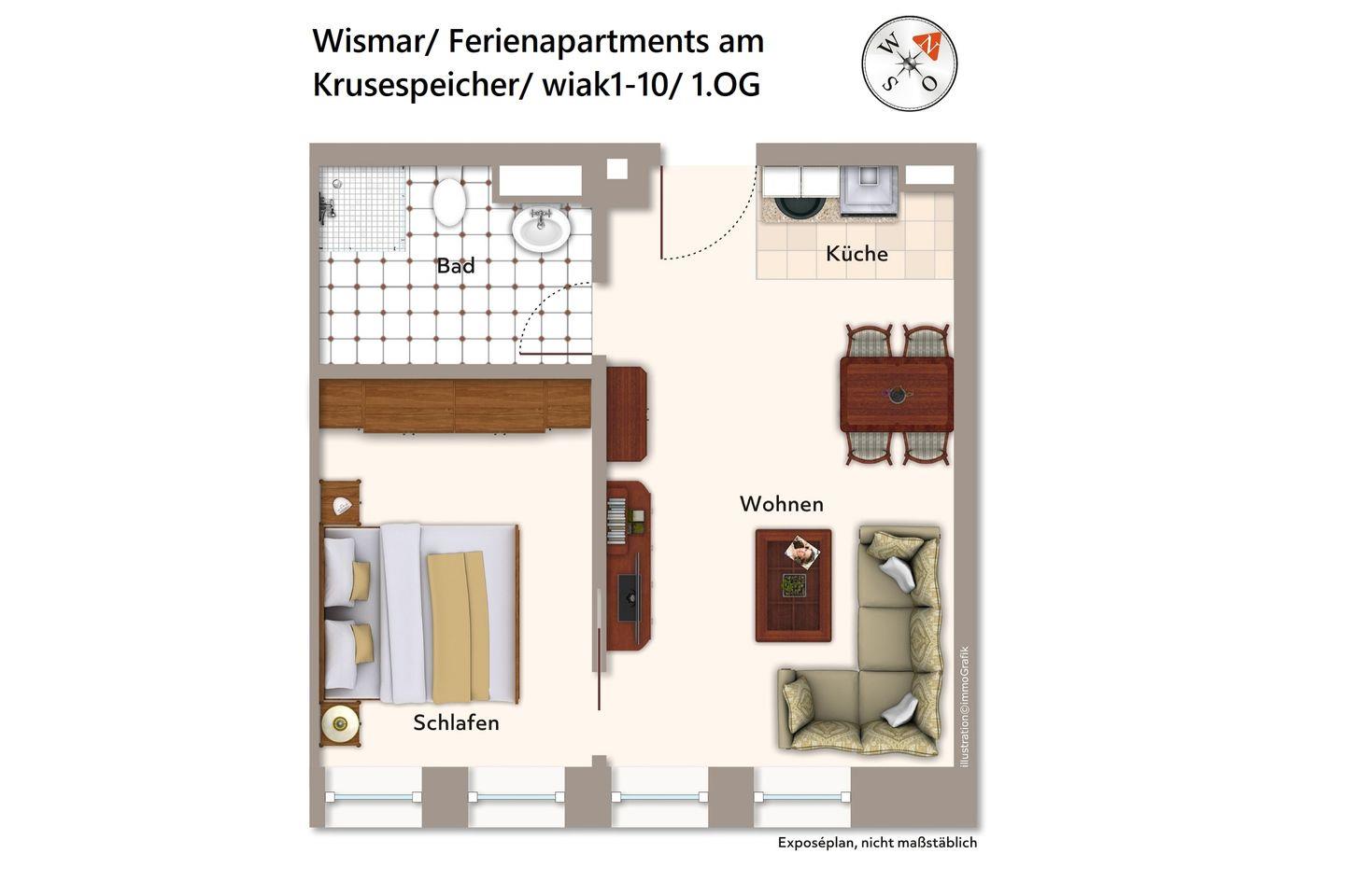 Das 40 m² große 2-Zimmer Apartment, wiak1-10, befindet sich in den Upstalsboom Ferienapartments am Krusespeicher und ist für bis zu 3 Personen geeignet. Das modern konzipierte Apartment verfügt über kostenfreies WLAN und Fußbodenheizung.