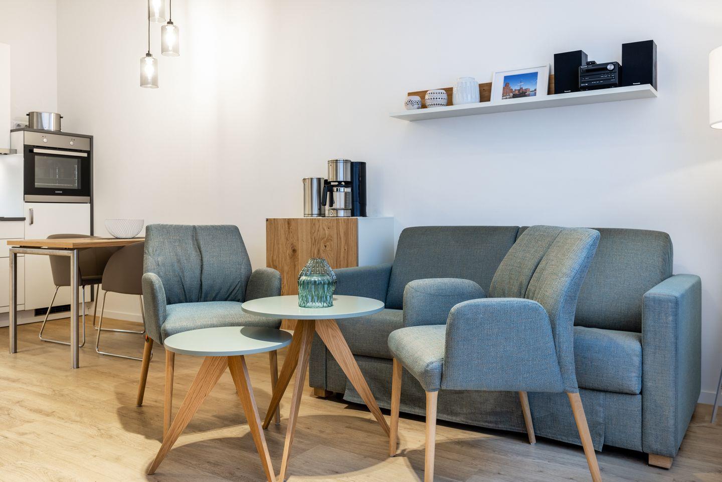 Das helle und moderne Nichtraucher-Apartment verfügt über Fußbodenheizung, kostenfreies WLAN und eine voll ausgestattete offene Küche mit Geschirrspüler, Kühlschrank, einen Herd mit 2 Glaskeramikkochfeldern und Backofen, Kaffeemaschine, Toaster, Wasserkocher und Mixstab. Im separaten Schlafzimmer befindet sich ein komfortables Boxspring-Doppelbett (1,80 x 2,00 m) und ein Flatscreen-TV (40 Zoll). Im kombinierten Wohn-Essbereich stehen euch ein Flatscreen-TV (40 Zoll) und eine Musikanlage sowie eine Einzelschlafcouch (1,20 x 1,95 m) zur Verfügung. Das Apartment verfügt über einen Safe für Laptopgröße bis ca. 17 Zoll. Im modernen Badezimmer befinden sich eine ebenerdige Regendusche, ein Waschtisch, WC, ein Handtuchwärmer sowie ein Föhn.