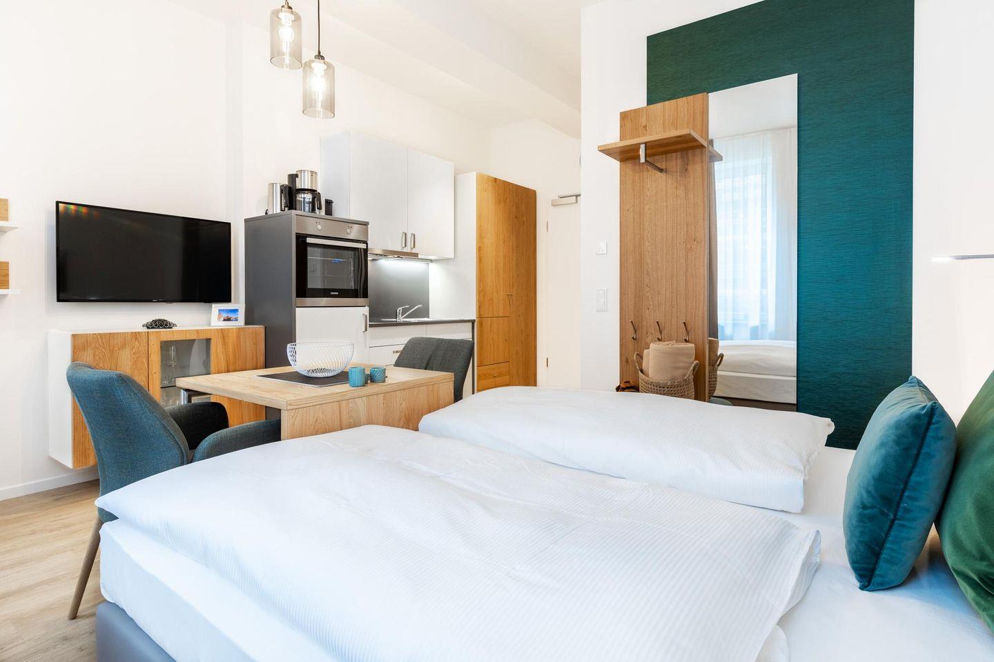 Das helle und moderne Nichtraucher-Apartment verfügt über Fußbodenheizung, kostenfreies WLAN und eine voll ausgestattete offene Küche mit Geschirrspüler, Kühlschrank, einen Herd mit 2 Glaskeramikkochfeldern und Backofen, Kaffeemaschine, Toaster, Wasserkocher und Mixstab. Im kombinierten Wohn-Schlafbereich befinden sich ein komfortables Boxspring-Doppelbett (1,80 x 2,00 m), ein Flatscreen-TV (40 Zoll) und eine HiFi-Anlage mit CD-Player. Das Apartment verfügt über einen Safe für Laptopgröße bis ca. 17 Zoll. Im modernen Badezimmer stehen euch eine ebenerdige Regendusche, ein Waschtisch, WC, ein Handtuchwärmer sowie ein Föhn zur Verfügung.