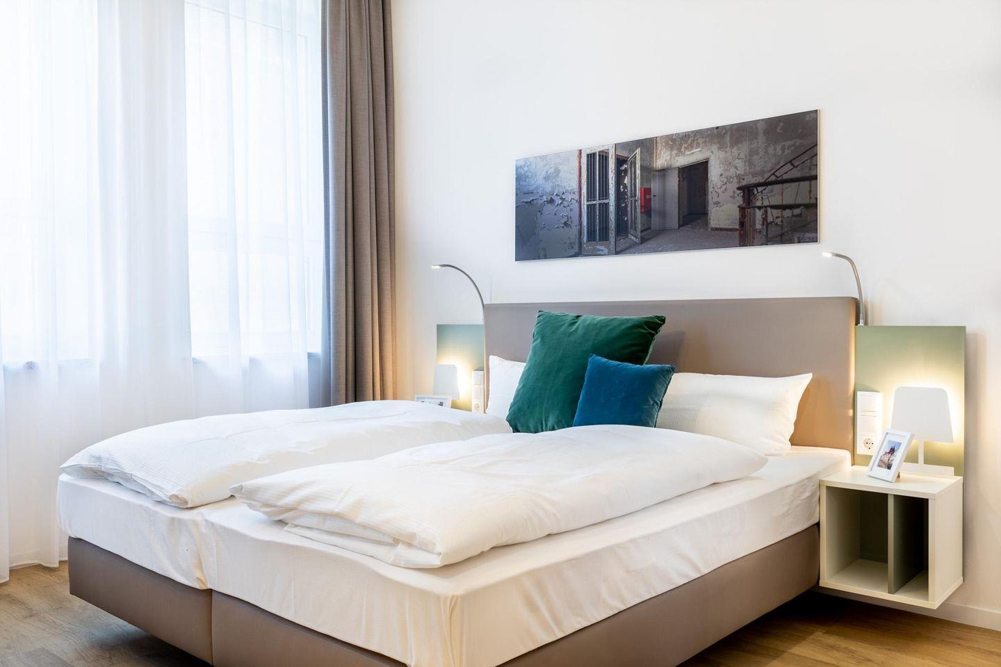 Das helle und moderne Nichtraucher-Apartment verfügt über Fußbodenheizung, kostenfreies WLAN und eine voll ausgestattete offene Küche mit Geschirrspüler, Kühlschrank, einen Herd mit 2 Glaskeramikkochfeldern und Backofen, Kaffeemaschine, Toaster, Wasserkocher und Mixstab. Im kombinierten Wohn-Schlafbereich befinden sich ein komfortables Boxspring-Doppelbett (1,80 x 2,00 m), ein Flatscreen-TV (40 Zoll) und eine Musikanlage. Das Apartment verfügt über einen Safe für Laptopgröße bis ca. 17 Zoll. Im modernen Badezimmer stehen euch eine ebenerdige Regendusche, ein Waschtisch, WC, ein Handtuchwärmer sowie ein Föhn zur Verfügung.
