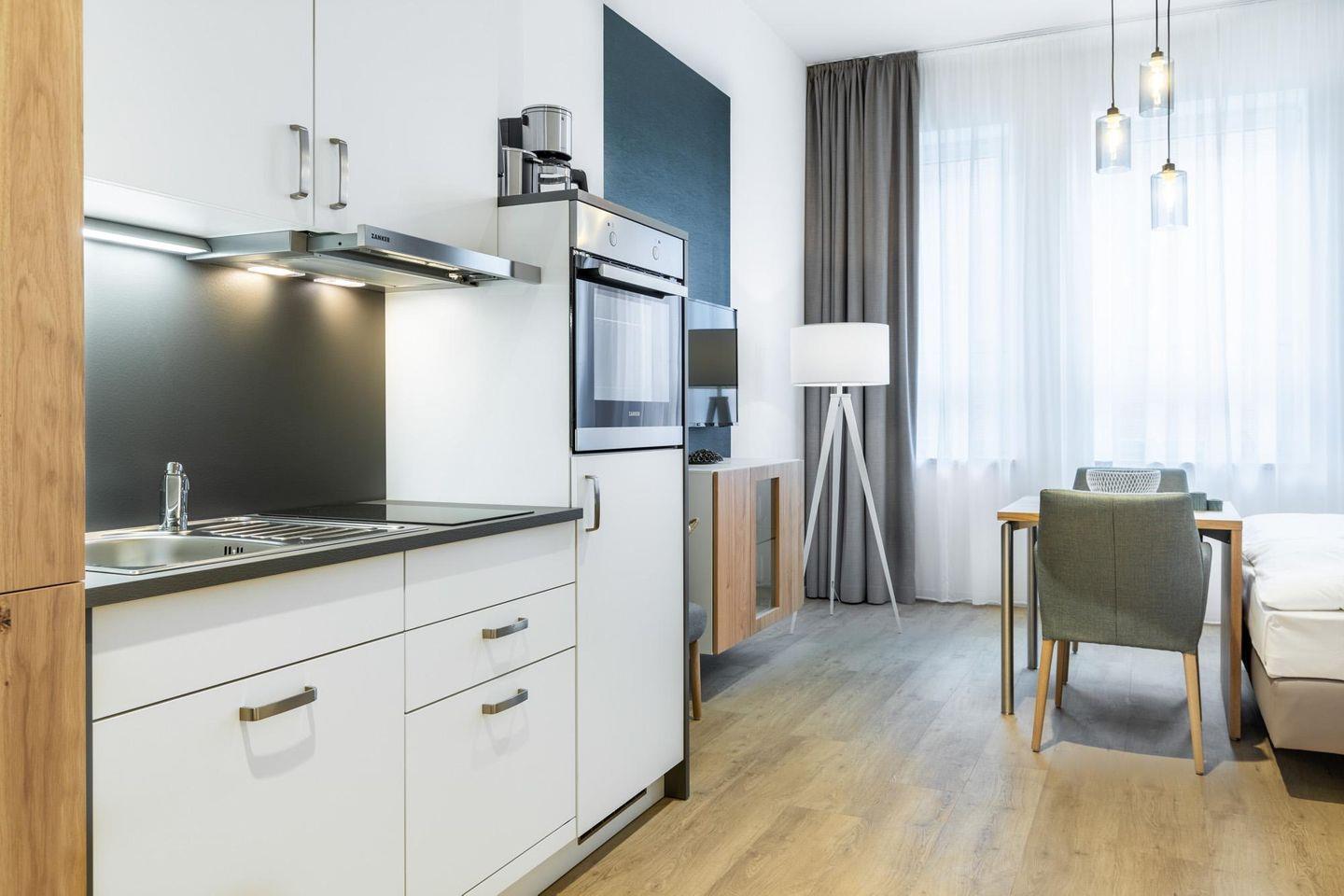 Das helle und moderne Nichtraucher-Apartment verfügt über Fußbodenheizung, kostenfreies WLAN und eine voll ausgestattete offene Küche mit Geschirrspüler, Kühlschrank, einen Herd mit 2 Glaskeramikkochfeldern und Backofen, Kaffeemaschine, Toaster, Wasserkocher und Mixstab. Im kombinierten Wohn-Schlafbereich befinden sich ein komfortables Boxspring-Doppelbett (1,80 x 2,00 m), ein Flatscreen-TV (40 Zoll) und eine Musikanlage. Das Apartment verfügt über einen Safe für Laptopgröße bis ca. 17 Zoll. Im modernen Badezimmer stehen euch eine ebenerdige Regendusche, ein Waschtisch, WC, ein Handtuchwärmer sowie ein Föhn zur Verfügung.