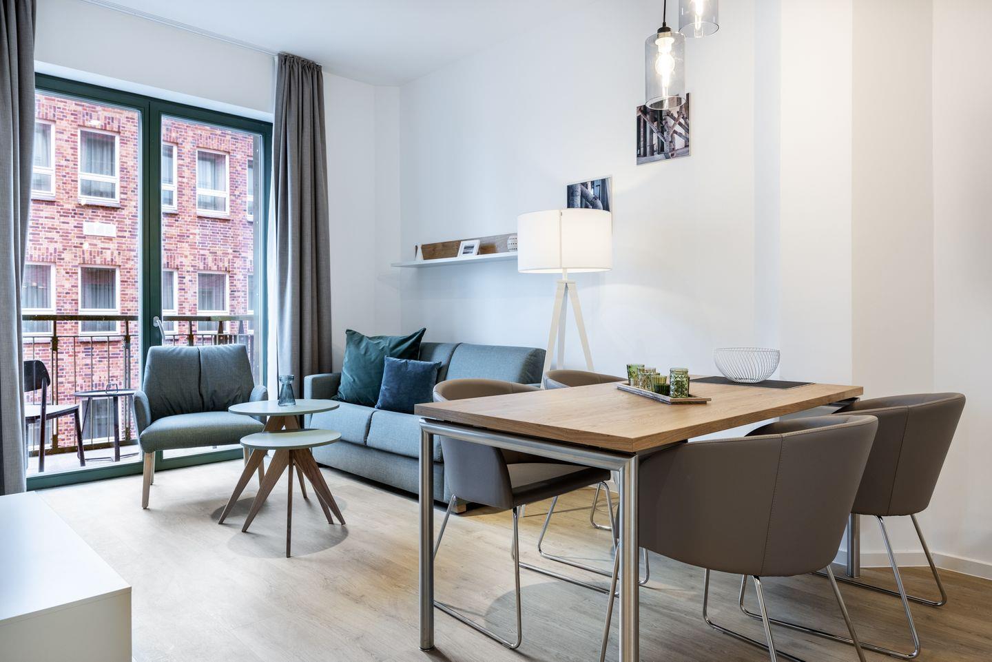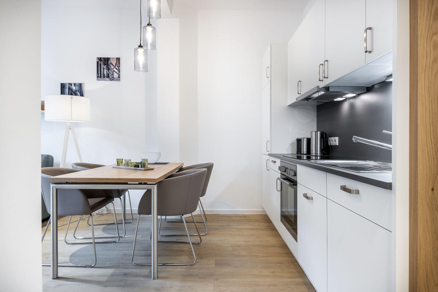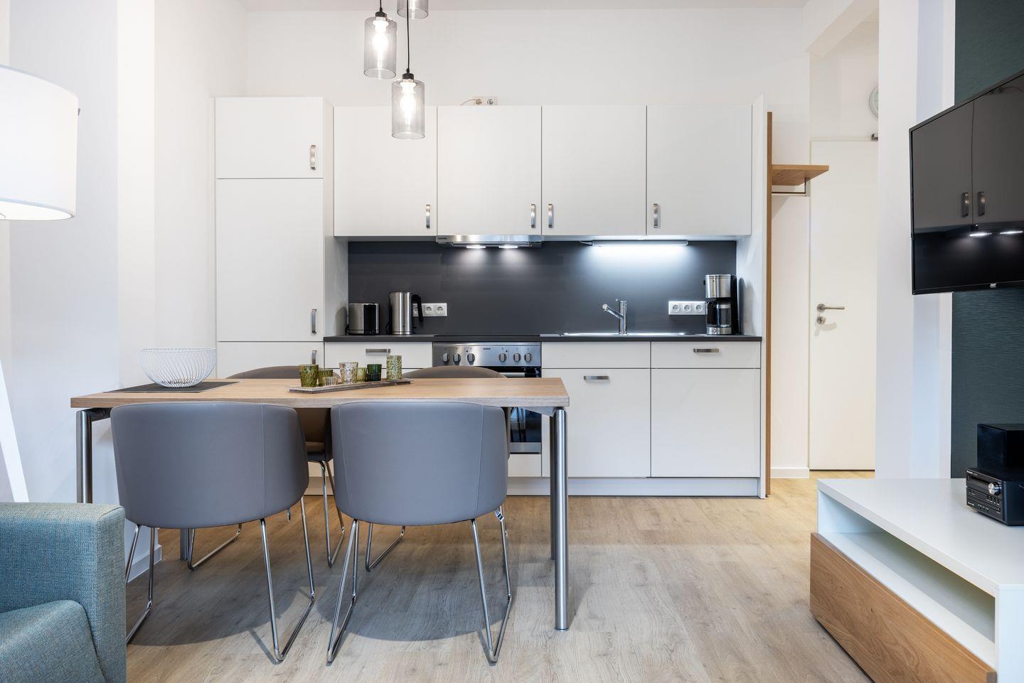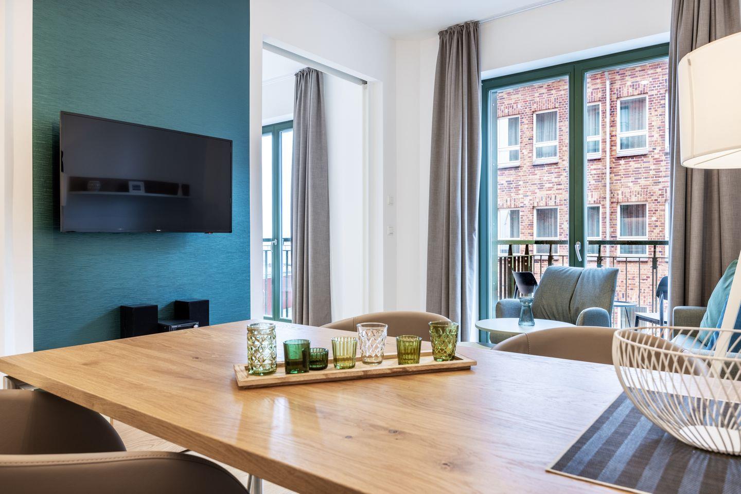 Das helle Apartment verfügt über bodentiefe Fenster, Fußbodenheizung, kostenfreies WLAN und eine voll ausgestattete offene Küche mit Geschirrspüler, Kühlschrank mit Tiefkühlfach, Herd mit 4 Glaskeramikkochfeldern und Backofen, Kaffeemaschine, Toaster, Wasserkocher und Mixstab. Im kombinierten Wohn-Essbereich befinden sich eine Einzelschlafcouch (1,20 x 2,00 m), ein Flatscreen-TV (42 Zoll), eine HiFi-Anlage sowie Gesellschaftsspiele. Genießt schöne Stunden auf dem Balkon mit Blick zum Hafen. Das Schlafzimmer beinhaltet ein komfortables Boxspring-Doppelbett (1,80 x 2,00 m) und einen Flatscreen-TV (42 Zoll). Im geschmackvollen Badezimmer stehen euch eine ebenerdige Regendusche, ein Waschtisch, WC, ein Handtuchwärmer sowie ein Föhn zur Verfügung. Das Apartment verfügt über einen Safe für eine Laptopgröße bis ca. 17 Zoll.