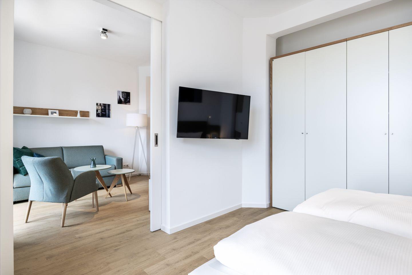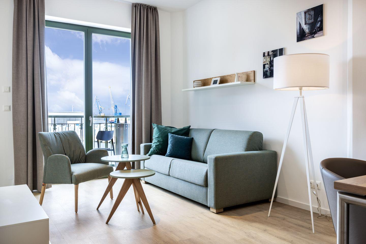 Das helle Apartment verfügt über bodentiefe Fenster, Fußbodenheizung, kostenfreies WLAN und eine voll ausgestattete offene Küche mit Geschirrspüler, Kühlschrank mit Tiefkühlfach, Herd mit 4 Glaskeramikkochfeldern und Backofen, Kaffeemaschine, Toaster, Wasserkocher und Mixstab. Im kombinierten Wohn-Essbereich befinden sich eine Doppelschlafcouch (1,40 x 2,00 m), ein Flatscreen-TV (42 Zoll), eine HiFi-Anlage sowie Gesellschaftsspiele. Genießt schöne Stunden auf dem Balkon mit direktem Blick zum Hafen. Das Schlafzimmer beinhaltet ein komfortables Boxspring-Doppelbett (1,80 x 2,00 m) und einen Flatscreen-TV (42 Zoll). Im geschmackvollen Badezimmer stehen euch eine ebenerdige Regendusche, ein Waschtisch, WC, ein Handtuchwärmer sowie ein Föhn zur Verfügung. Das Apartment verfügt über einen Safe für eine Laptopgröße bis ca. 17 Zoll. Ein Kinderbett kann gegen Entgelt im Schlafzimmer aufgestellt werden. Hunde sind in diesem Apartment gestattet.