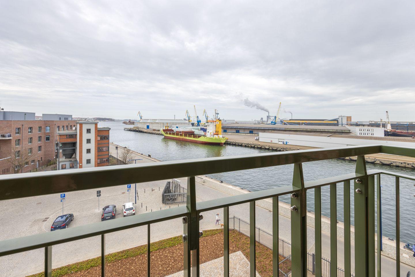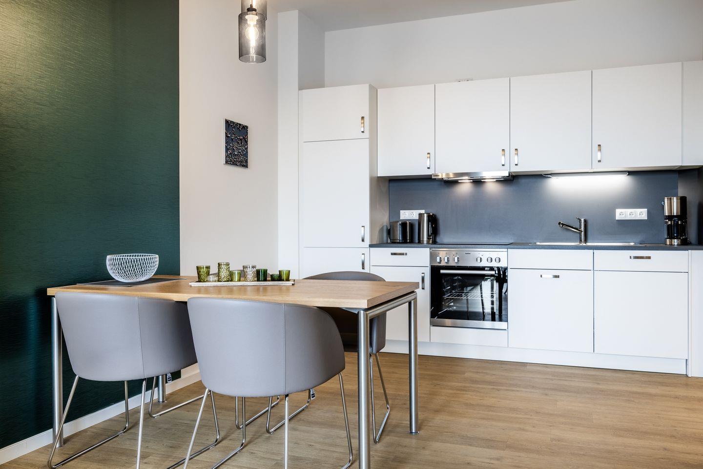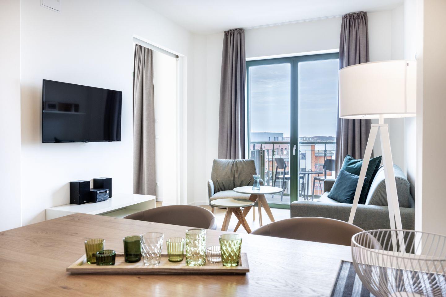 Das helle Apartment verfügt über bodentiefe Fenster, Fußbodenheizung, kostenfreies WLAN und eine voll ausgestattete offene Küche mit Geschirrspüler, Kühlschrank mit Tiefkühlfach, Herd mit 4 Glaskeramikkochfeldern und Backofen, Kaffeemaschine, Toaster, Wasserkocher und Mixstab. Im kombinierten Wohn-Essbereich befinden sich eine Doppelschlafcouch (1,40 x 2,00 m), ein Flatscreen-TV (42 Zoll), eine HiFi-Anlage sowie Gesellschaftsspiele. Genießt schöne Stunden auf dem Balkon mit direktem Blick zum Hafen. Das Schlafzimmer beinhaltet ein komfortables Boxspring-Doppelbett (1,80 x 2,00 m) und einen Flatscreen-TV (42 Zoll). Im geschmackvollen Badezimmer stehen euch eine ebenerdige Regendusche, ein Waschtisch, WC, ein Handtuchwärmer sowie ein Föhn zur Verfügung. Das Apartment verfügt über einen Safe für eine Laptopgröße bis ca. 17 Zoll.