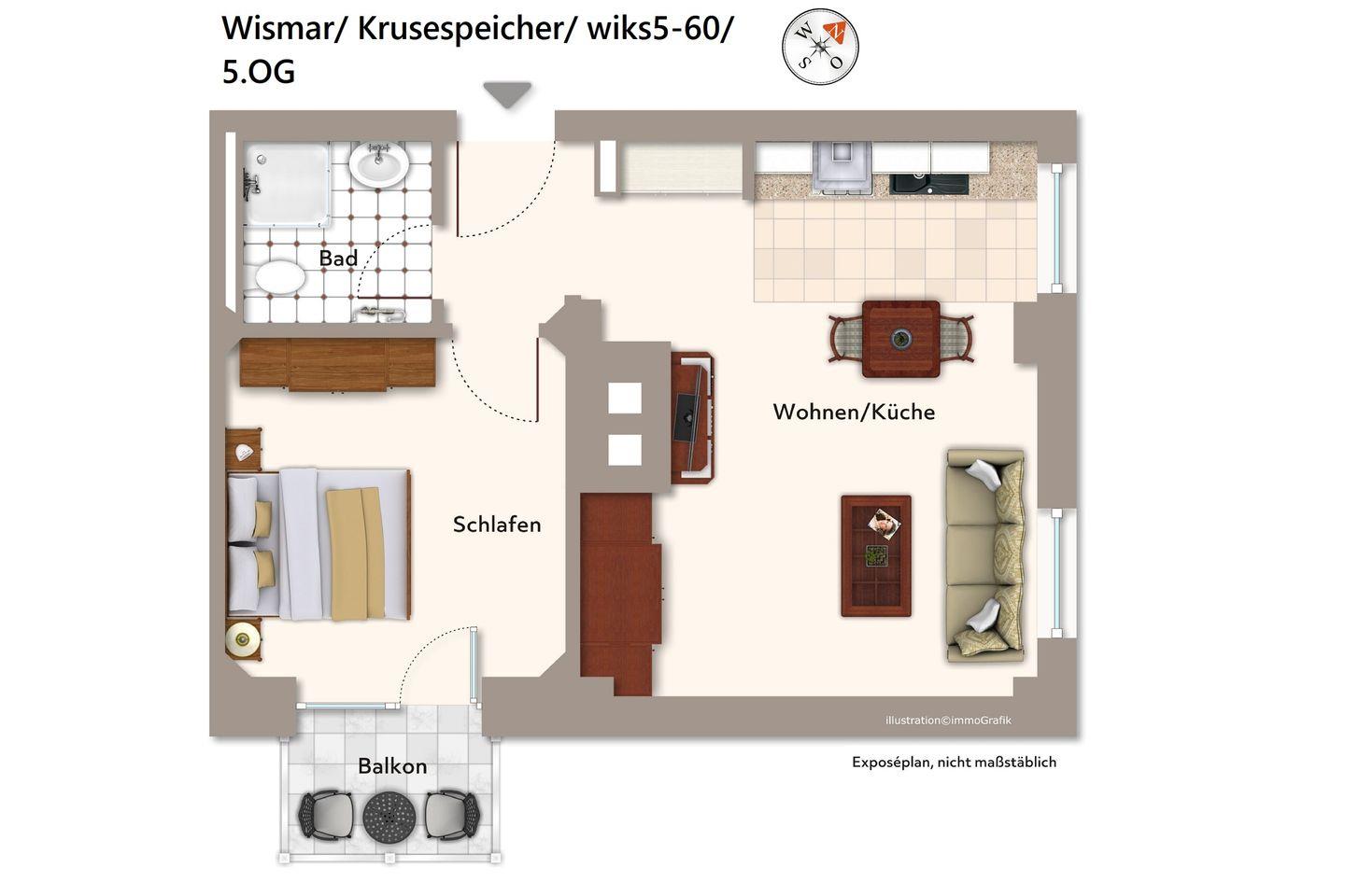 Das Nichtraucher-Apartment in Ost-Lage befindet sich im 5. Obergeschoss des denkmalgeschützten Krusespeichers. Der Alte Hafen von Wismar, einer der attraktivsten Orte der weltoffenen Hansestadt, liegt euch zu Füßen. Von hier aus lässt sich die Stadt und das wunderschöne Umland ideal erkunden. Der Alte Hafen ist übrigens überaus beliebter Veranstaltungsort für Events und Feste und überdies Original-Drehort für SOKO Wismar, die bekannte ZDF-Serie!
