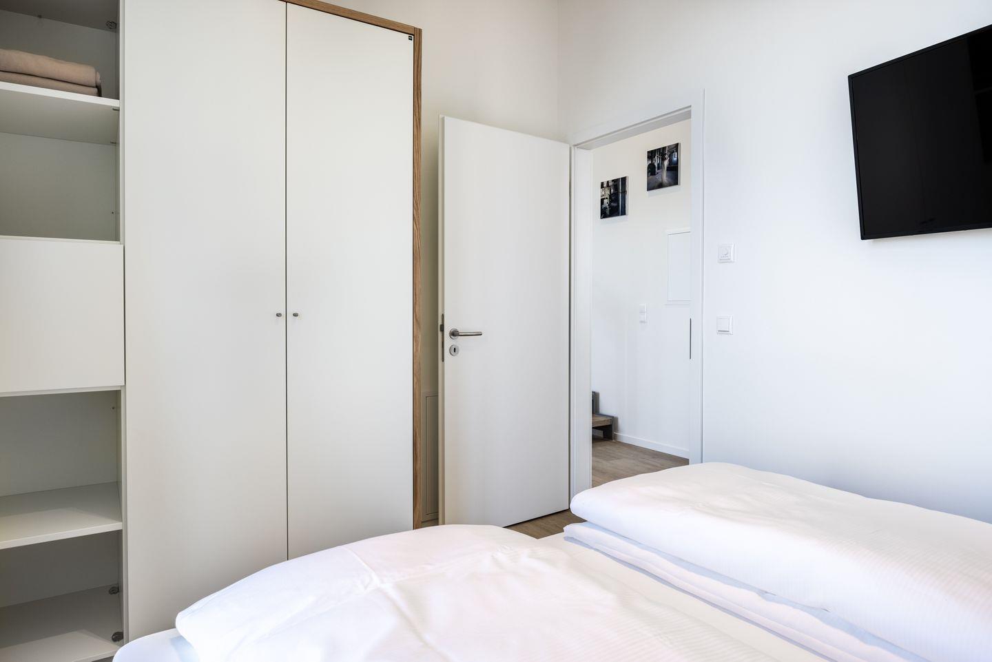 Das helle Apartment verfügt über bodentiefe Fenster, Fußbodenheizung, kostenfreies WLAN und eine voll ausgestattete offene Küche mit Geschirrspüler, Kühlschrank mit Tiefkühlfach, Herd mit 4 Glaskeramikkochfeldern und Backofen, Kaffeemaschine, Toaster, Wasserkocher und Mixstab. Im kombinierten Wohn-Essbereich befinden sich ein Flatscreen-TV (42 Zoll), eine HiFi-Anlage sowie Gesellschaftsspiele. Genießt schöne Stunden auf der Dachterrasse mit direktem Blick zum Hafen. Beide Schlafzimmer beinhalten jeweils ein komfortables Boxspring-Doppelbett (1,80 x 2,00 m) und einen Flatscreen-TV (42 Zoll). Im geschmackvollen Badezimmer stehen euch eine ebenerdige Regendusche, ein Waschtisch, WC, ein Handtuchwärmer sowie ein Föhn zur Verfügung. Das Apartment verfügt über einen Safe für eine Laptopgröße bis ca. 17 Zoll.