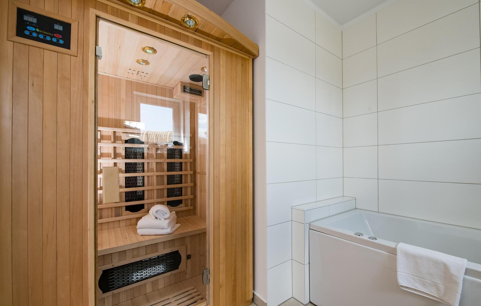 I tillegg til et badekar har badet også en infrarød varmekabine.