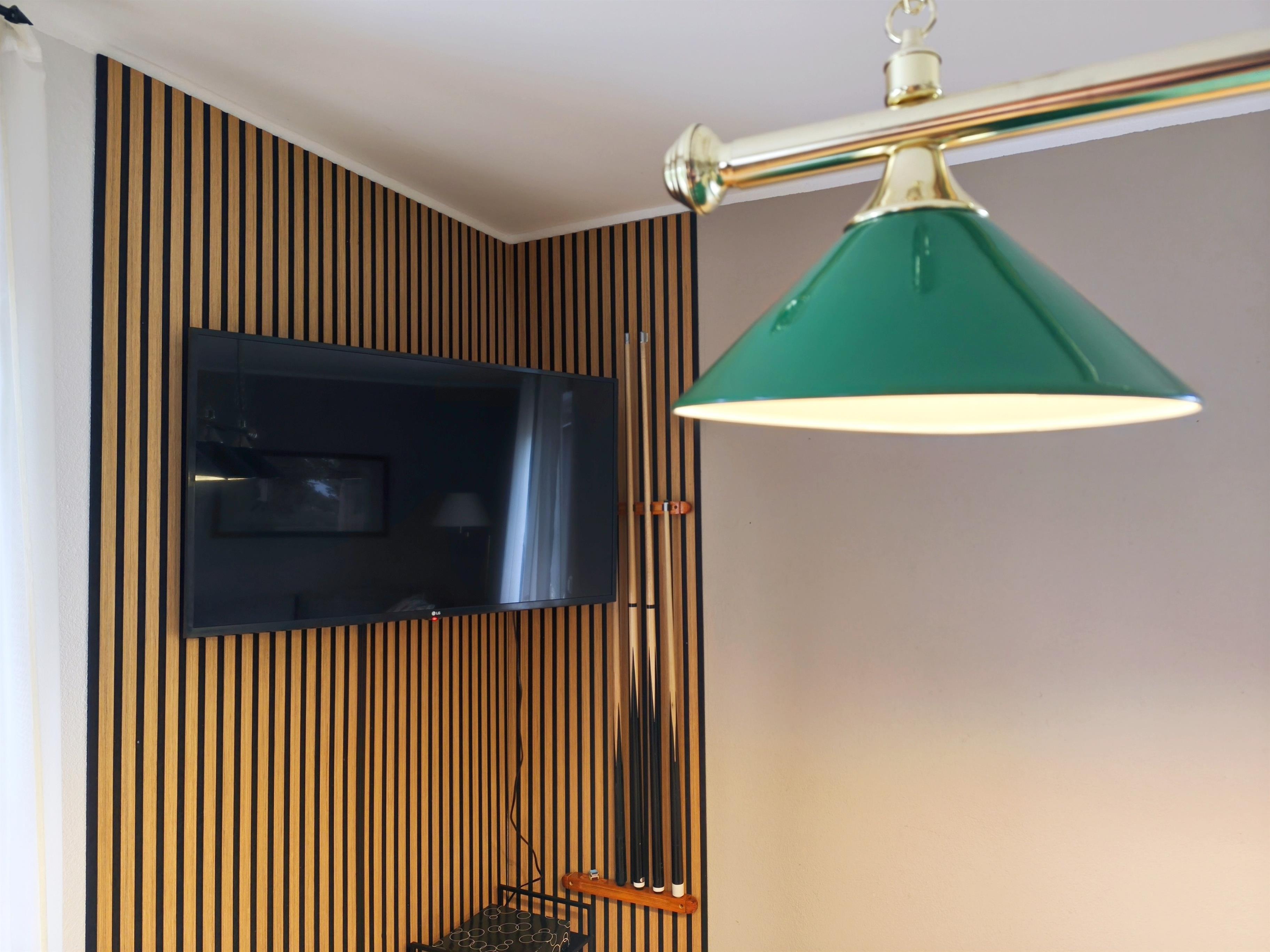 Hier stehen auch der Billardtisch, ein großer Esstisch und eine bequeme Sitzecke für Sie bereit. Netflix and chill auf 43 Zoll oder eigene Konsole an den TV, mit unserem kostenlosem W-LAN ist alles möglich .
