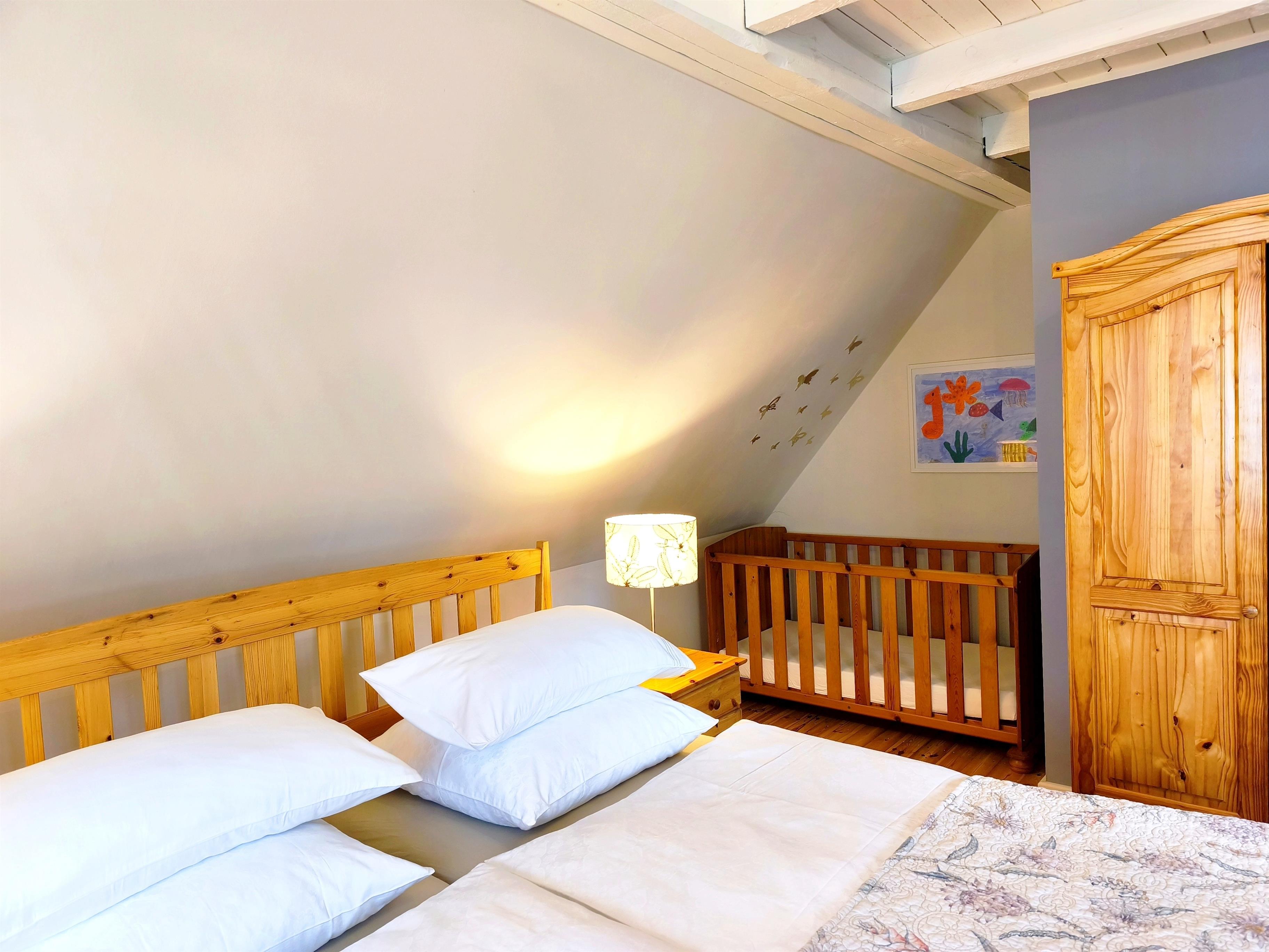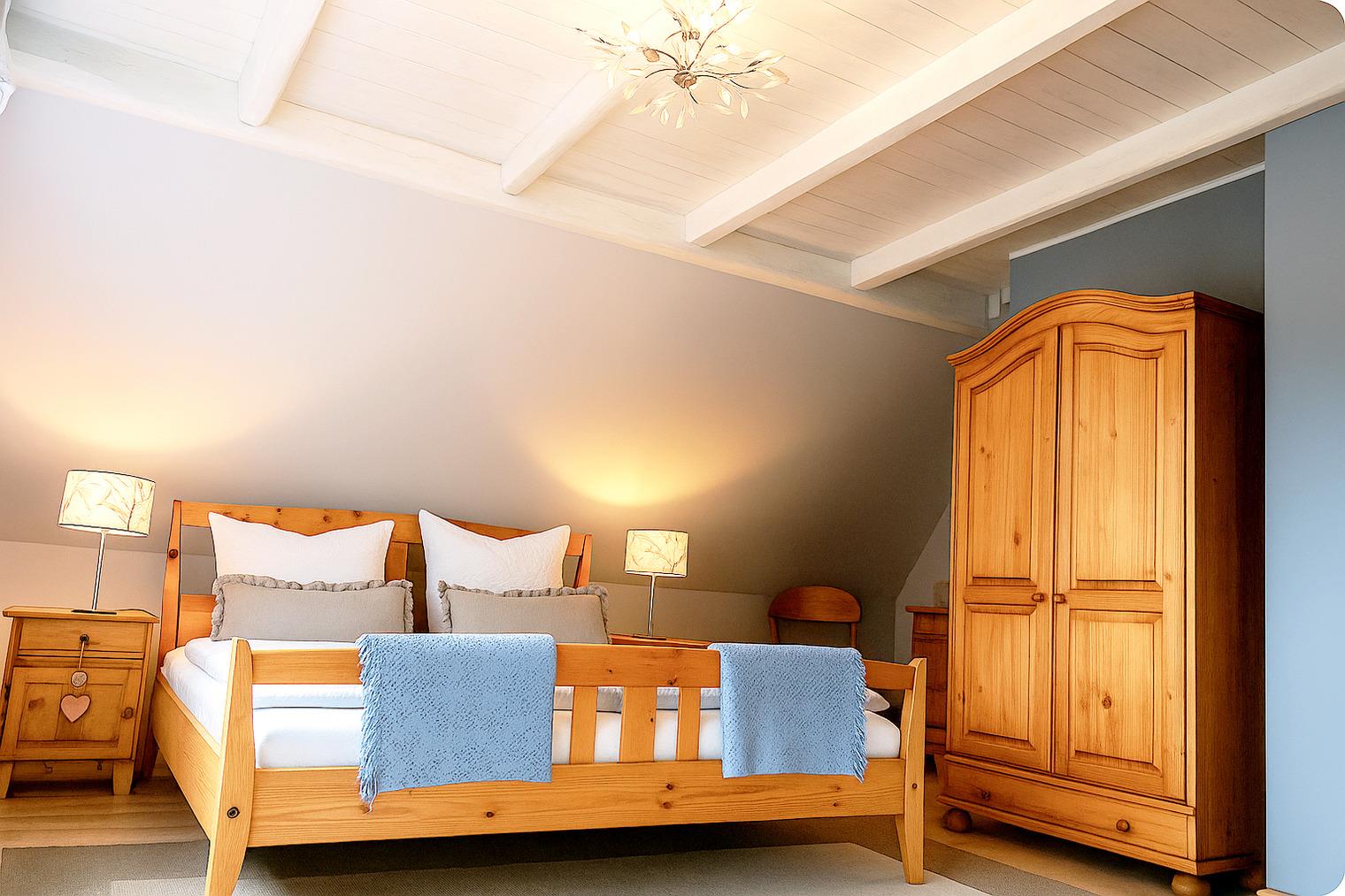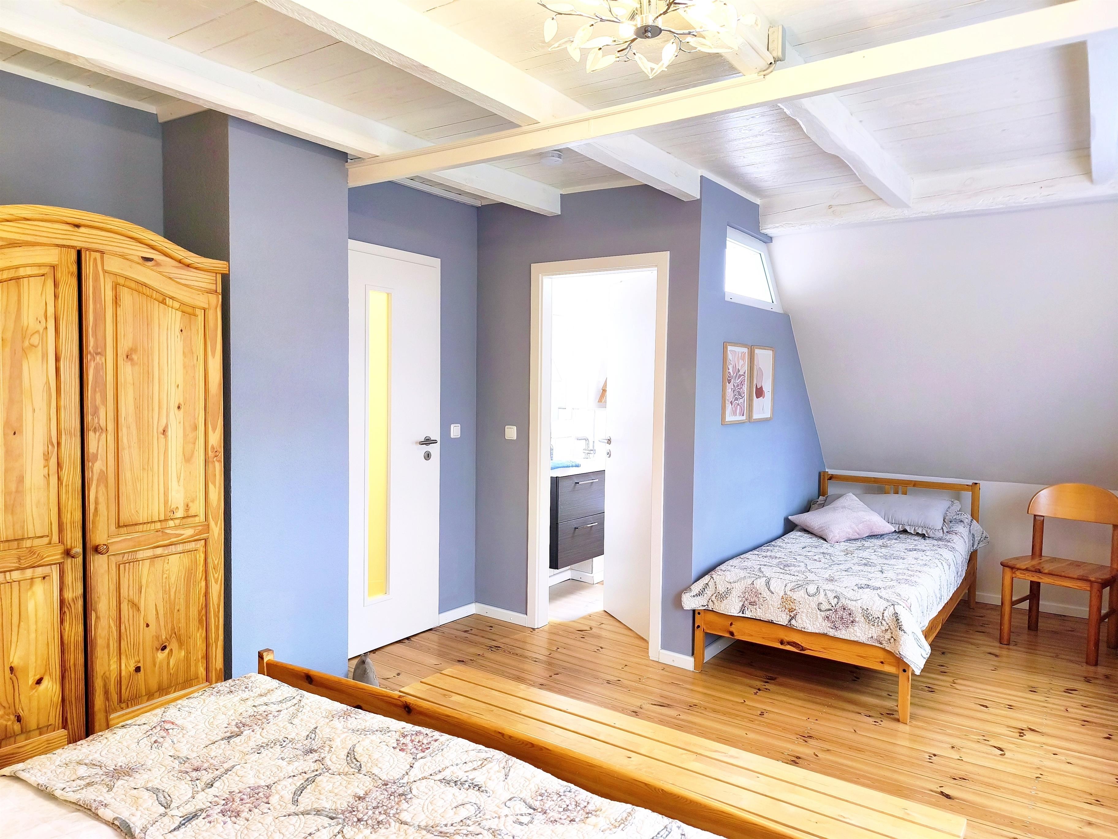 Das große Schlafzimmer mit einem Doppelbett 1,80 x 2,00 m sowie dem Einzelbett 0,90 x 2,00 m befindet sich im Obergeschoss, hier ergänzt durch ein WC en Suite.
