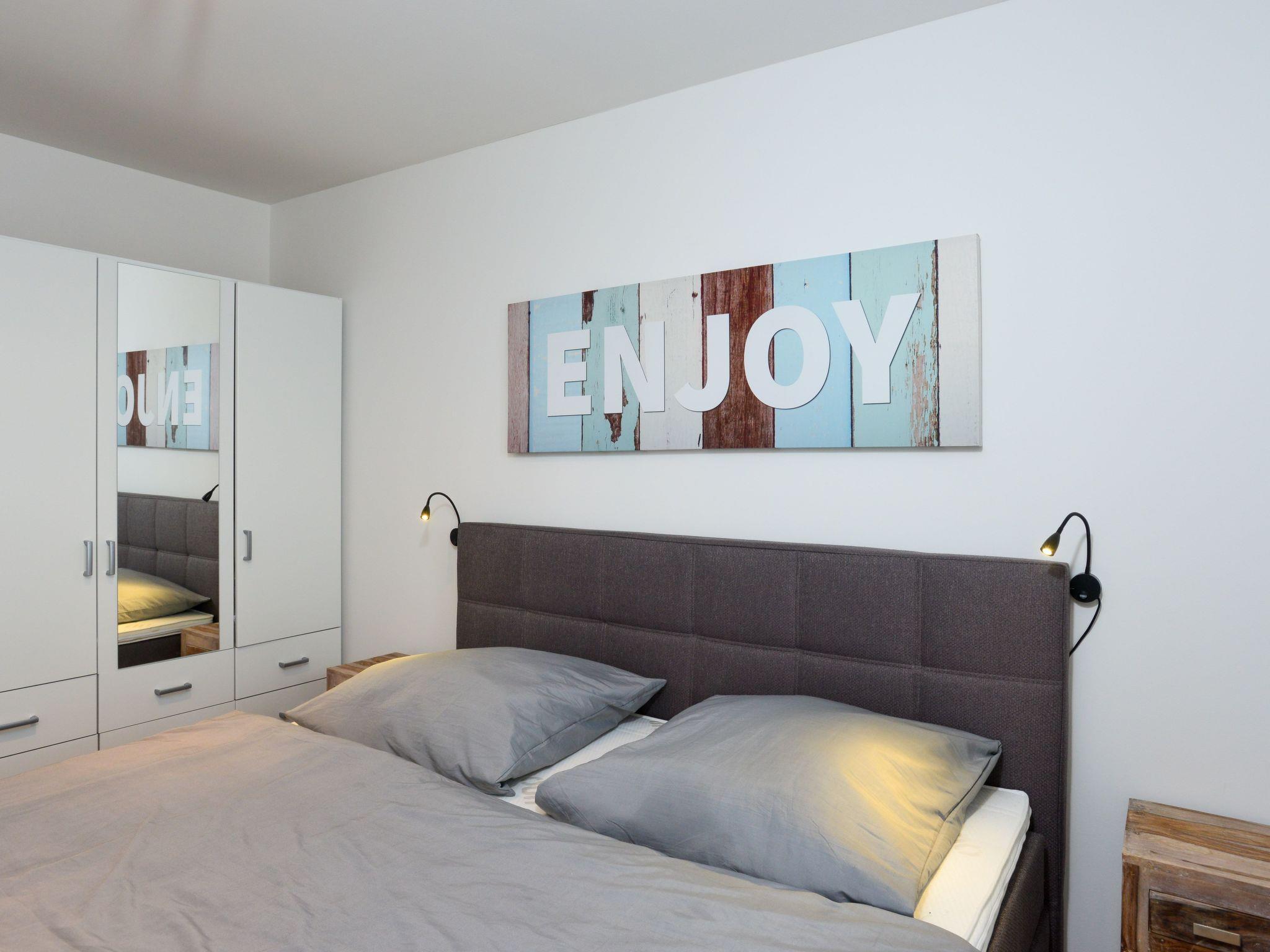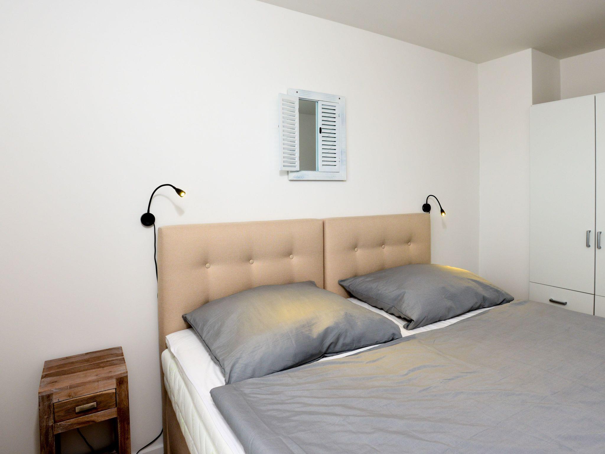 The large bathroom with whirlpool bath and infrared sauna will make your holiday an experience even in bad weather. By the way, infrared is not only something for us humans but is also suitable for dogs. For the bad days there is also a Playstation PS4 pro available, a few games and books are of course also on site. Two beautiful bedrooms with a spacious box spring bed (1 double bed 180*200cm) and 2 single box spring beds offer a relaxed and restful sleep like in a hotel incl. flat screen TV. A baby travel cot is available. A very comfortable sofa bed with slatted frame & visco foam mattress in the living room (lying area 150x200cm) is suitable for 2 additional guests and you wake up with a direct view of the water. The flat has elegant, white double-glazed plastic windows with blackout blinds in the bedroom and living room.