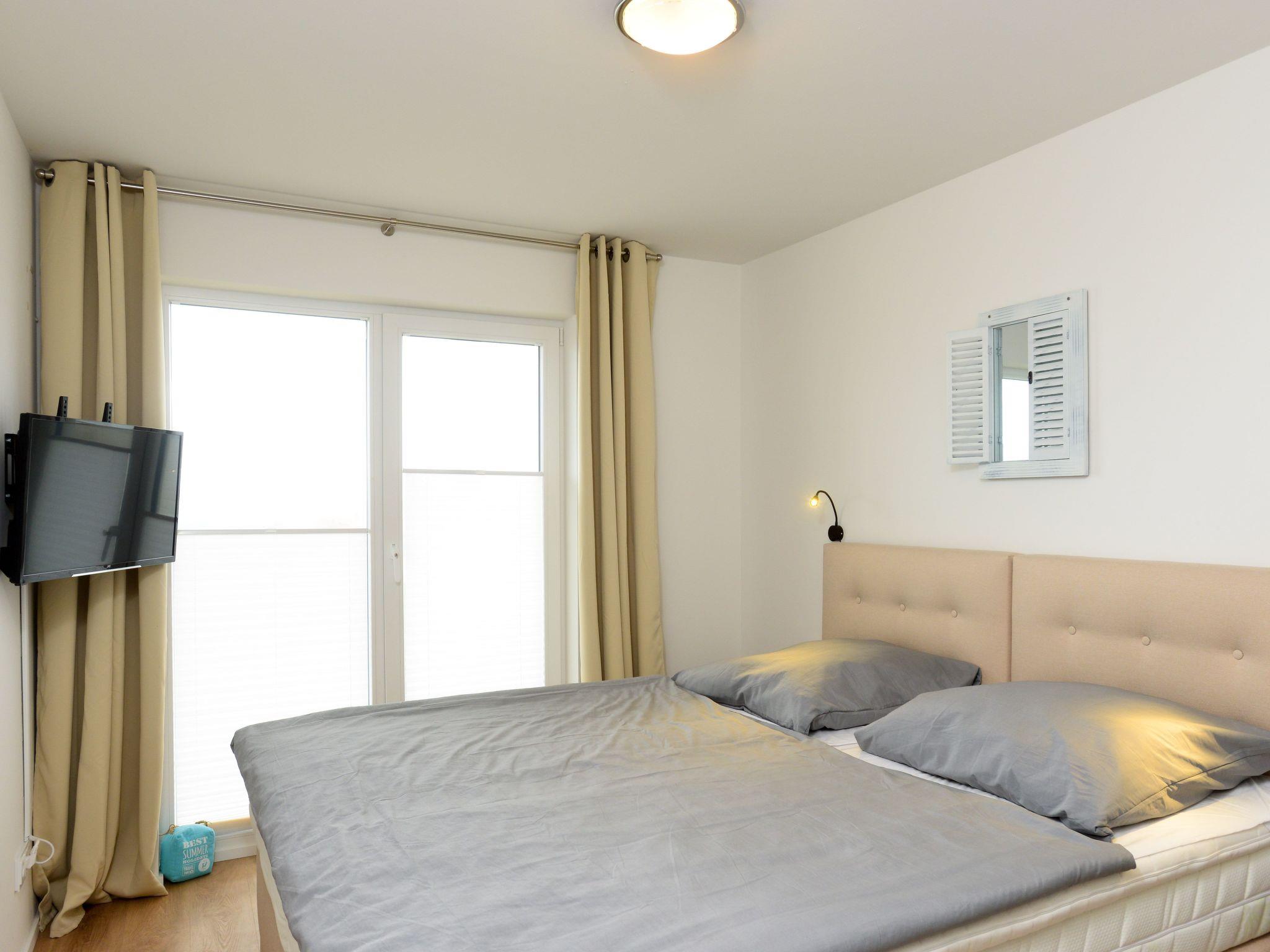 From here you have a magnificent view of the harbour. Two beautiful bedrooms with spacious box-spring beds (1 double bed 180x200cm and 2 single beds 90x200cm) offer a relaxed and restful sleep just like in a hotel, including a flat-screen TV. A baby travel cot is available. A very comfortable sofa bed in the living room (sleeping area 150x200cm) is suitable for 2 additional guests and you wake up with a direct view of the water. The flat has underfloor heating and elegant, white double-glazed plastic windows with blackout blinds in the bedrooms. Of course, your four-legged friend is also welcome here.