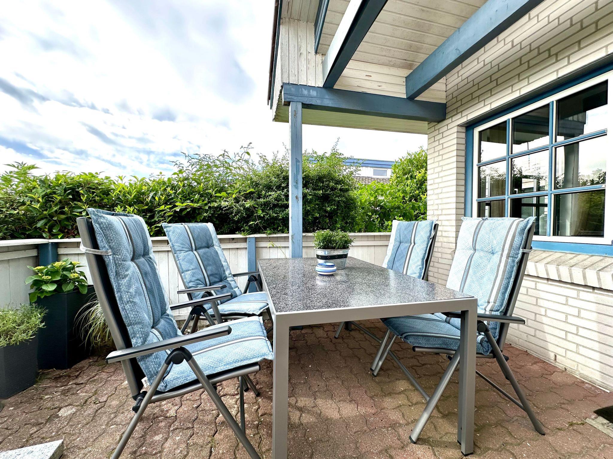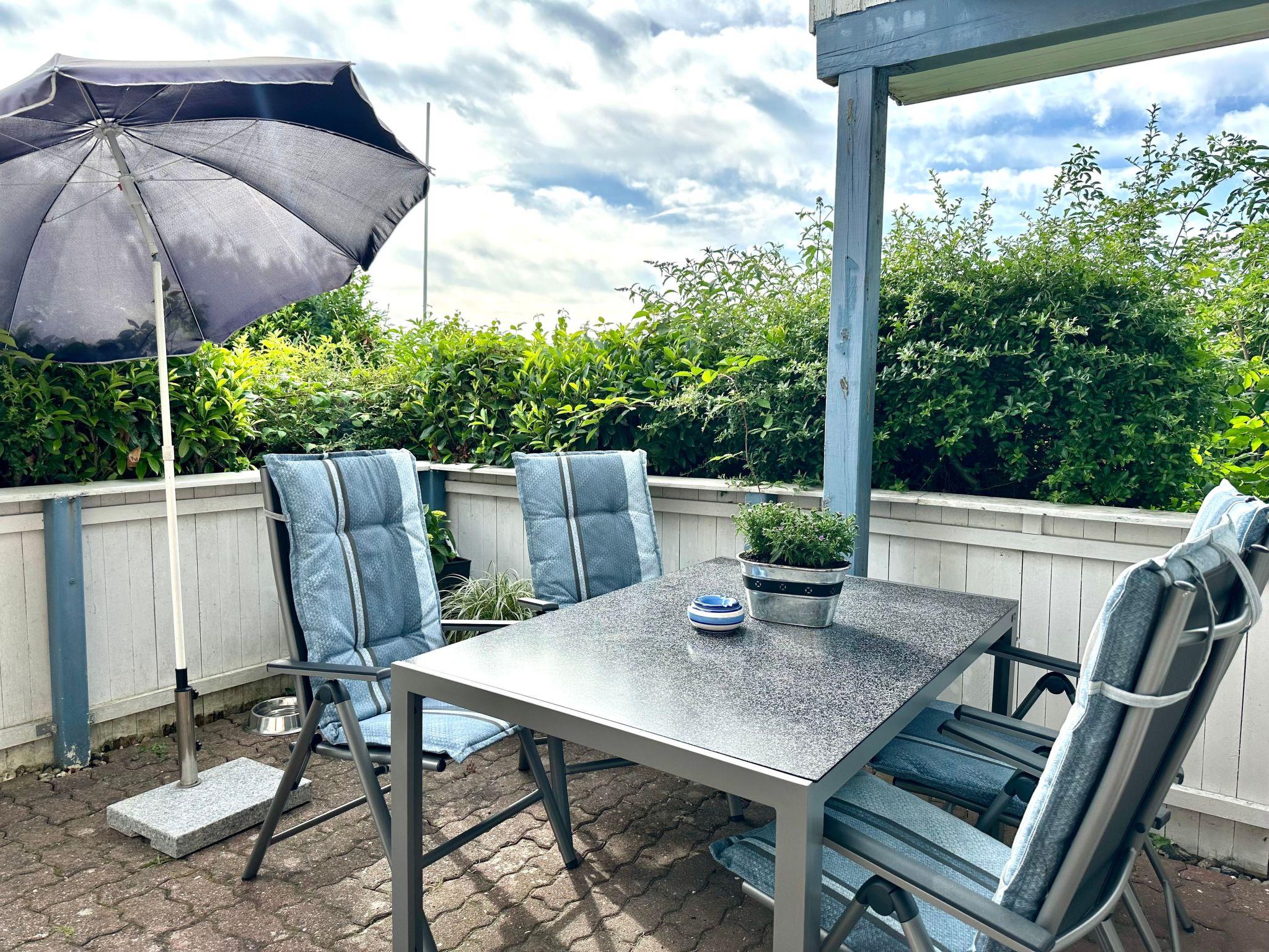 The outdoor area offers a sunny terrace with garden furniture and sun loungers with a view of the small green garden.