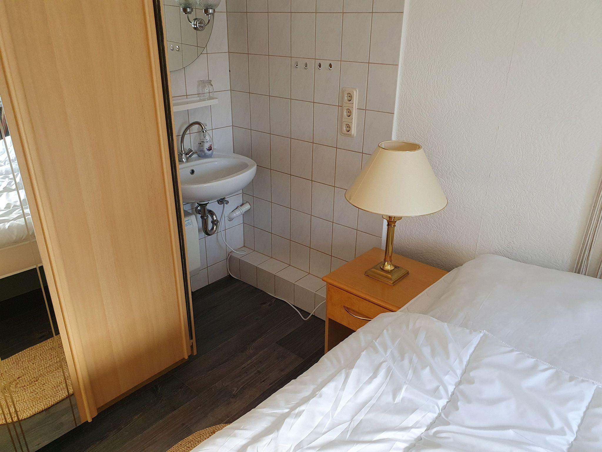 Das separate Schlafzimmer ist über den gemeinsam genutzten Flur mit der Wohnung im Obergeschoss erreichbar und lässt sich abschließen. Hier finden Sie einen praktischen Waschplatz mit Waschbecken und Spiegel. Im Wohnzimmer sorgt ein Smart-TV für Unterhaltung, während Sie dank kostenlosem WLAN im Internet surfen können.
