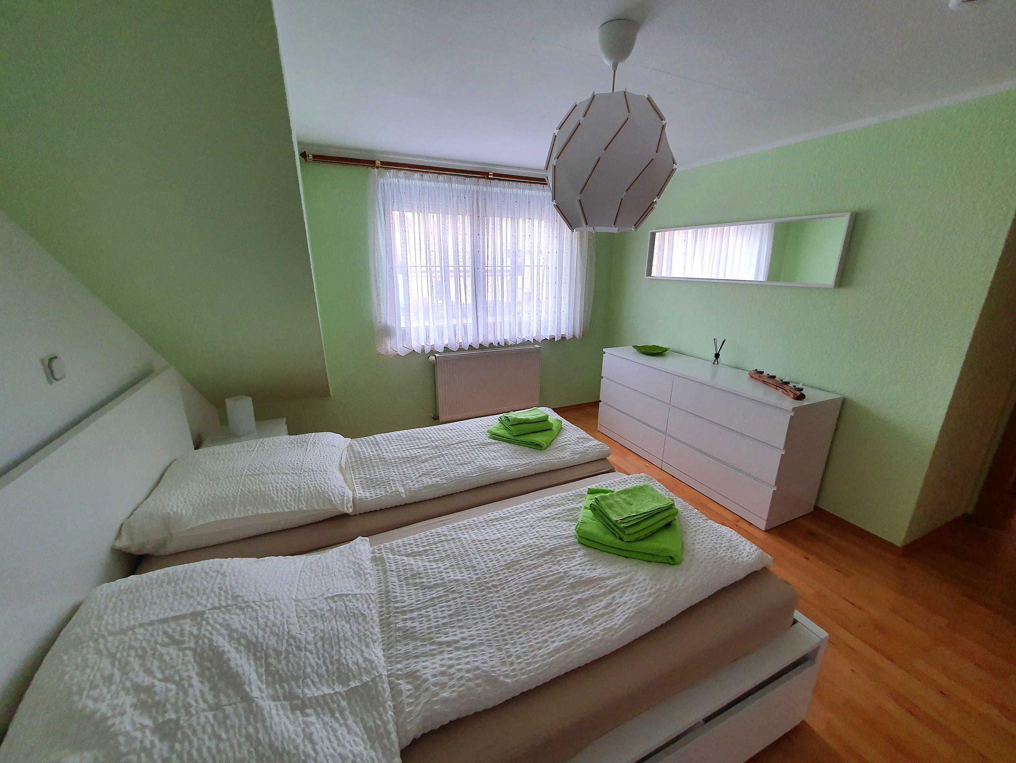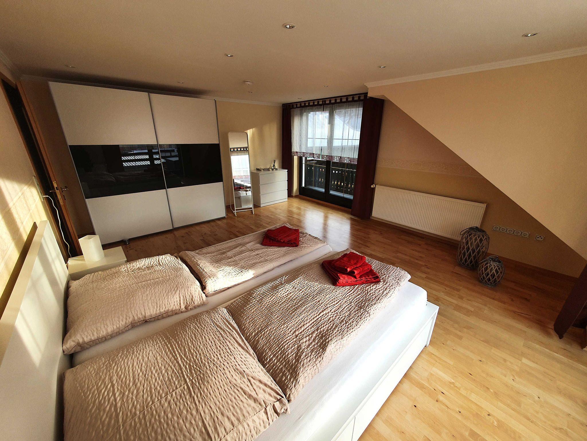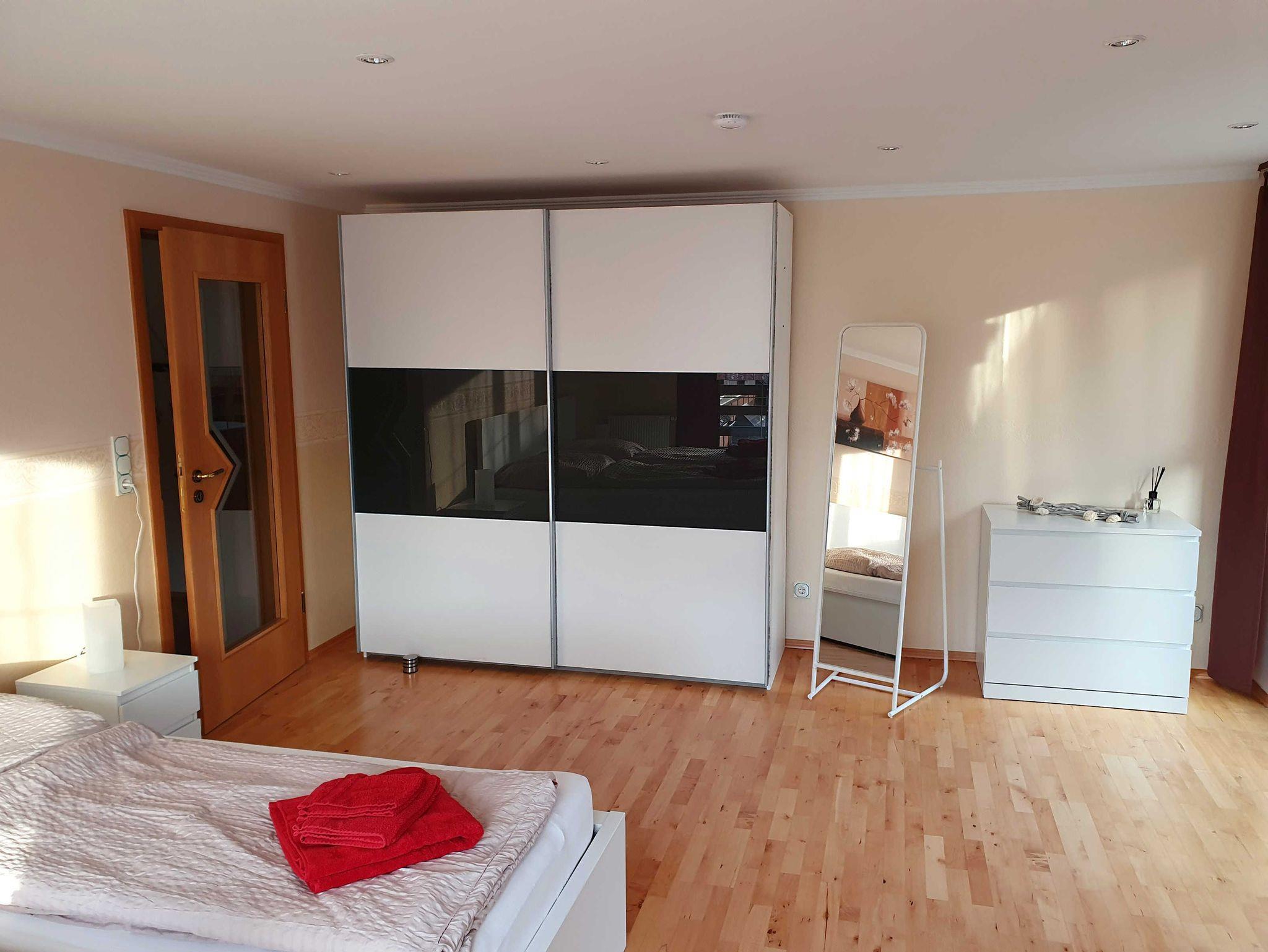 • Schlafzimmer 1 ist ein sehr geräumiges und helles Schlafzimmer mit einem Doppelbett, einem Einzelbett, Kleiderschrank und einem Ganzkörper-Spiegel.