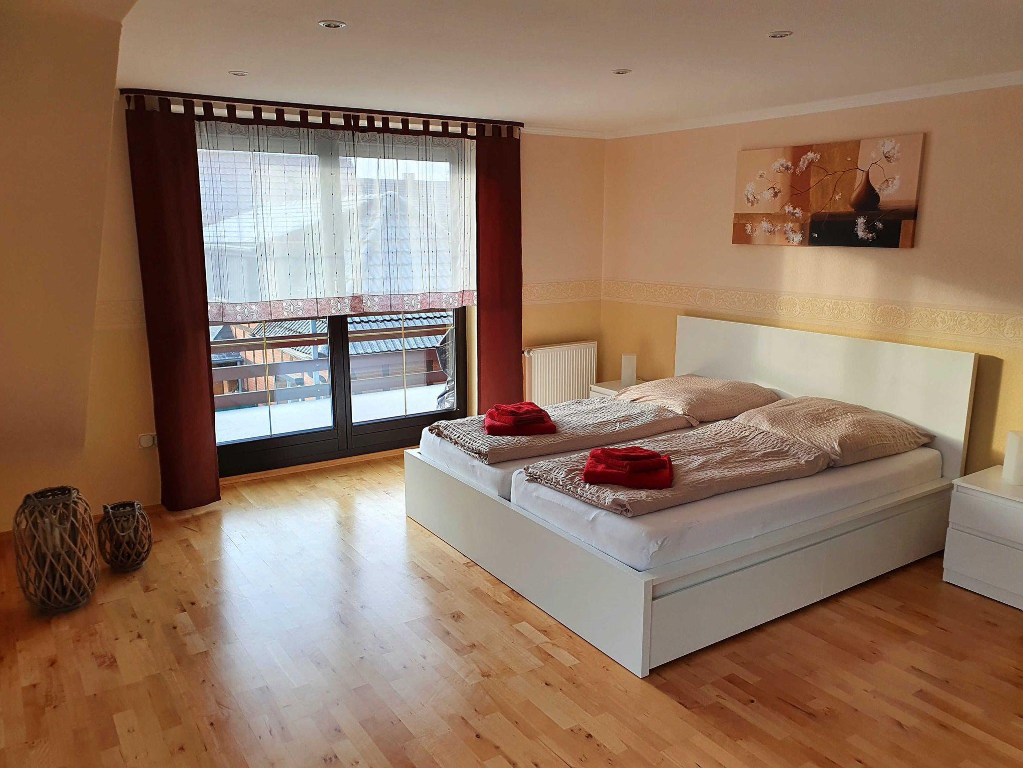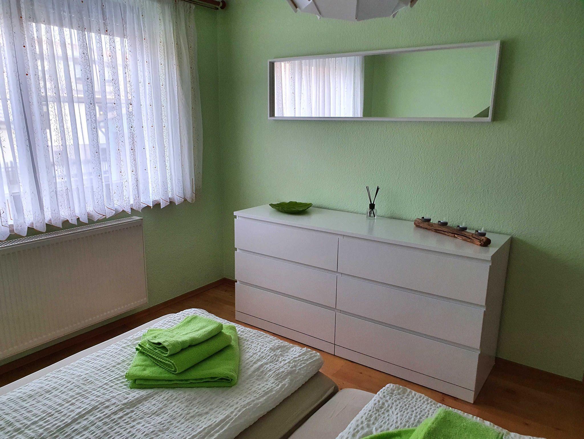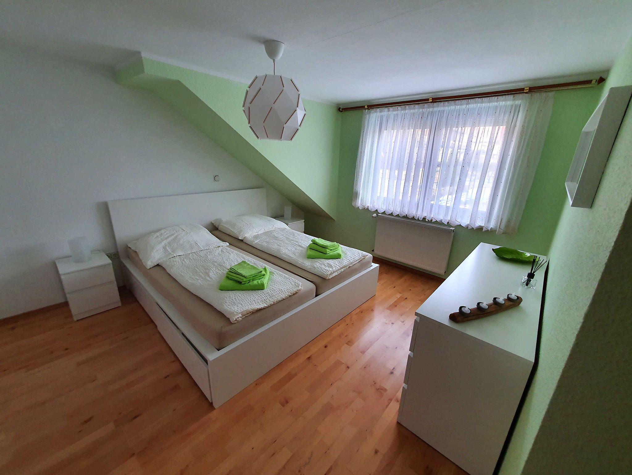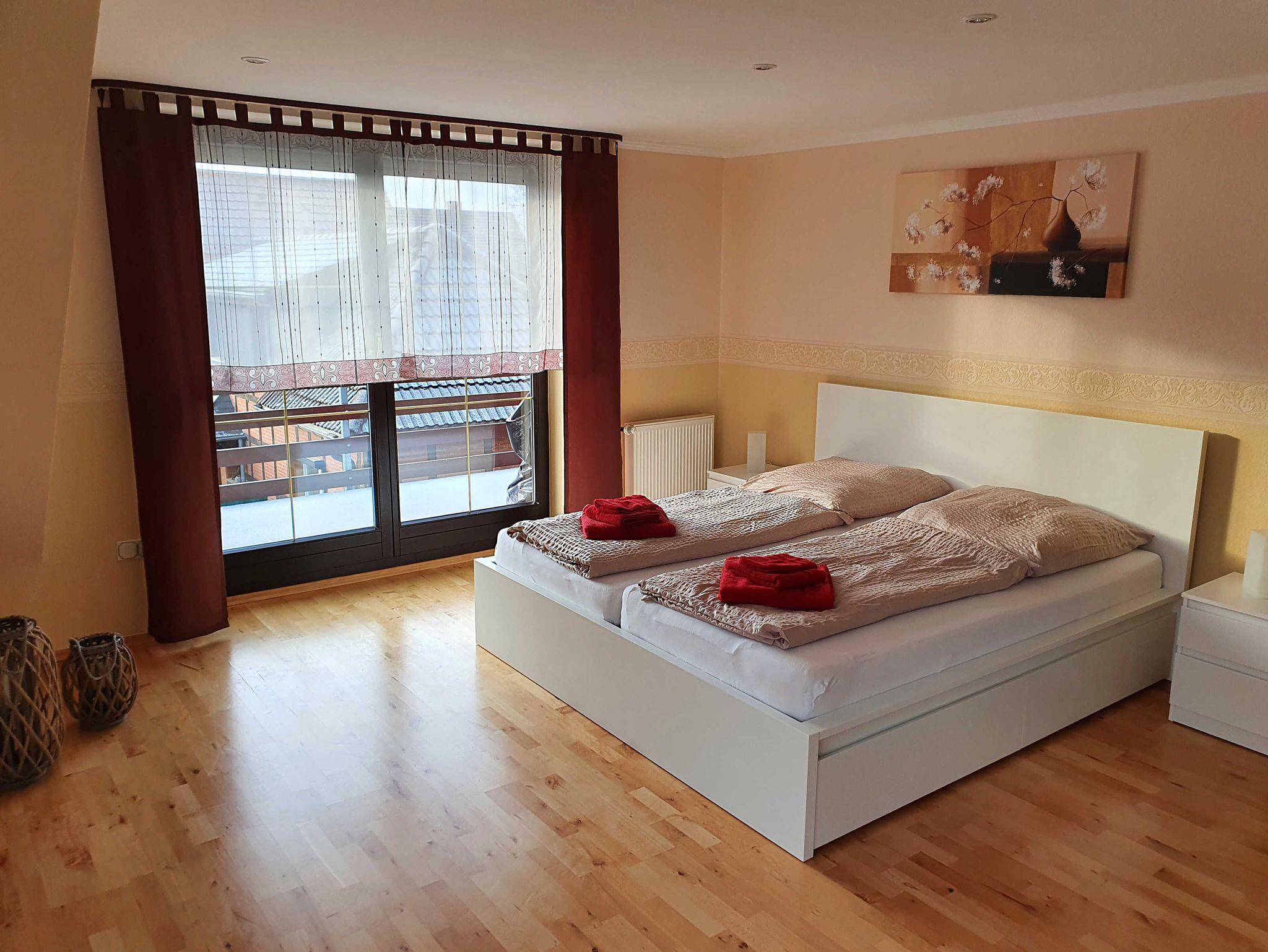 • Schlafzimmer 1 ist ein sehr geräumiges und helles Schlafzimmer mit einem Doppelbett, einem Einzelbett, Kleiderschrank und einem Ganzkörper-Spiegel.