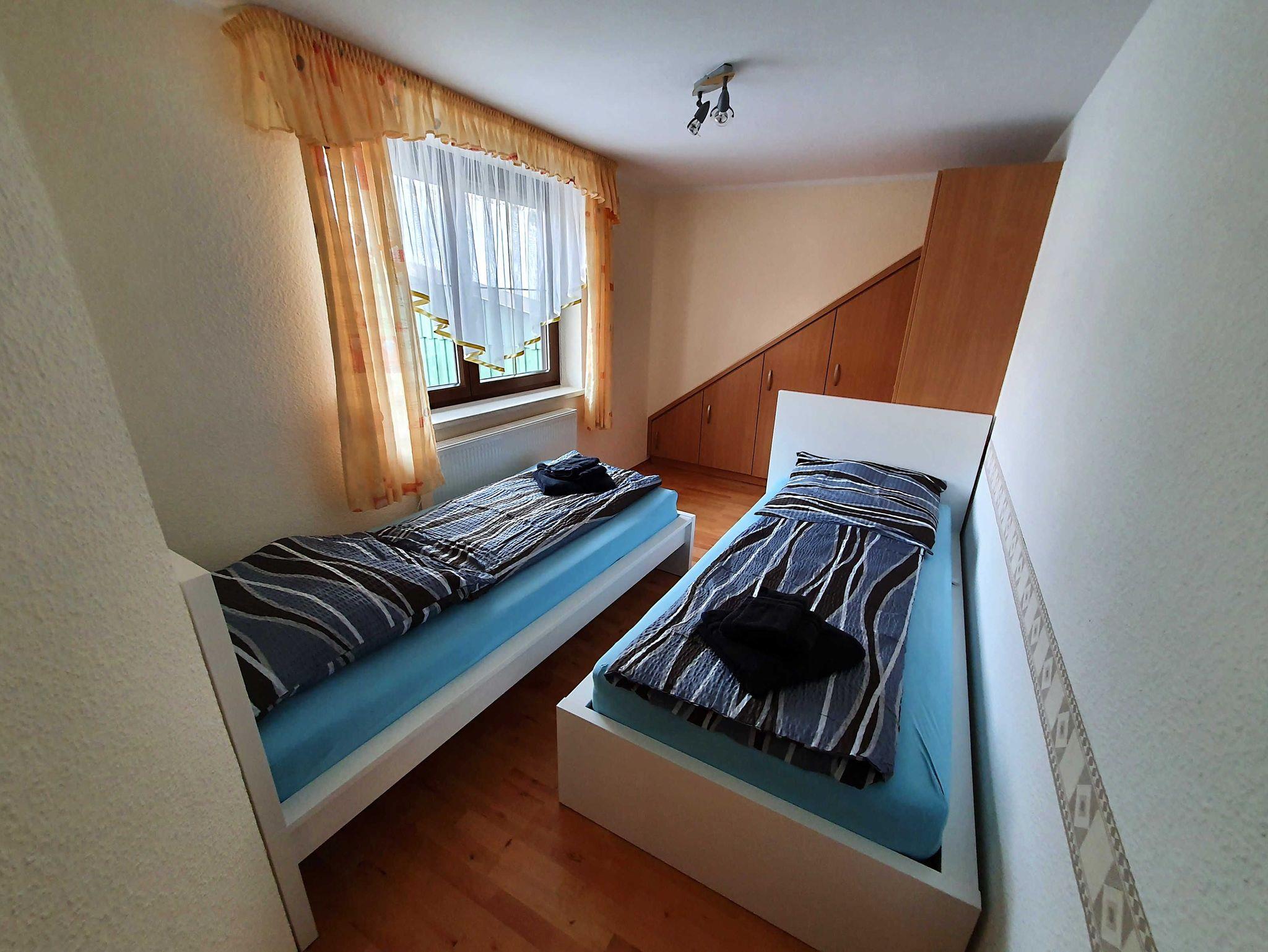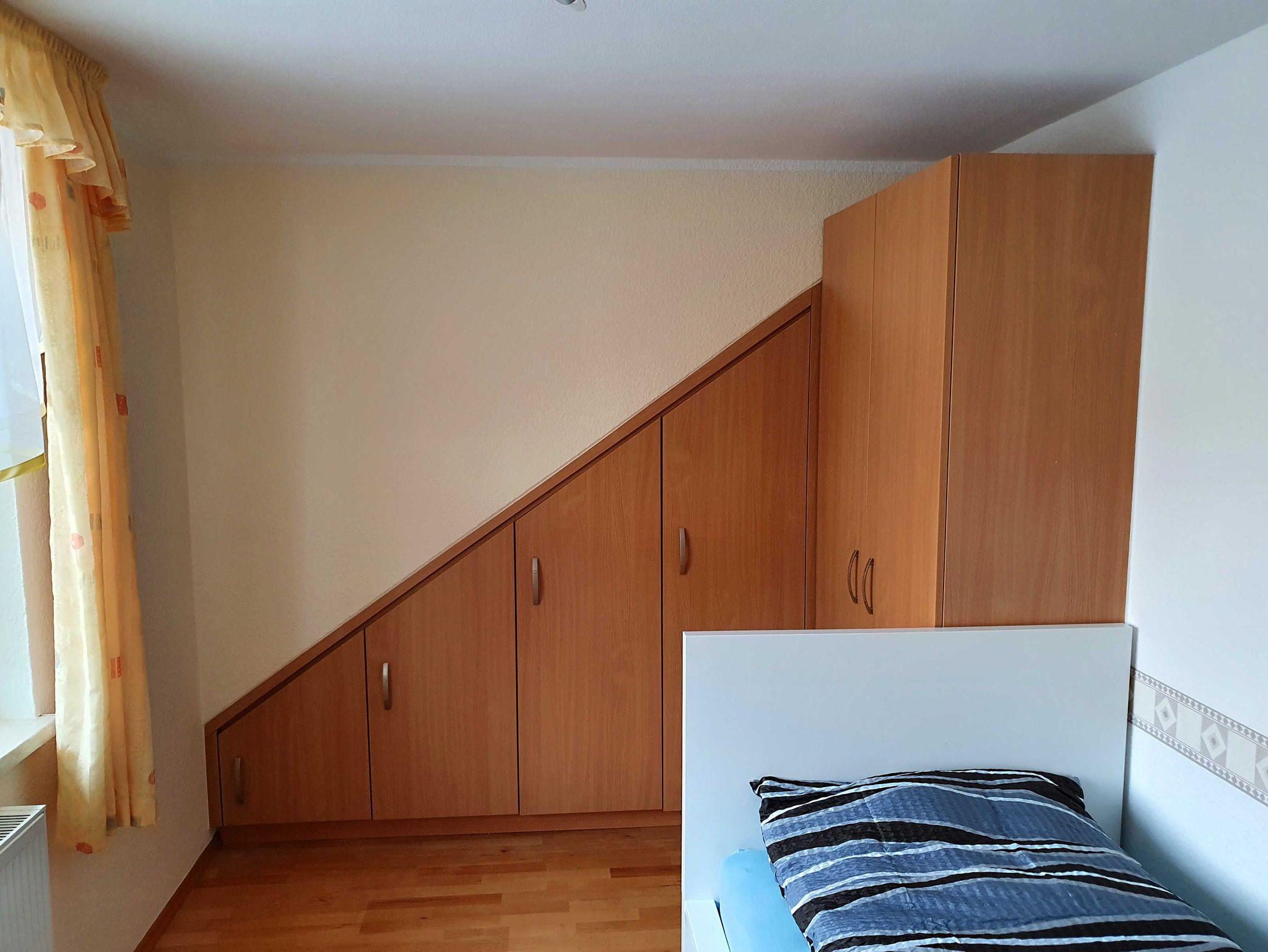 • Schlafzimmer 3 eignet sich als Kinderzimmer und ist sehr schmal geschnitten. In diesem Raum befinden sich zwei Einzelbetten und ein Einbaukleiderschrank.