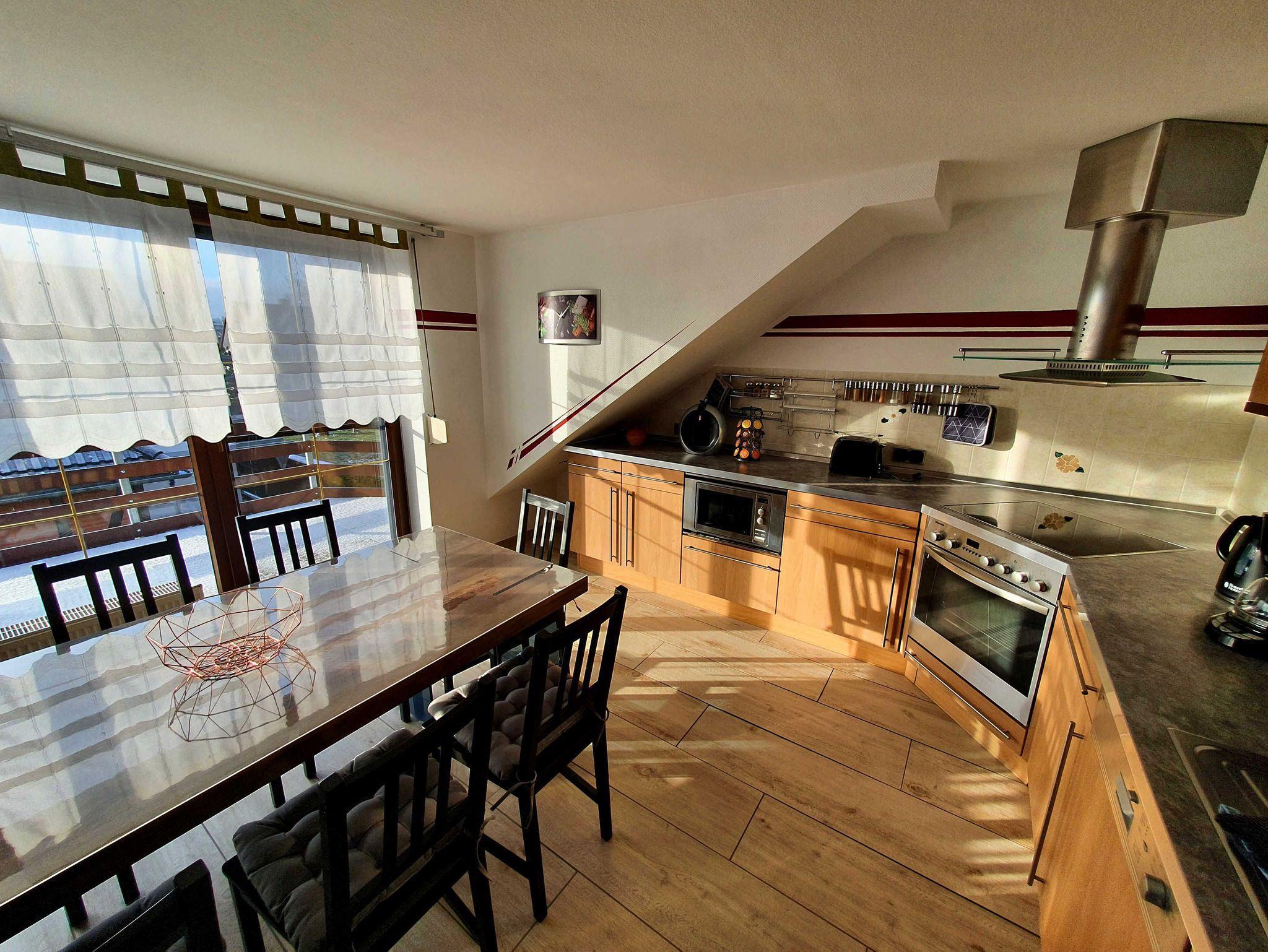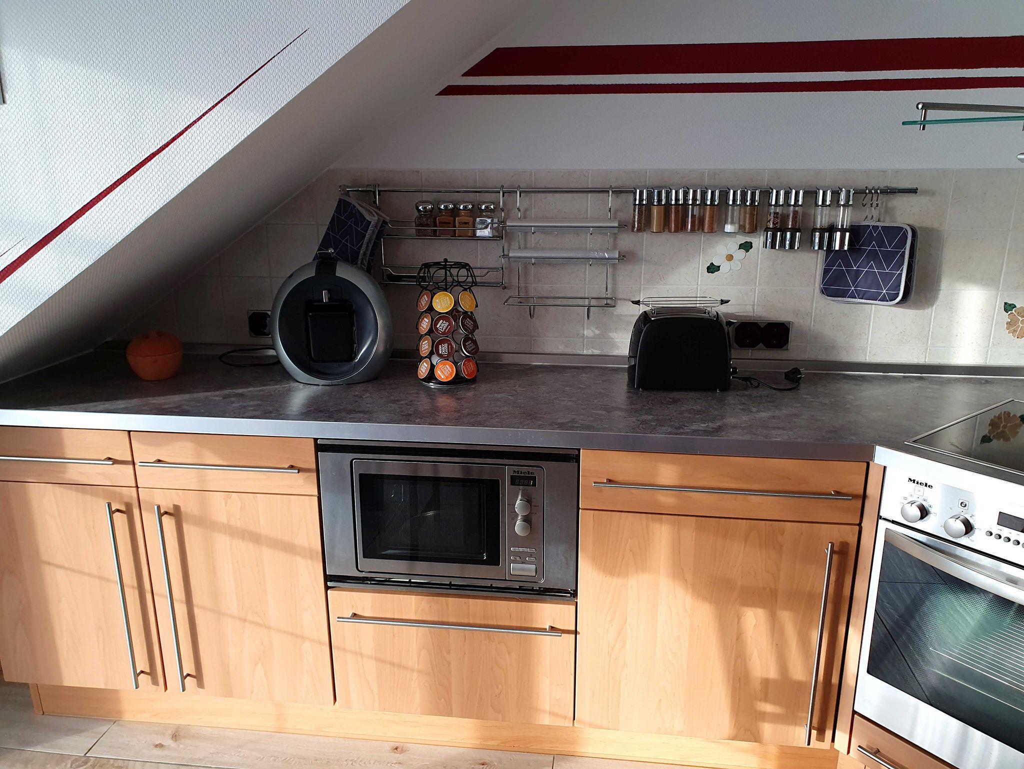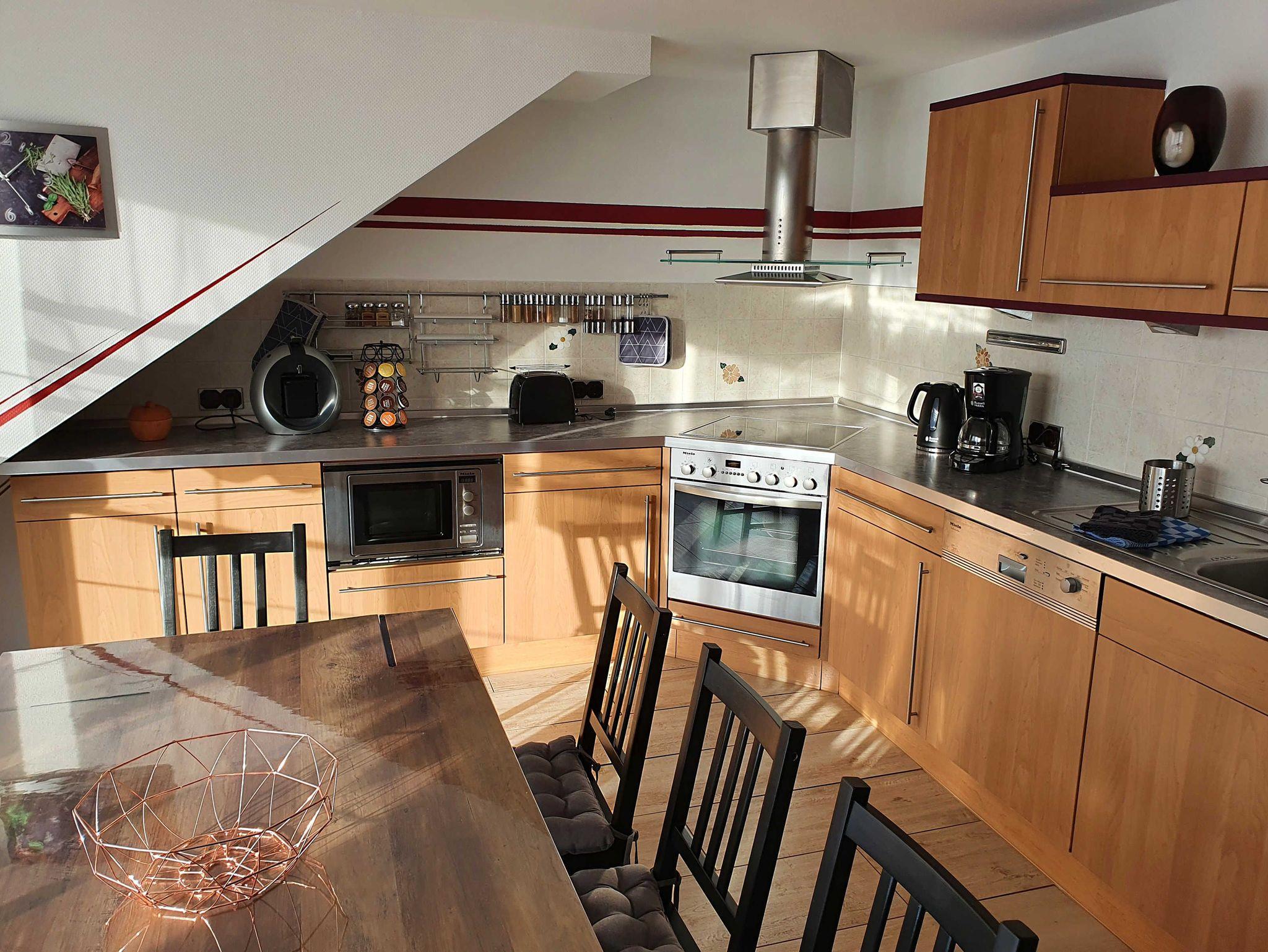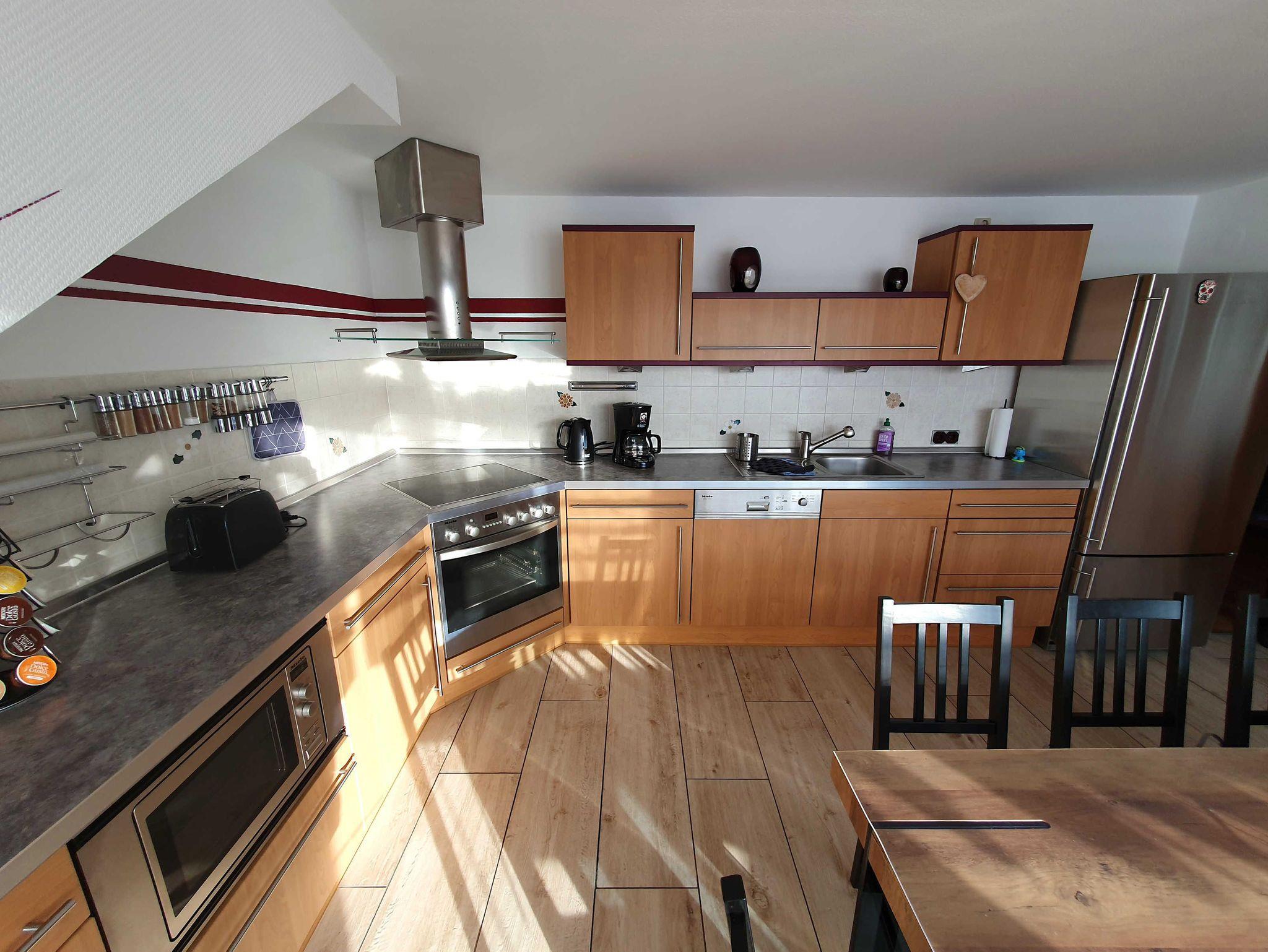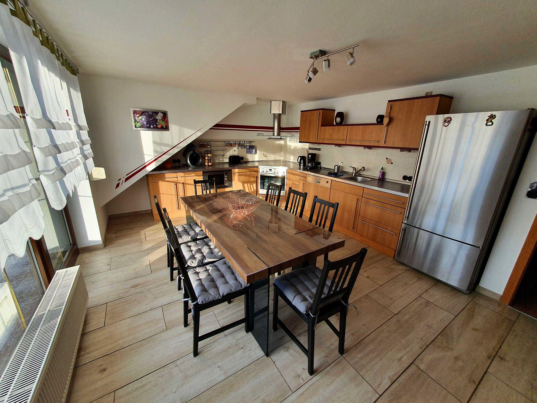 Das Dachgeschoss teilt sich in die drei Schlafzimmer und die moderne Küche sowie ein weiteres Bad mit Badewanne auf. An die Küche grenzt der großzügige Balkon.