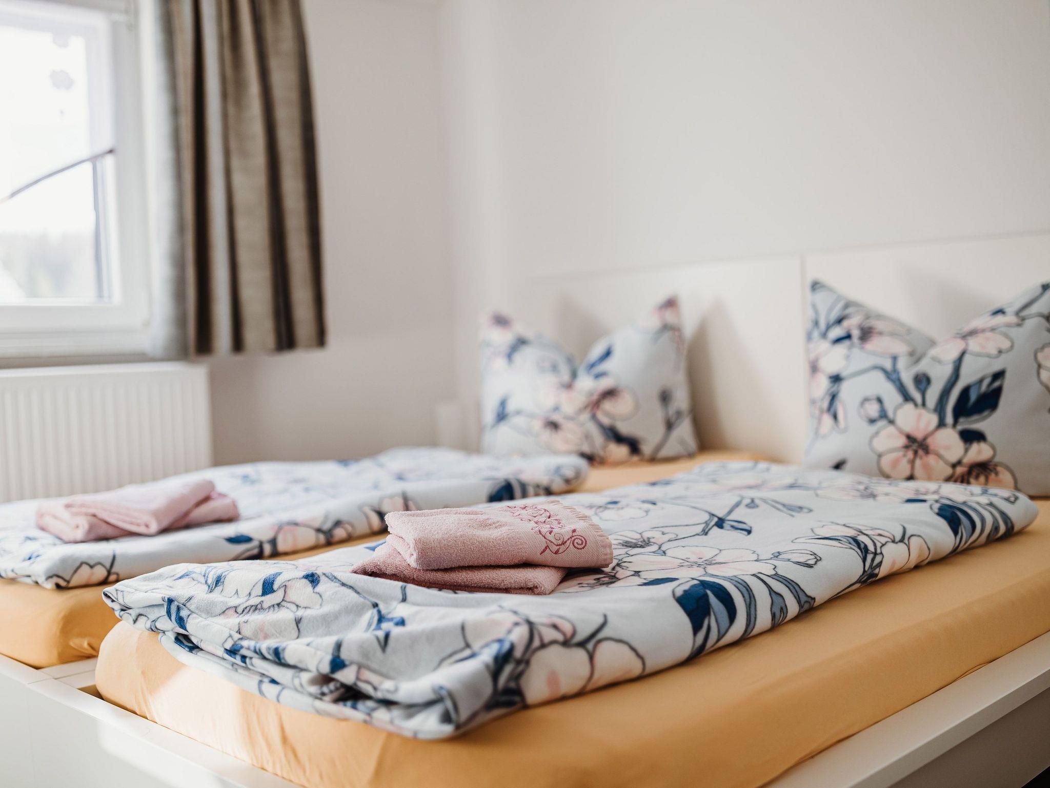 Erleben Sie einen unvergesslichen Urlaub in unserer Ferienwohnung 1 mit Balkon und Sitzmöbeln. Sie befindet sich im 1. Obergeschoss des Hauses. Die geräumige Unterkunft bietet Platz für bis zu 5 Personen und verfügt über ein Schlafzimmer mit Doppelbett und Einzelbett sowie ein weiteres Schlafzimmer mit zwei Einzelbetten. In jedem Schlafzimmer befindet sich ein weiterer Flach-TV. Das Wäschepaket ist im Reisepreis bereits inkludiert.