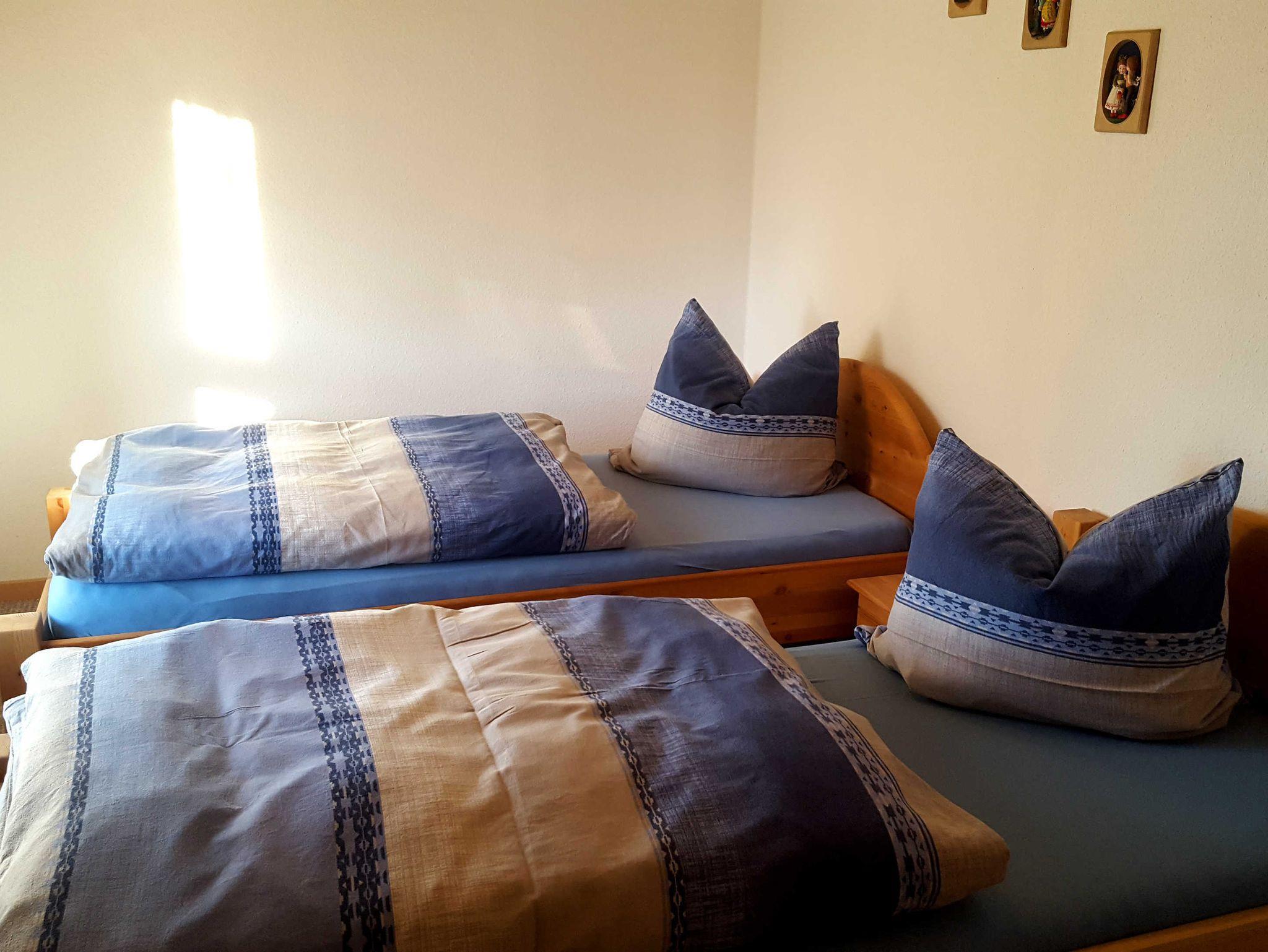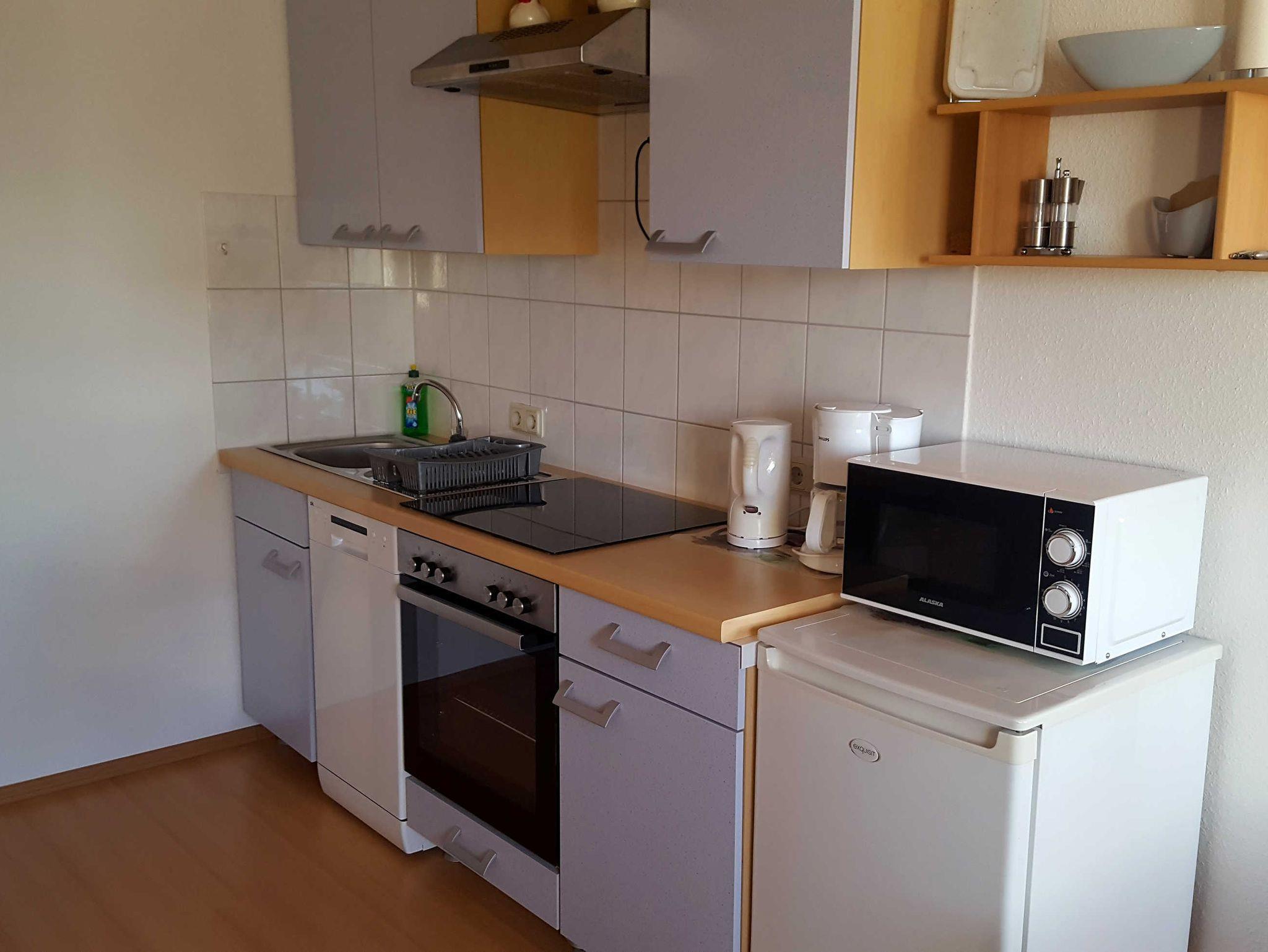 Die Ferienwohnung ist eine 3-Raumwohnung im 1. Obergeschoss mit einem Wohnzimmer, offener Küche mit Mikrowelle, Geschirrspüler und einem Esstisch. Vom Wohnzimmer aus gelangen Sie auf den Balkon. Über zwei Stufen erreichen Sie die 2 Schlafzimmer mit einem Doppelbett bzw. 2 Einzelbetten. Desweiteren ist noch Platz für 1 Kind bis 3 Jahre im Kinderreisebett. Das Bad verfügt über eine Dusche und ein WC, sowie einem Waschplatz. Angeboten wird WLAN über HOT Spot. Die Wohnung ist eine Nichtraucherwohnung. Ein Bügelbrett gehört ebenfalls zur Ausstattung der Wohnung.