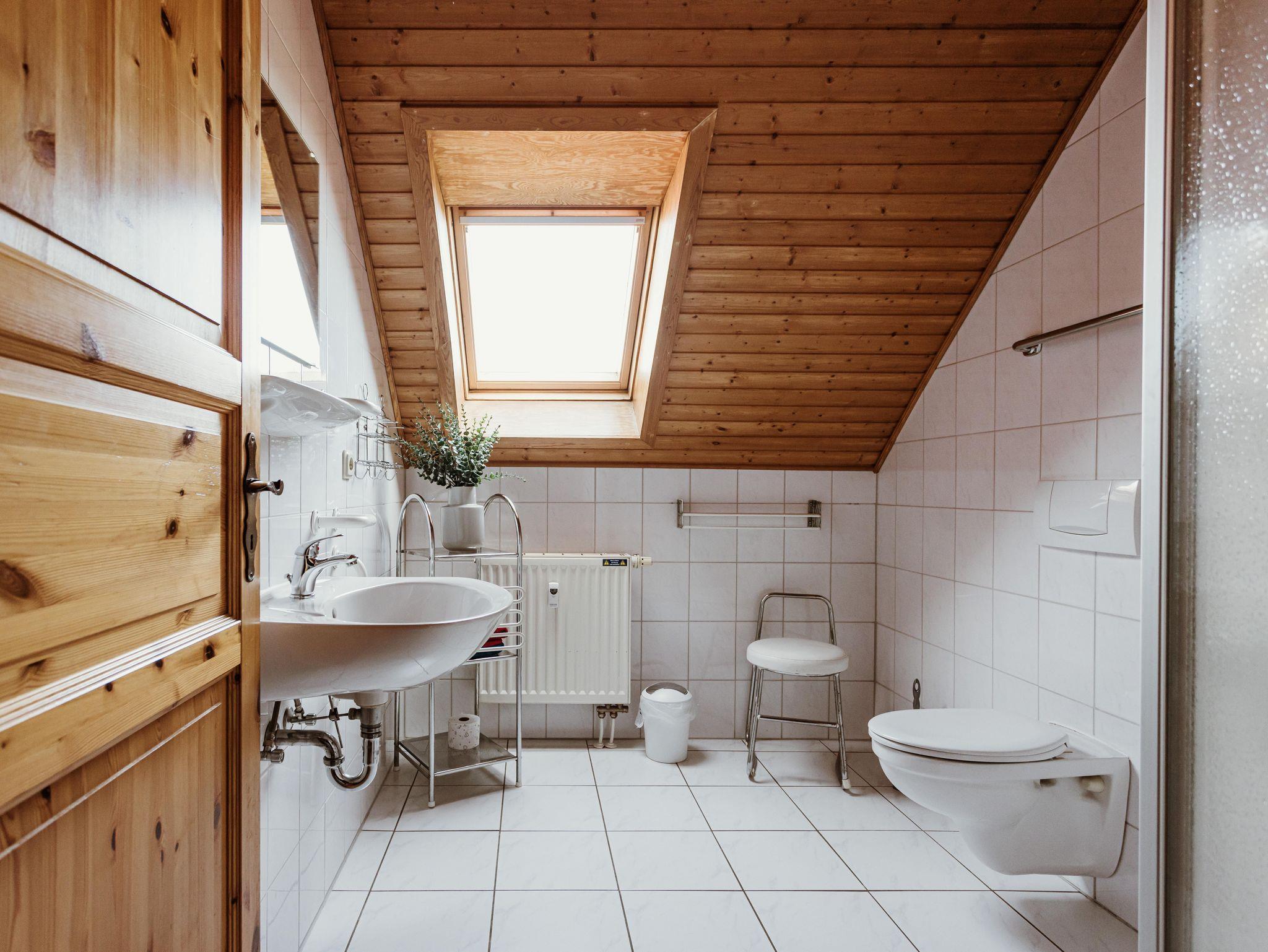 Im Dachgeschoss befinden sich ein Schlafzimmer mit Doppelbett, ein Schlafzimmer mit zwei getrennten Betten sowie ein Bad mit Dusche und WC. Ein Kinderbett und ein Hochstuhl sind vorhanden, ebenso wie Bügeleisen, Bügelbrett und ein Steinplattengrill.