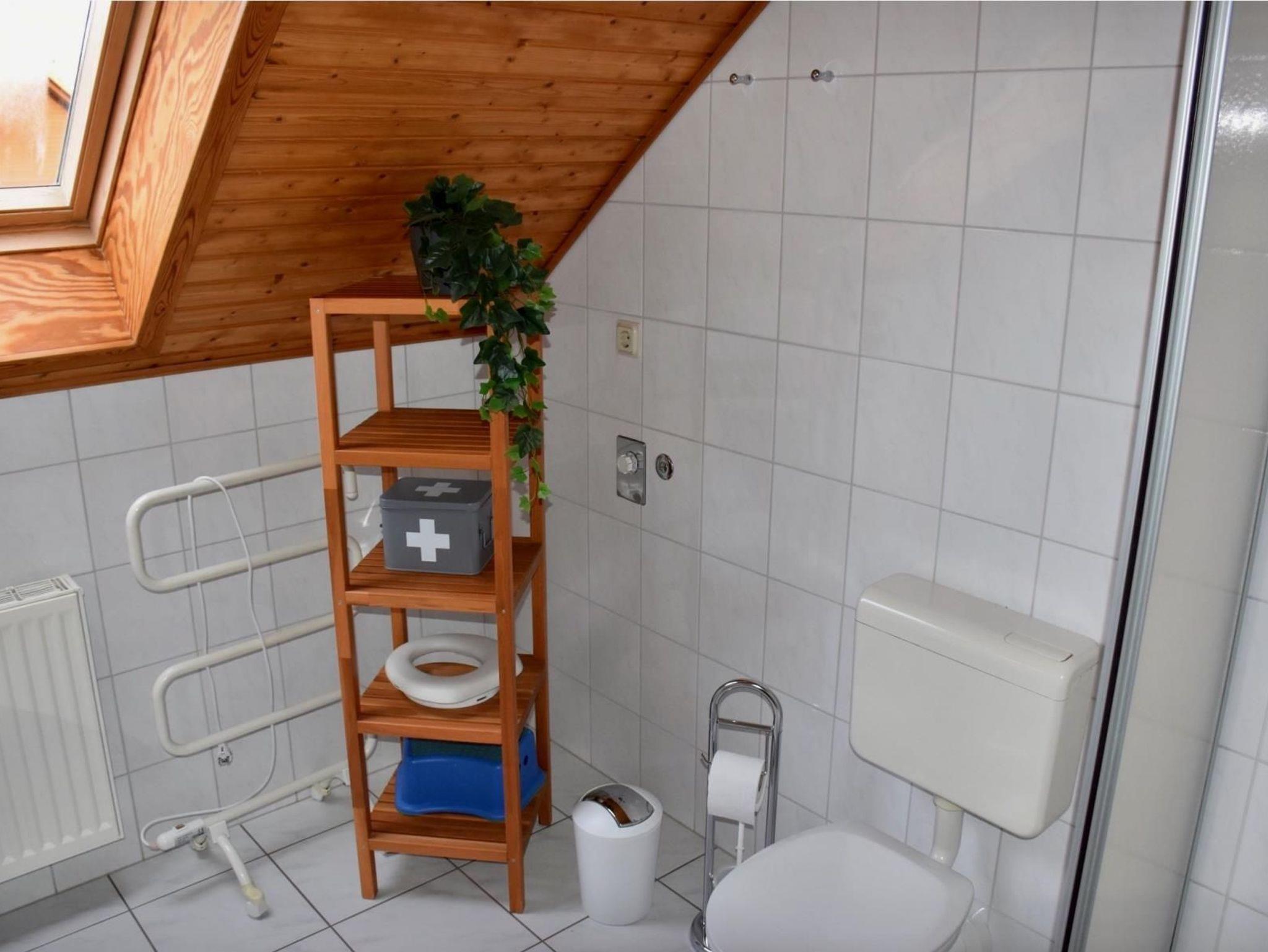 Das Badezimmer ist mit Dusche, WC und zwei Waschbecken ausgestattet; zusätzlich steht im Erdgeschoss ein Gäste-WC zur Verfügung.