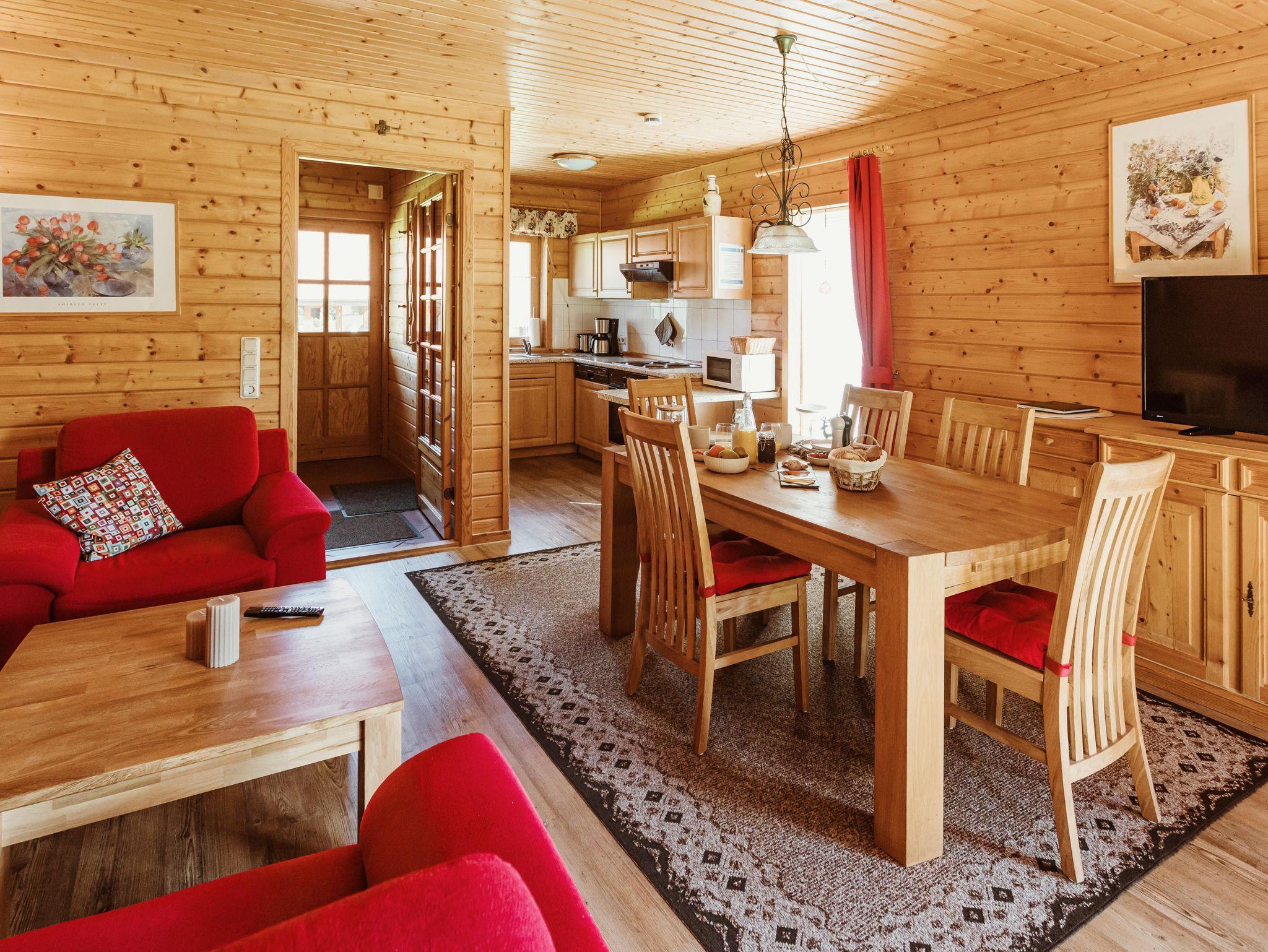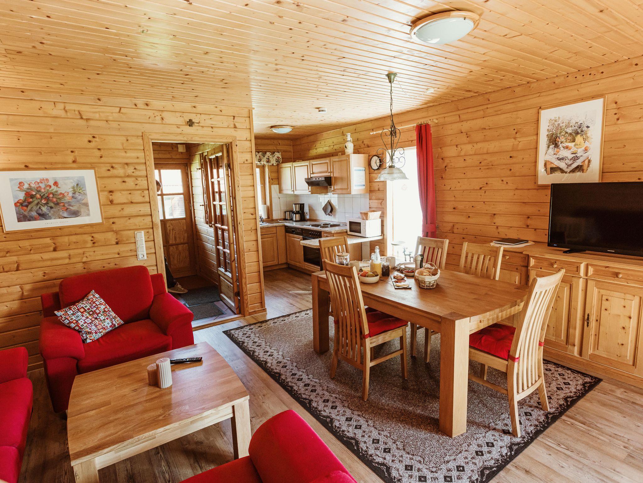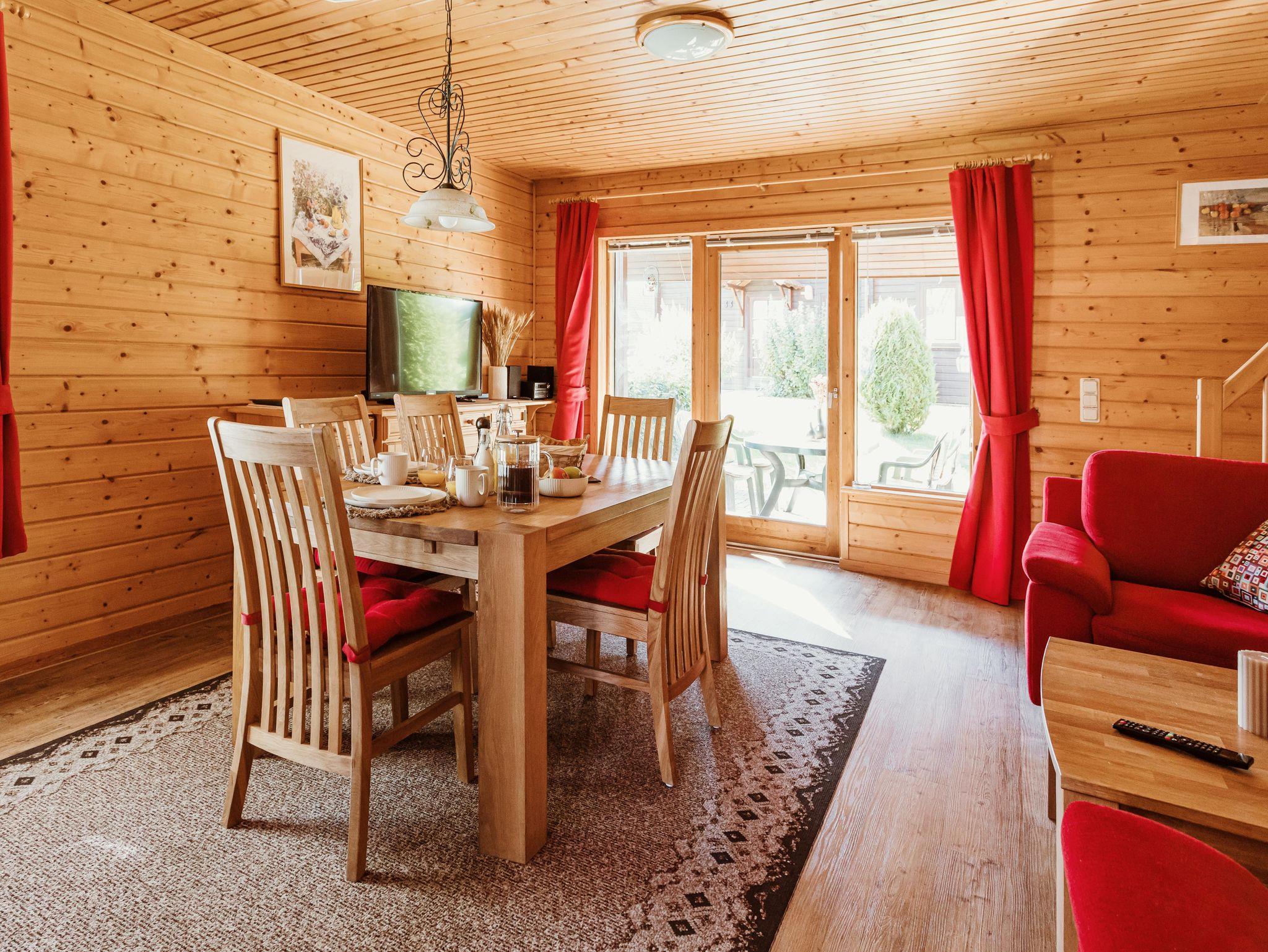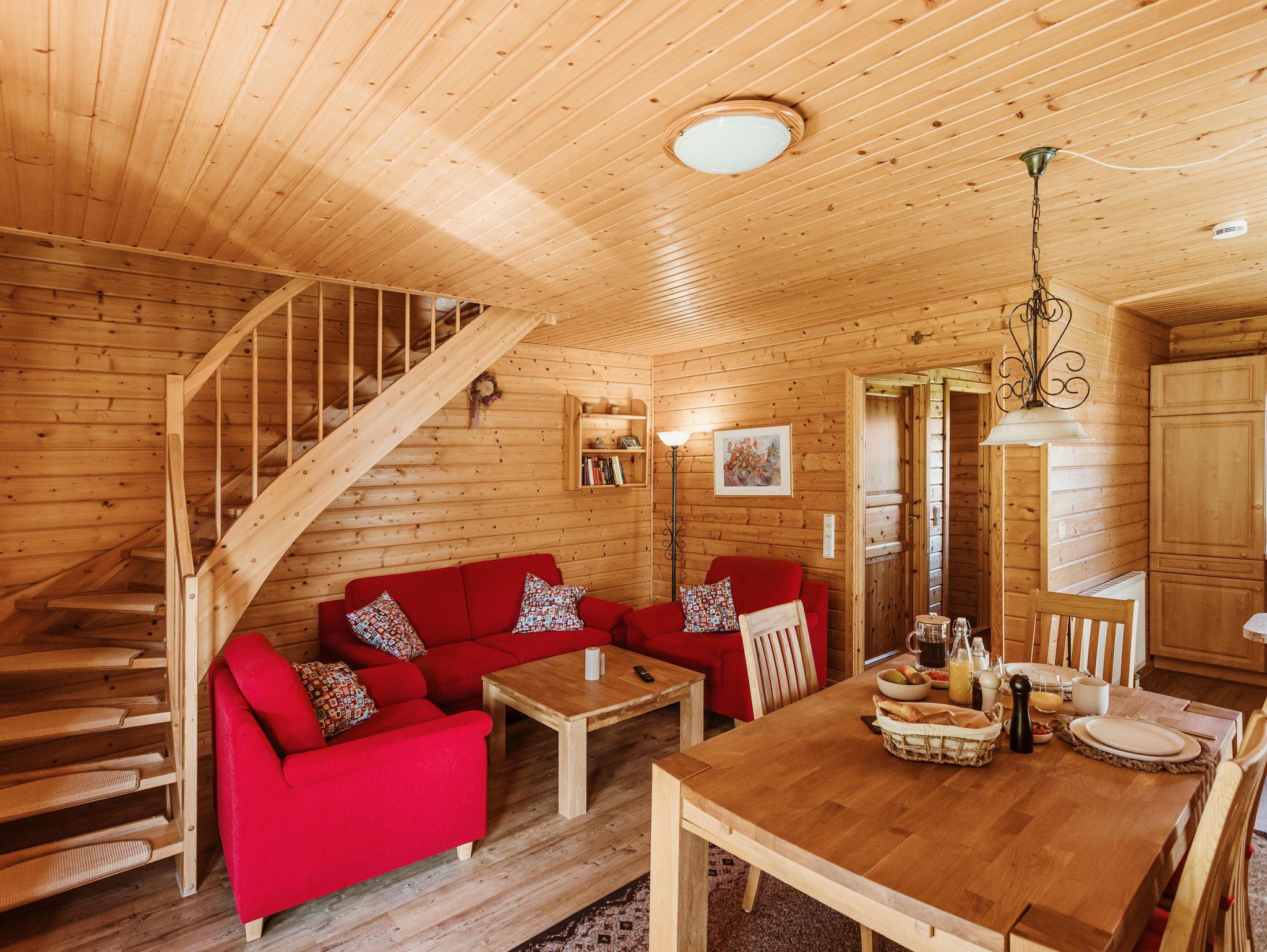 Die Doppelhaushälfte in Holzbauweise bietet auf rund 65 m² Wohnfläche Platz für bis zu fünf Personen. Im Erdgeschoss befinden sich ein Wohn- und Schlafbereich mit Couch, ein separater Essplatz, SAT-Flachbild-TV, HiFi-Anlage, eine voll ausgestattete Kochnische mit Geschirrspüler und Mikrowelle, ein Abstellraum sowie ein Gäste-WC.