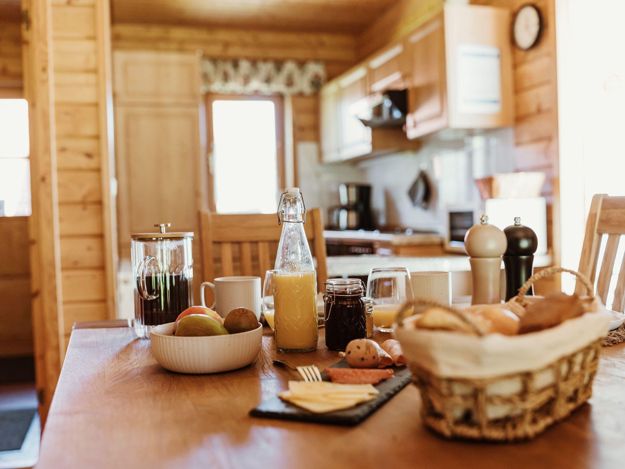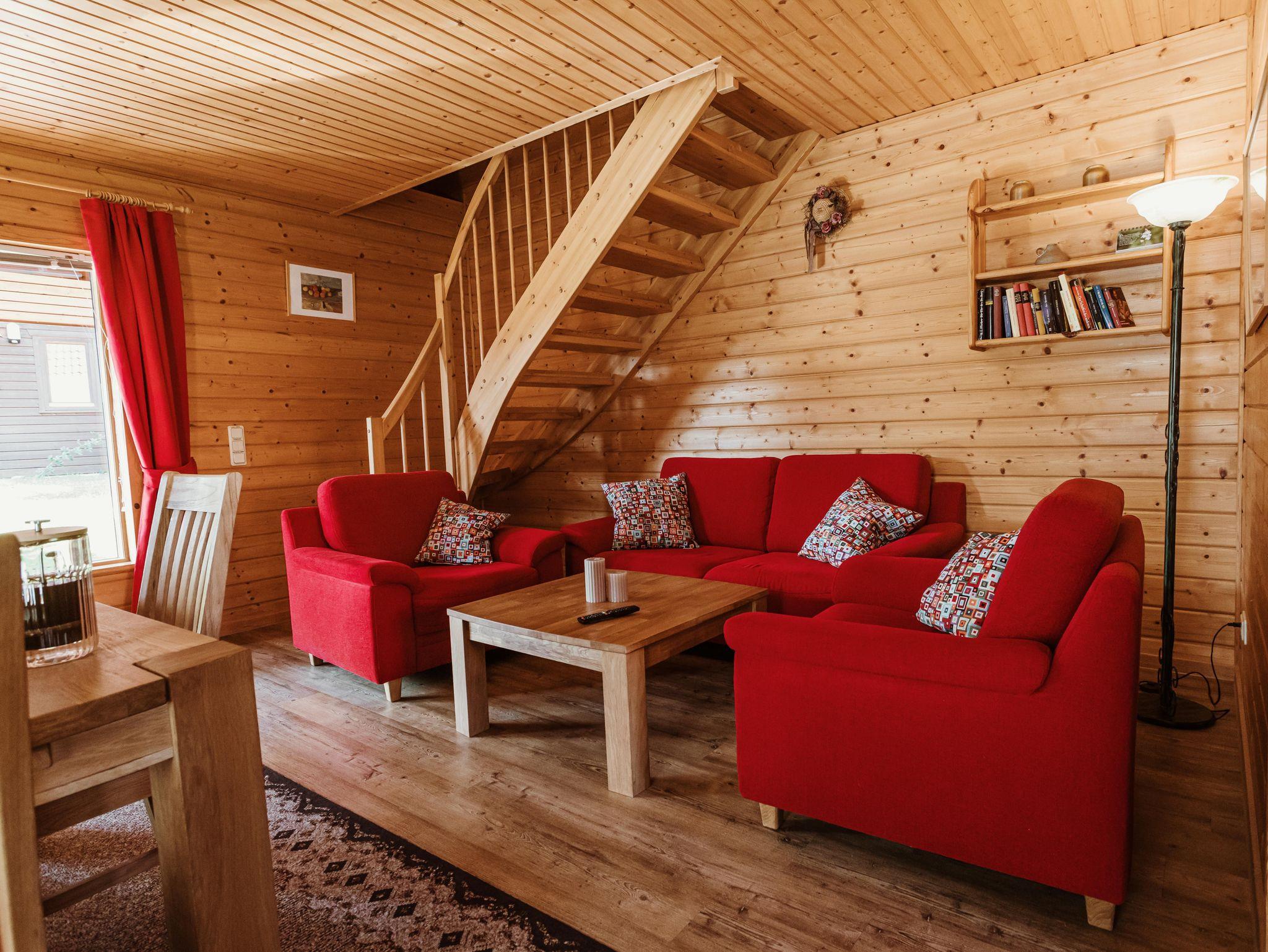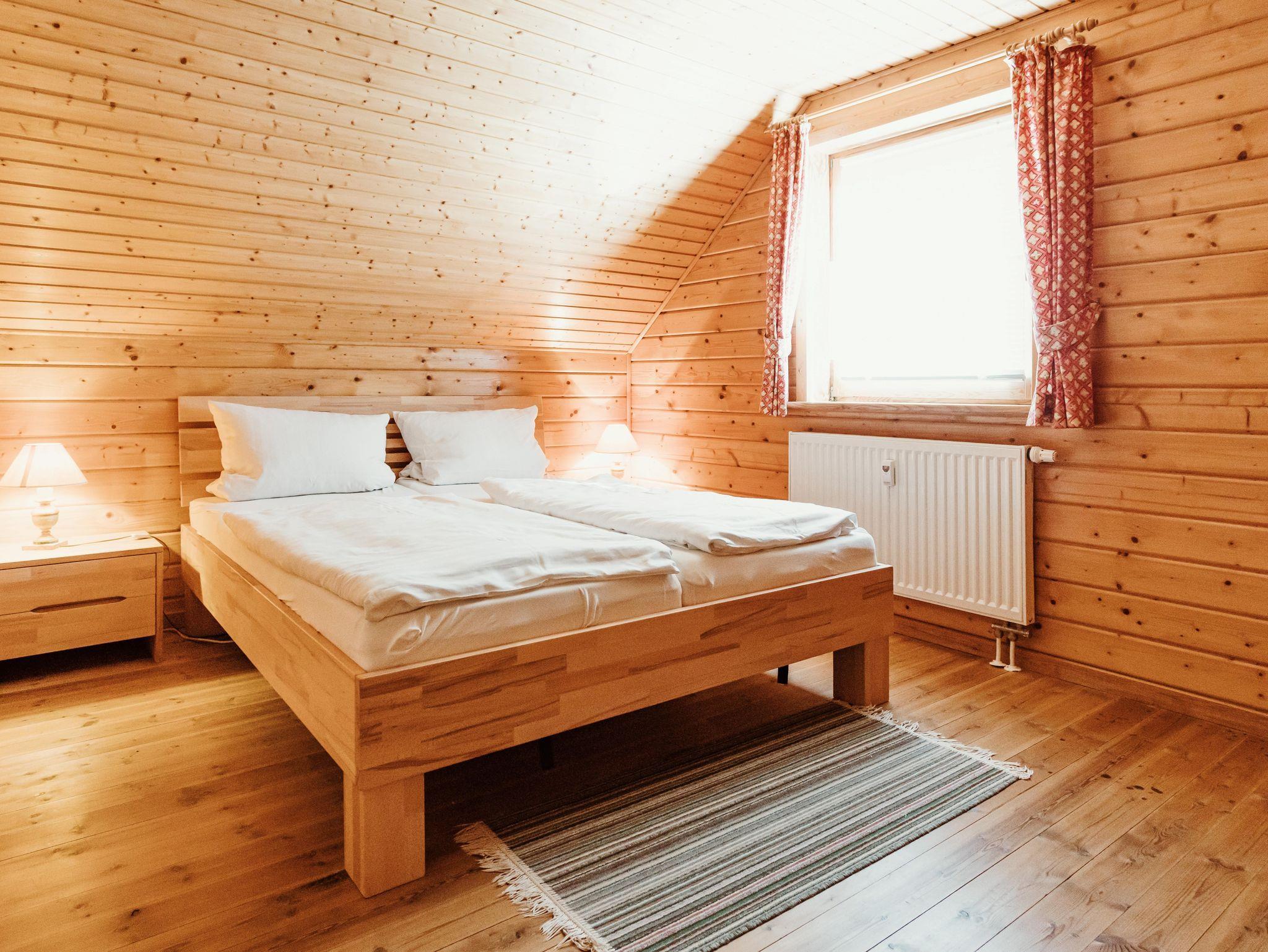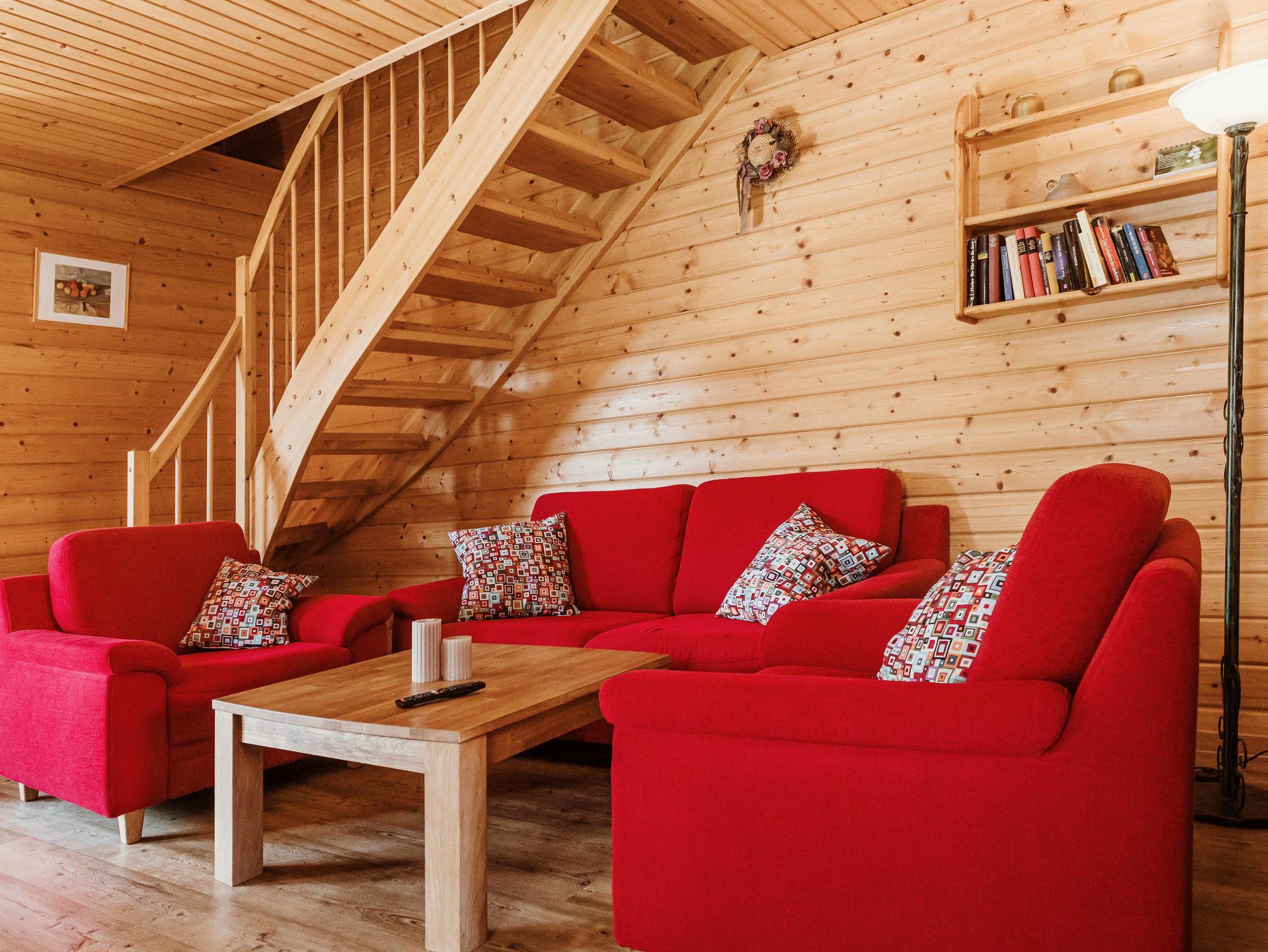 Die Doppelhaushälfte in Holzbauweise bietet auf rund 65 m² Wohnfläche Platz für bis zu fünf Personen. Im Erdgeschoss befinden sich ein Wohn- und Schlafbereich mit Couch, ein separater Essplatz, SAT-Flachbild-TV, HiFi-Anlage, eine voll ausgestattete Kochnische mit Geschirrspüler und Mikrowelle, ein Abstellraum sowie ein Gäste-WC.